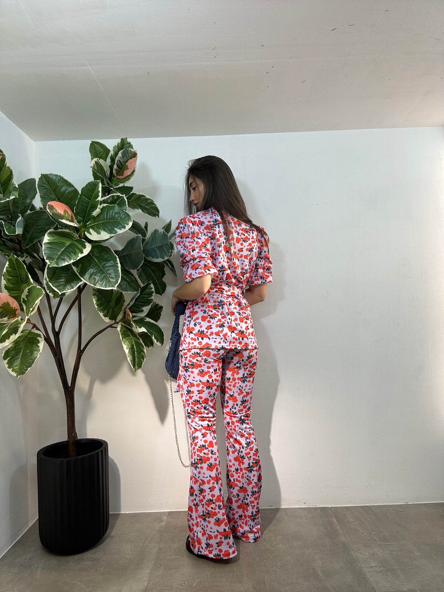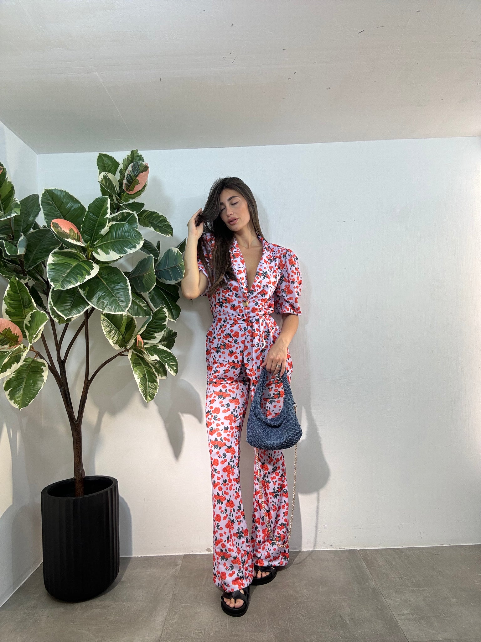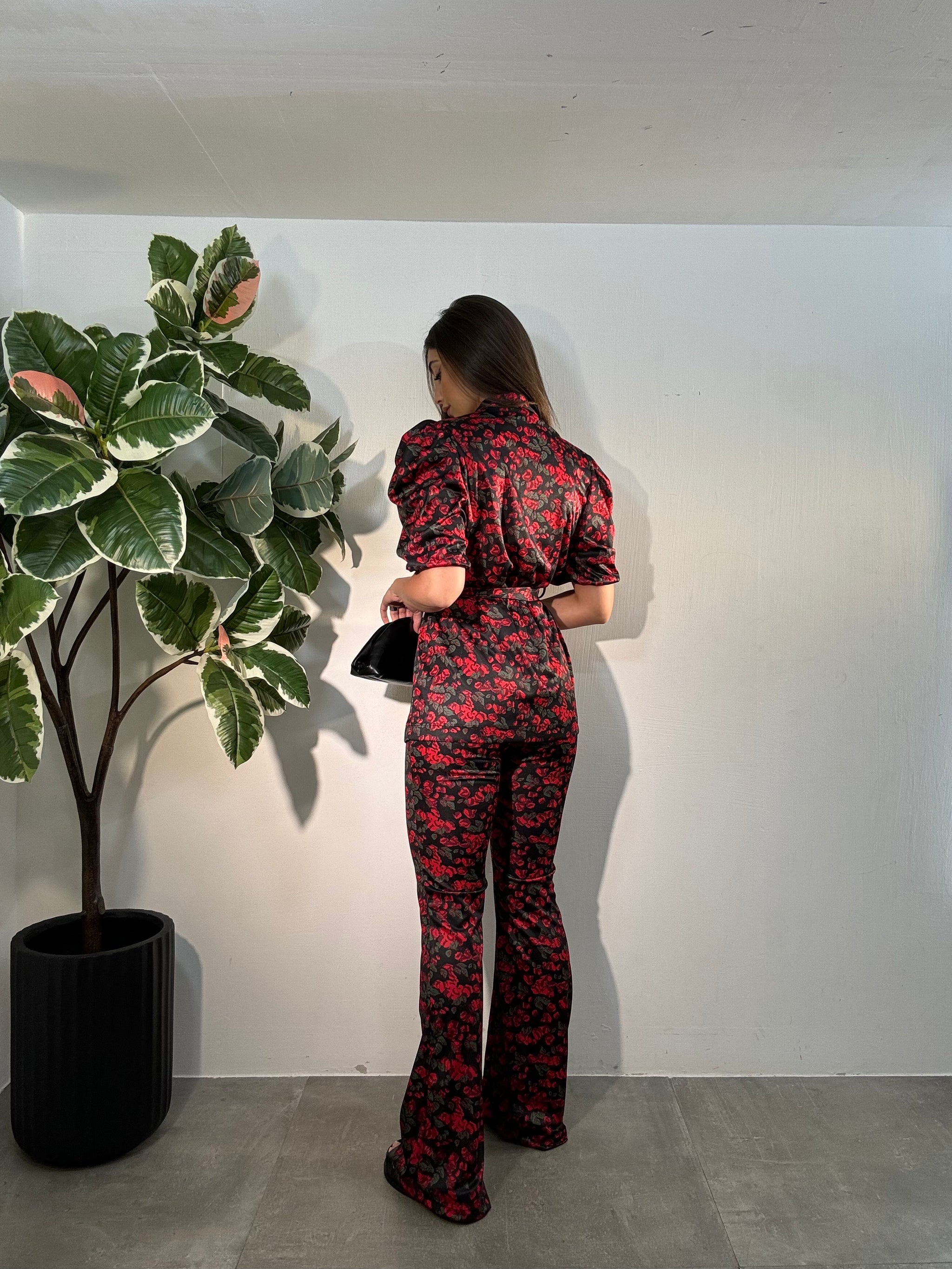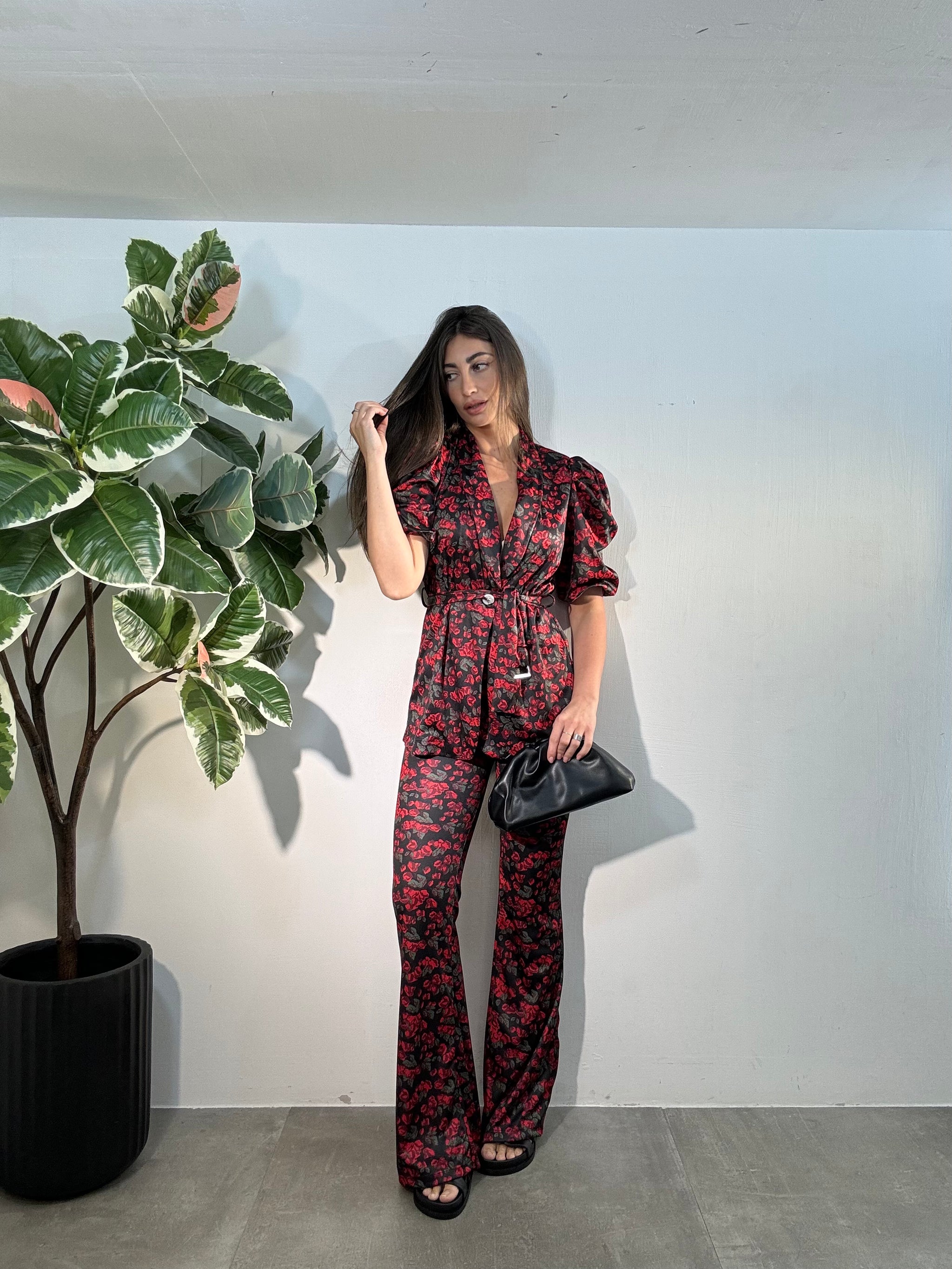 Completo in tessuto lycra elastica, pantalone modello a zampa, giacca con cintura in vita, mezza manica ballon, vestibilità perfetta