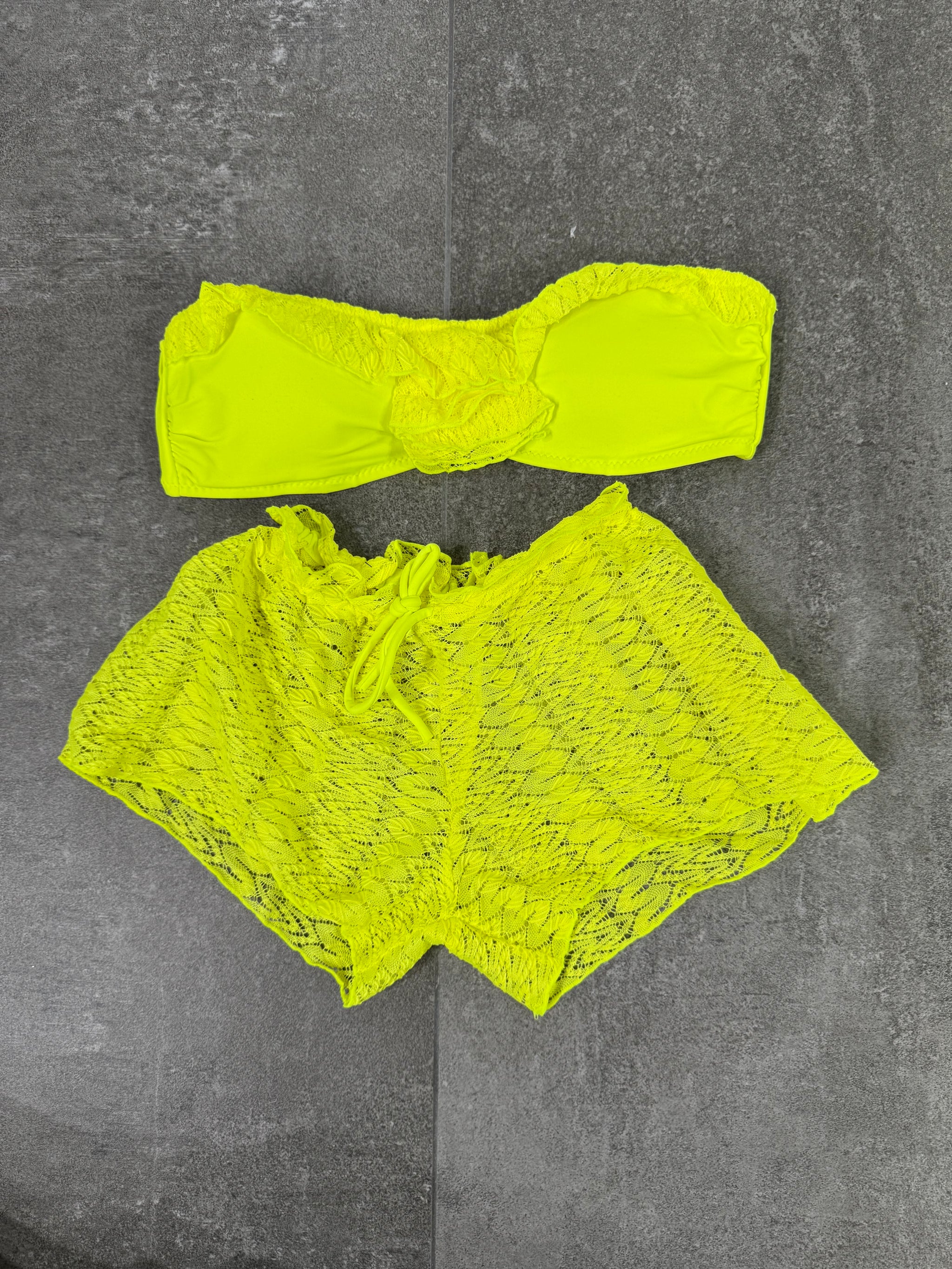 Costume tre pezzi composto da parte superiore a fascia con coppe preformate, si attacca sul retro, bretella regolabile, slip a perizoma non regolabile, inserti di filo, pantaloncino di filo abbinato.