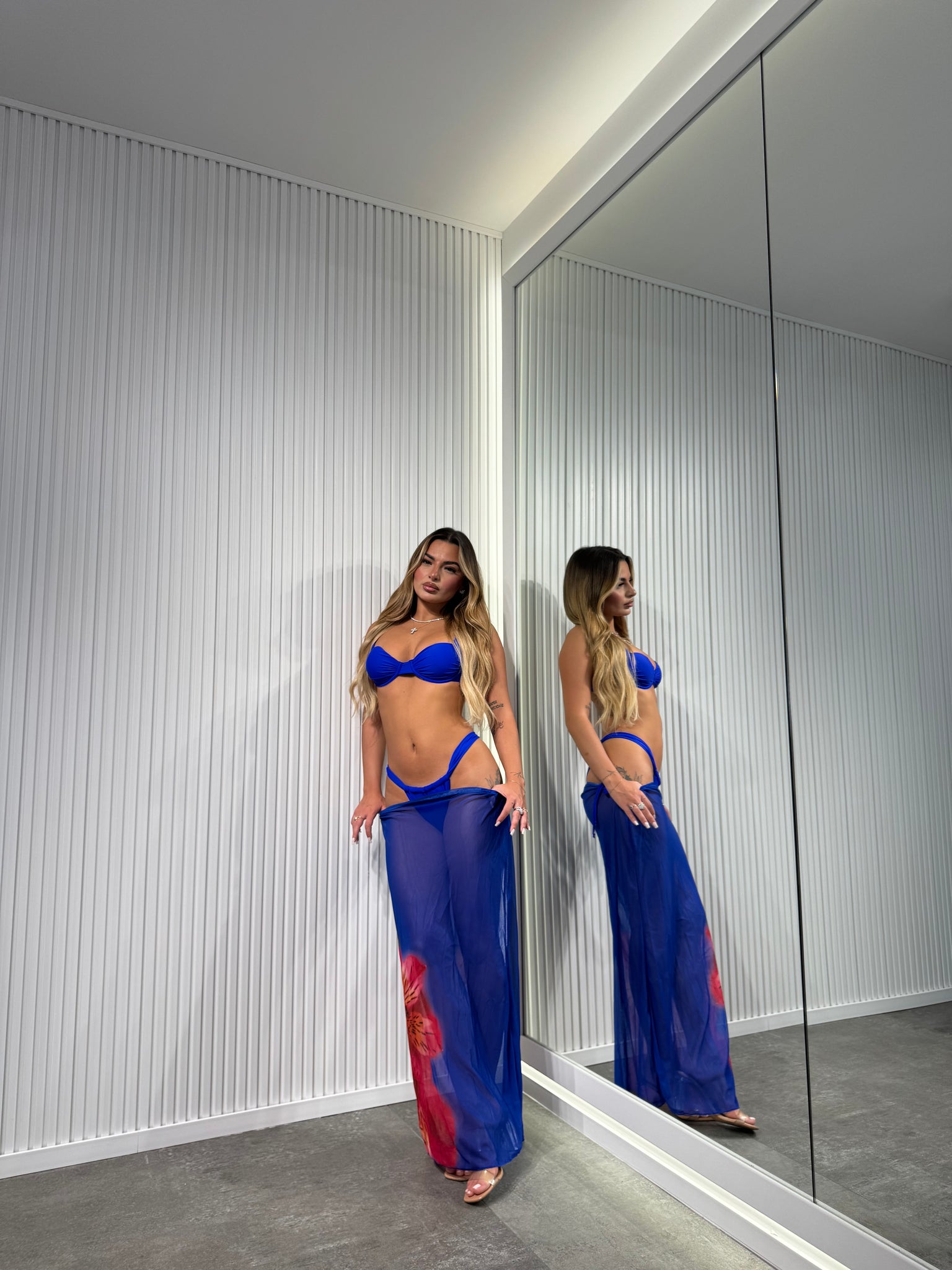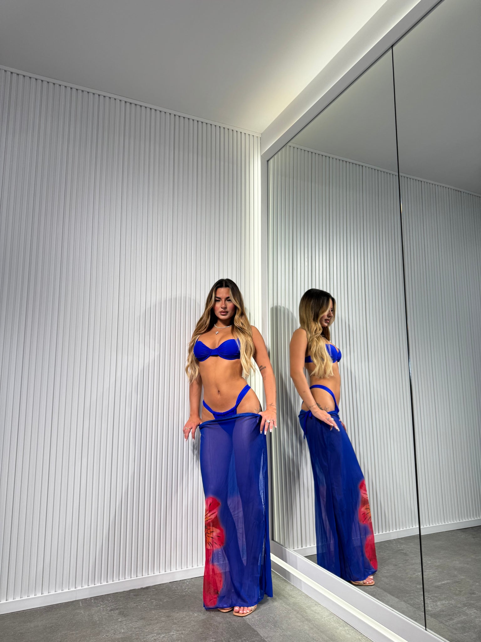 Costume tre pezzi composto da parte superiore con coppette e lacci regolabili, slip regolabile, gonna velata con stampa fiore.