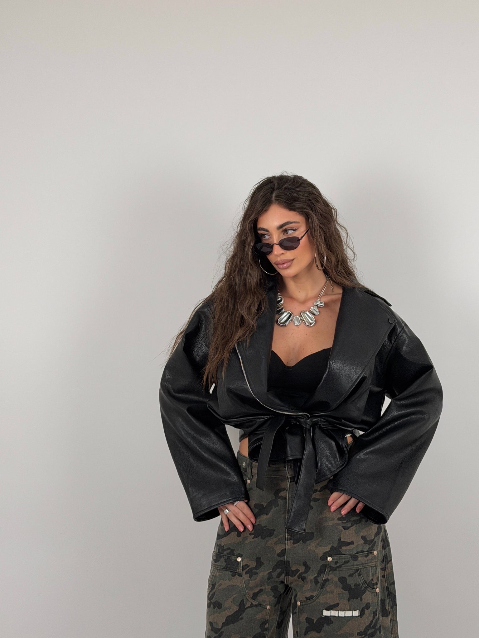 Giacca in ecopelle foderata all’interno, zip laterale, cintura in vita.