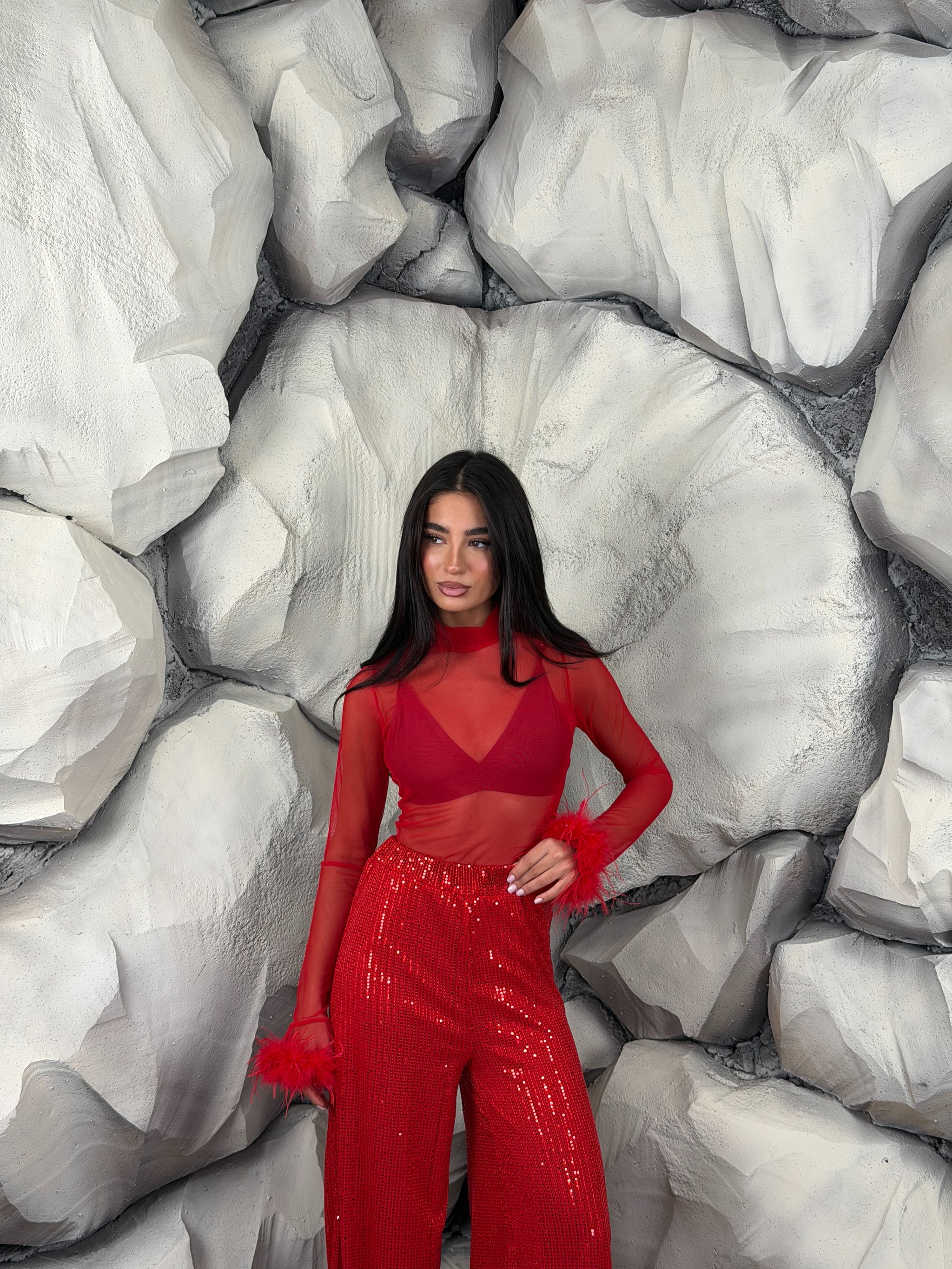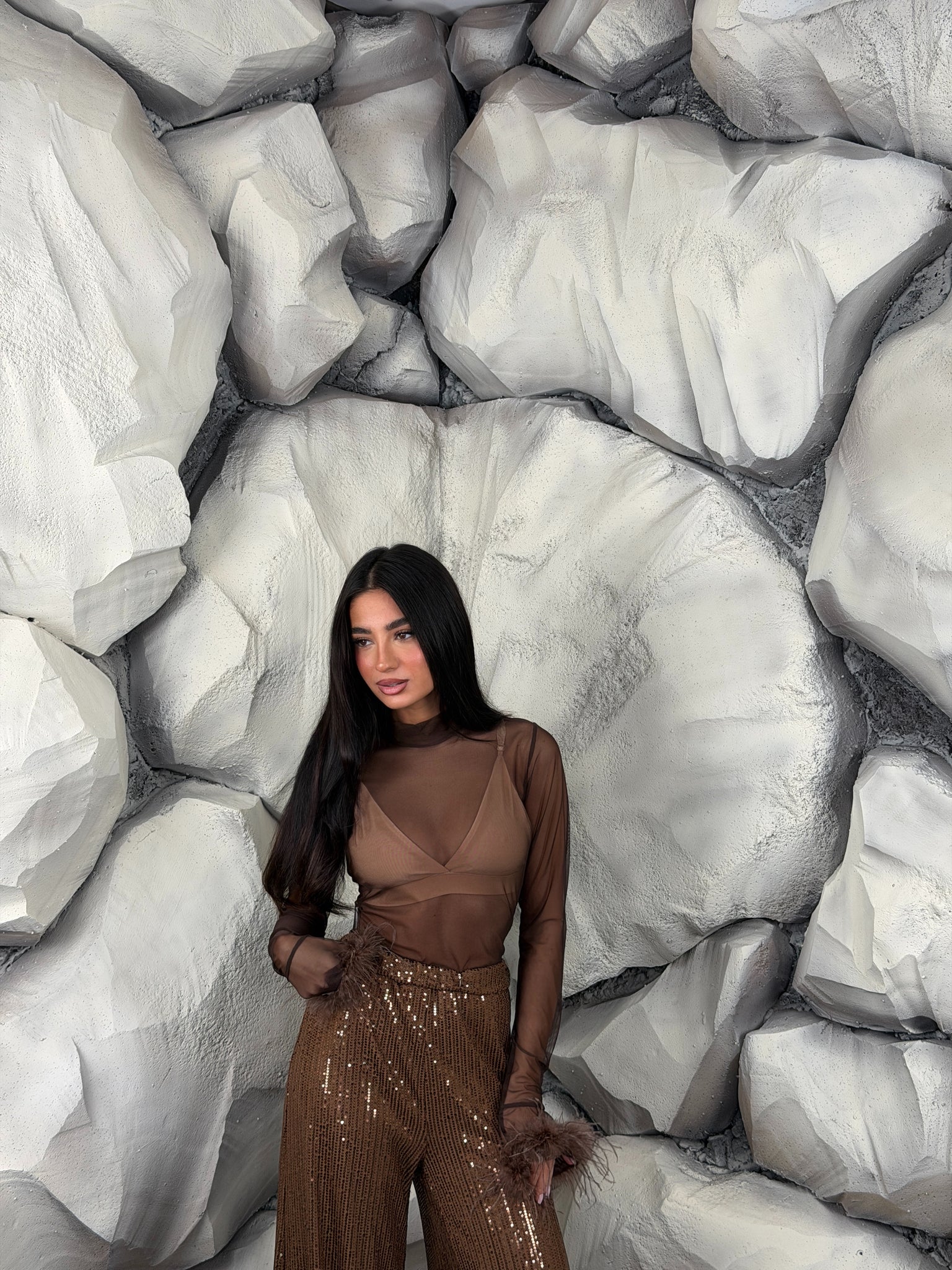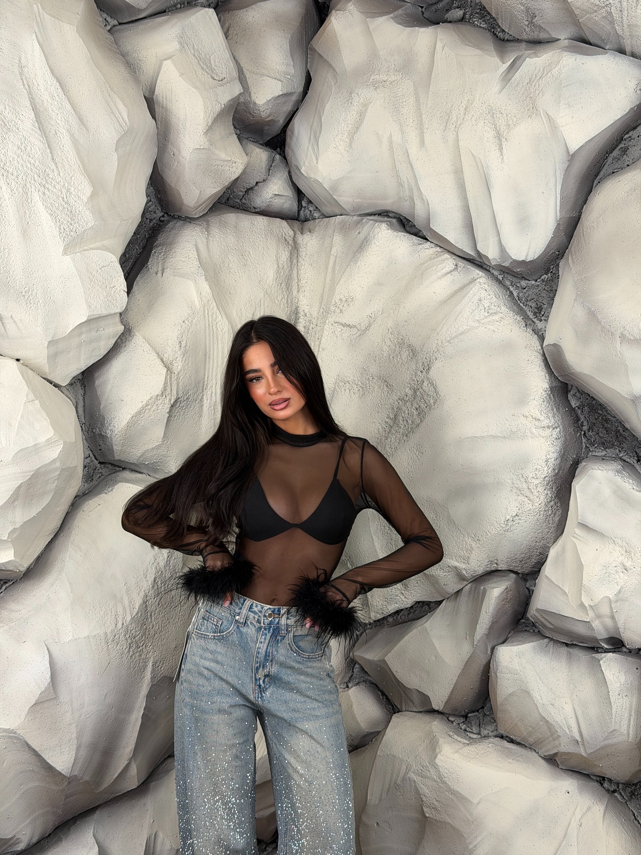 Maglia di velo con colletto e manica lunga con piumette sul finale.