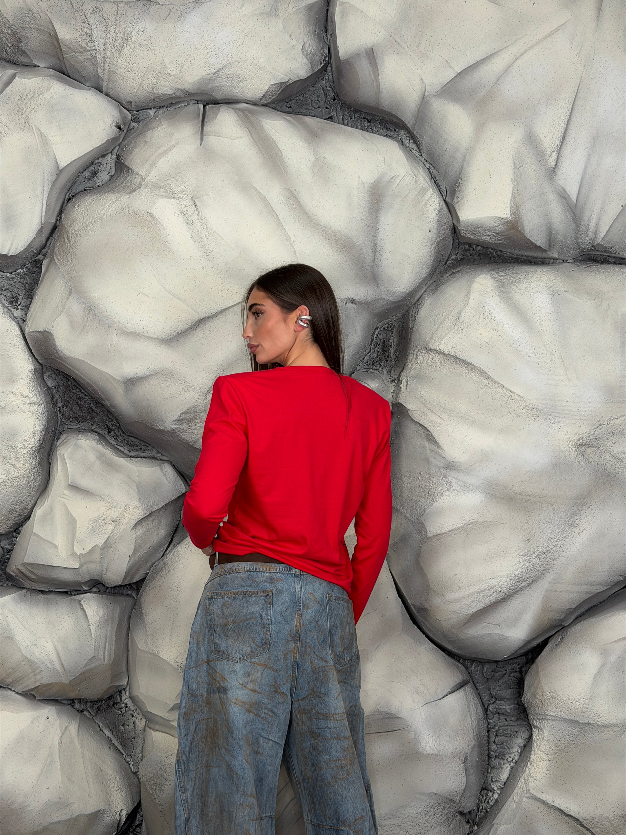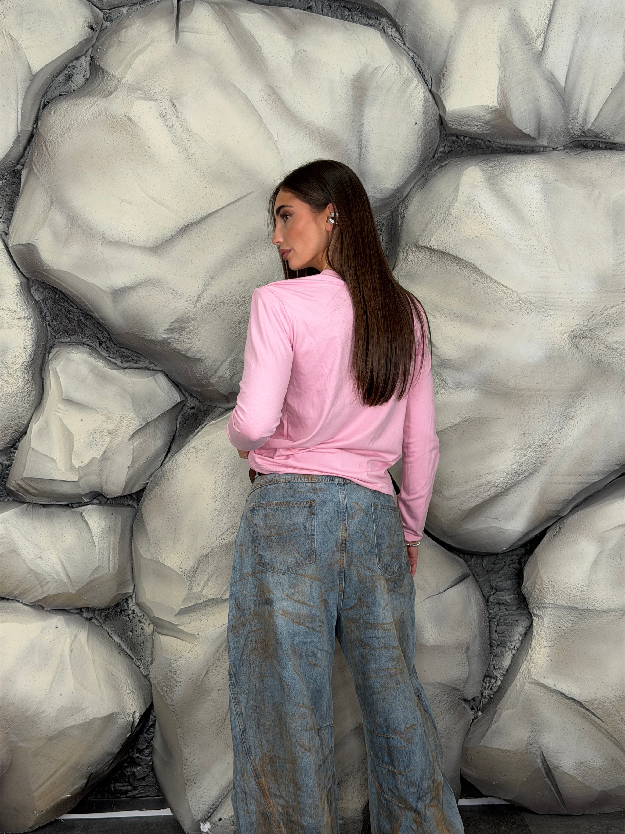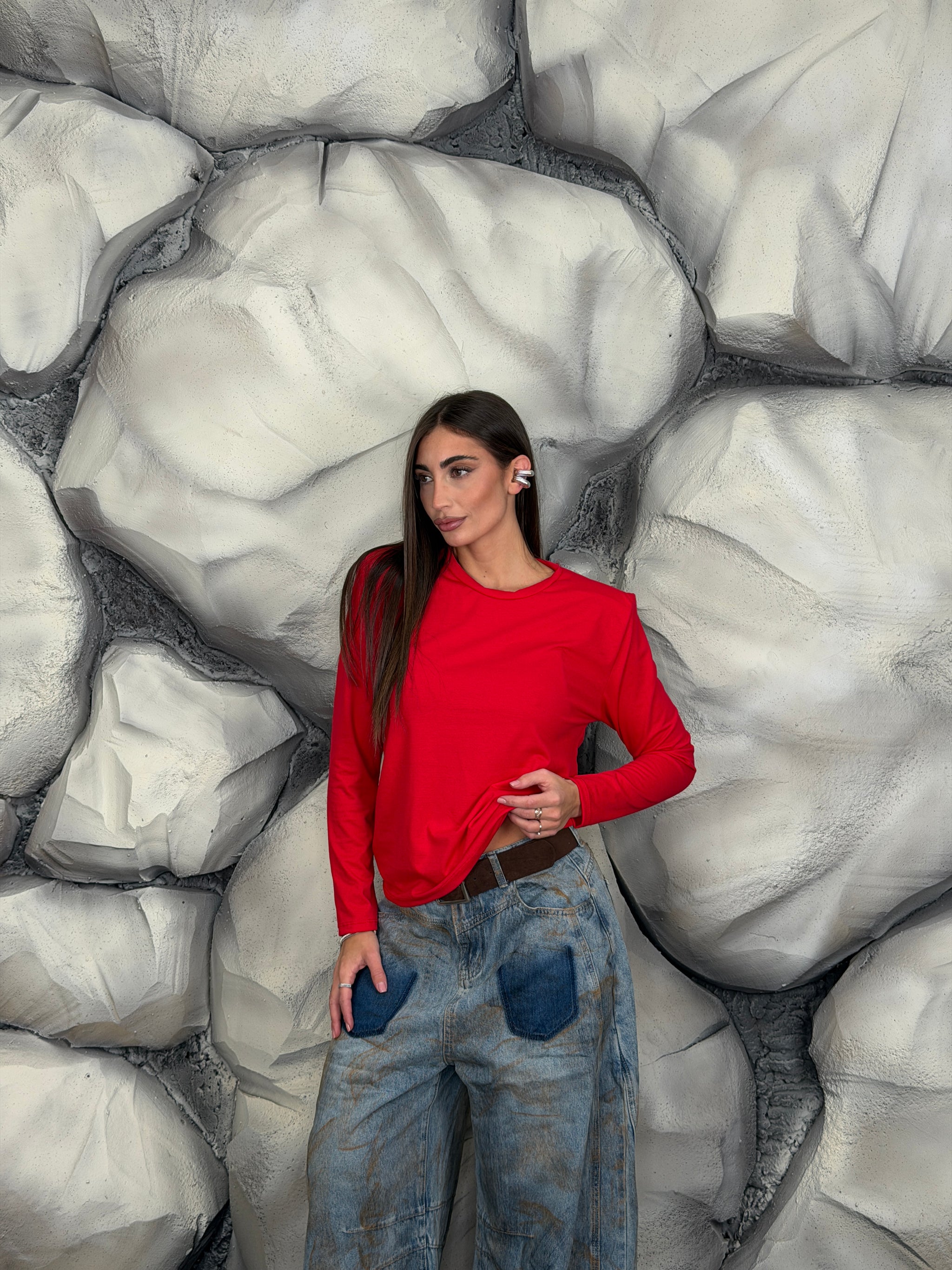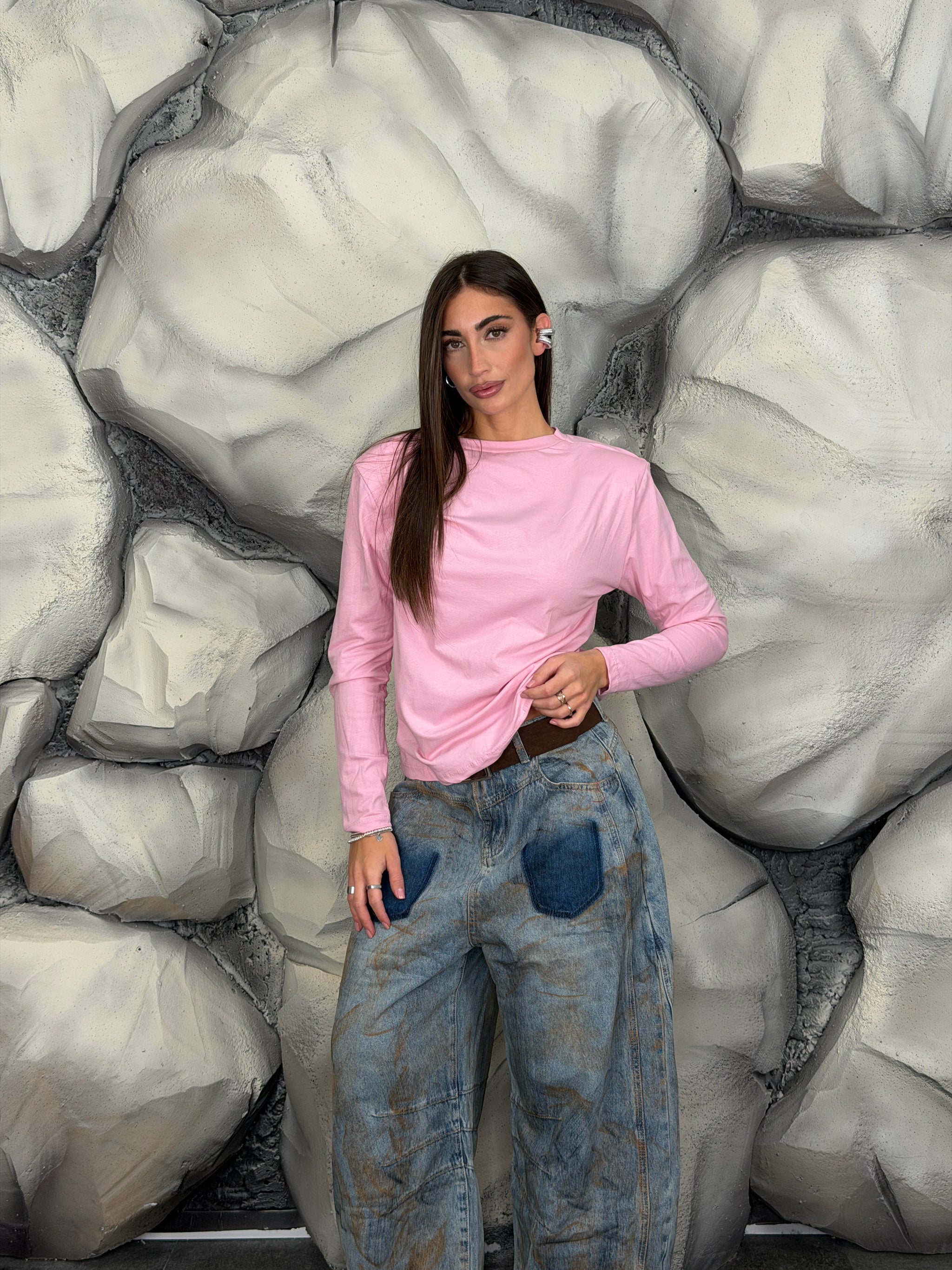 Maglia girocollo di cotone manica lunga e spalline preformate.