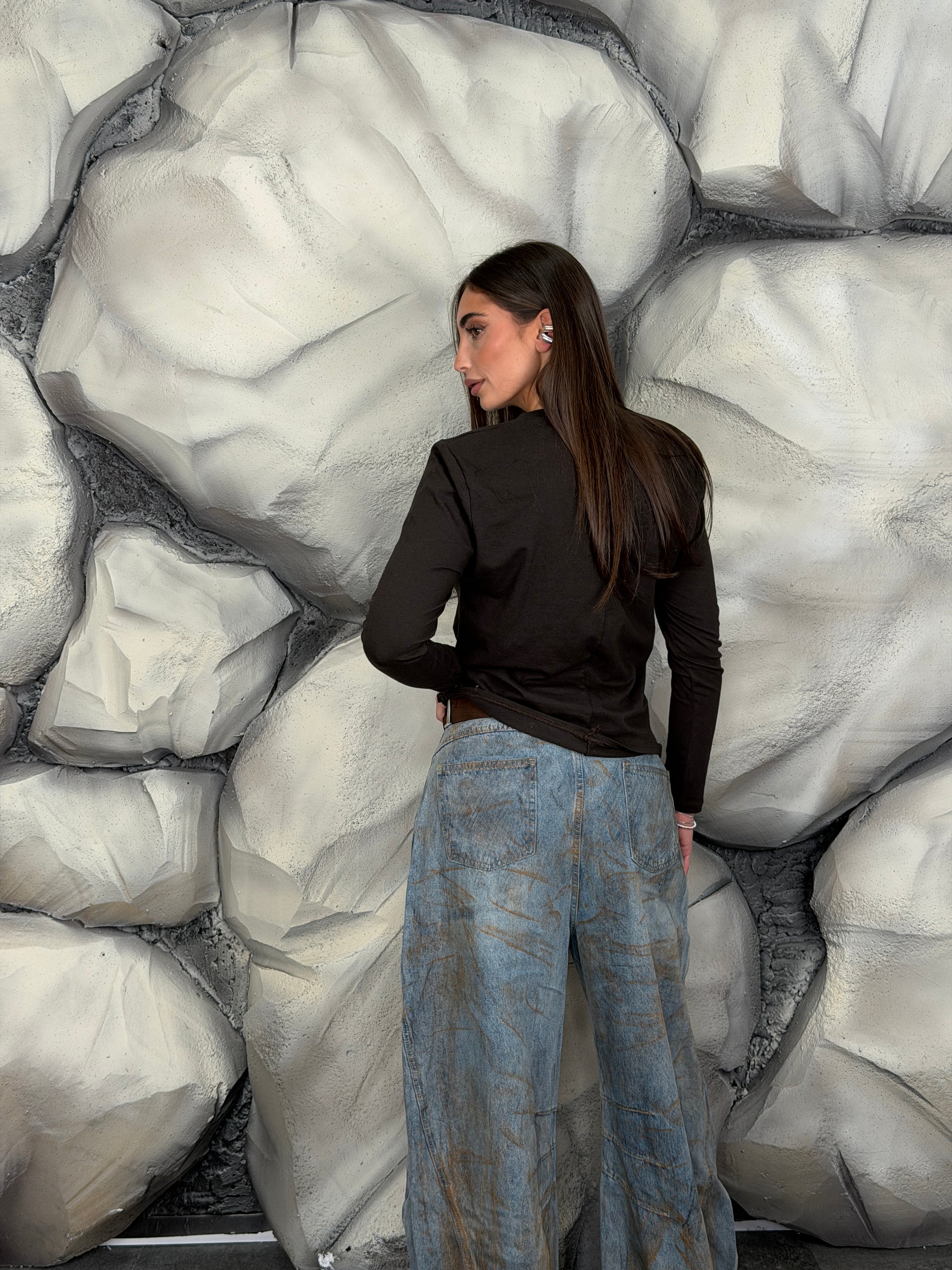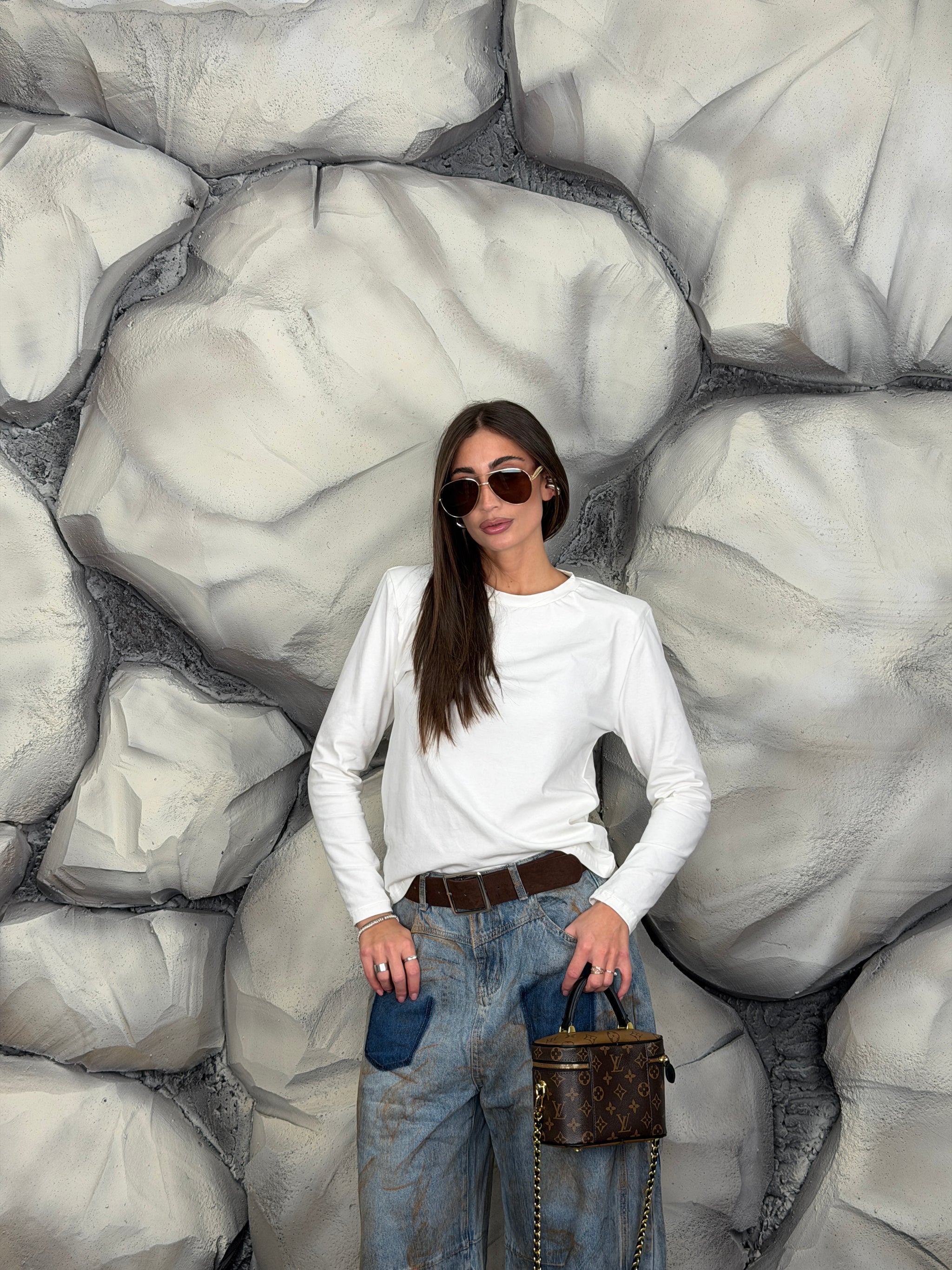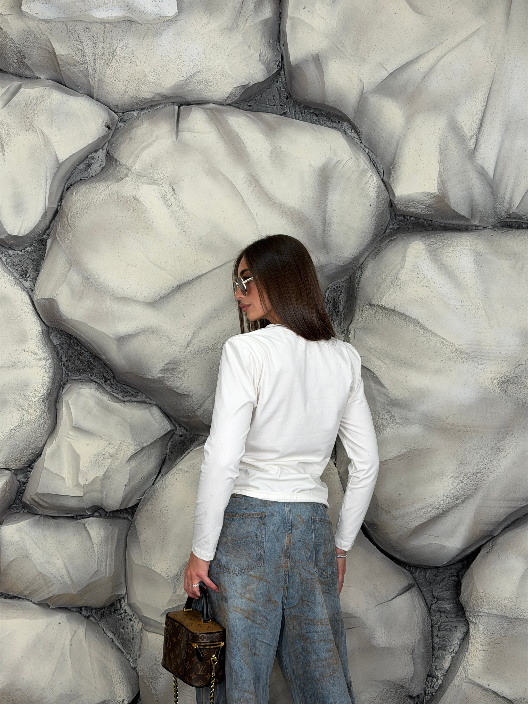 Maglia girocollo di cotone manica lunga e spalline preformate.