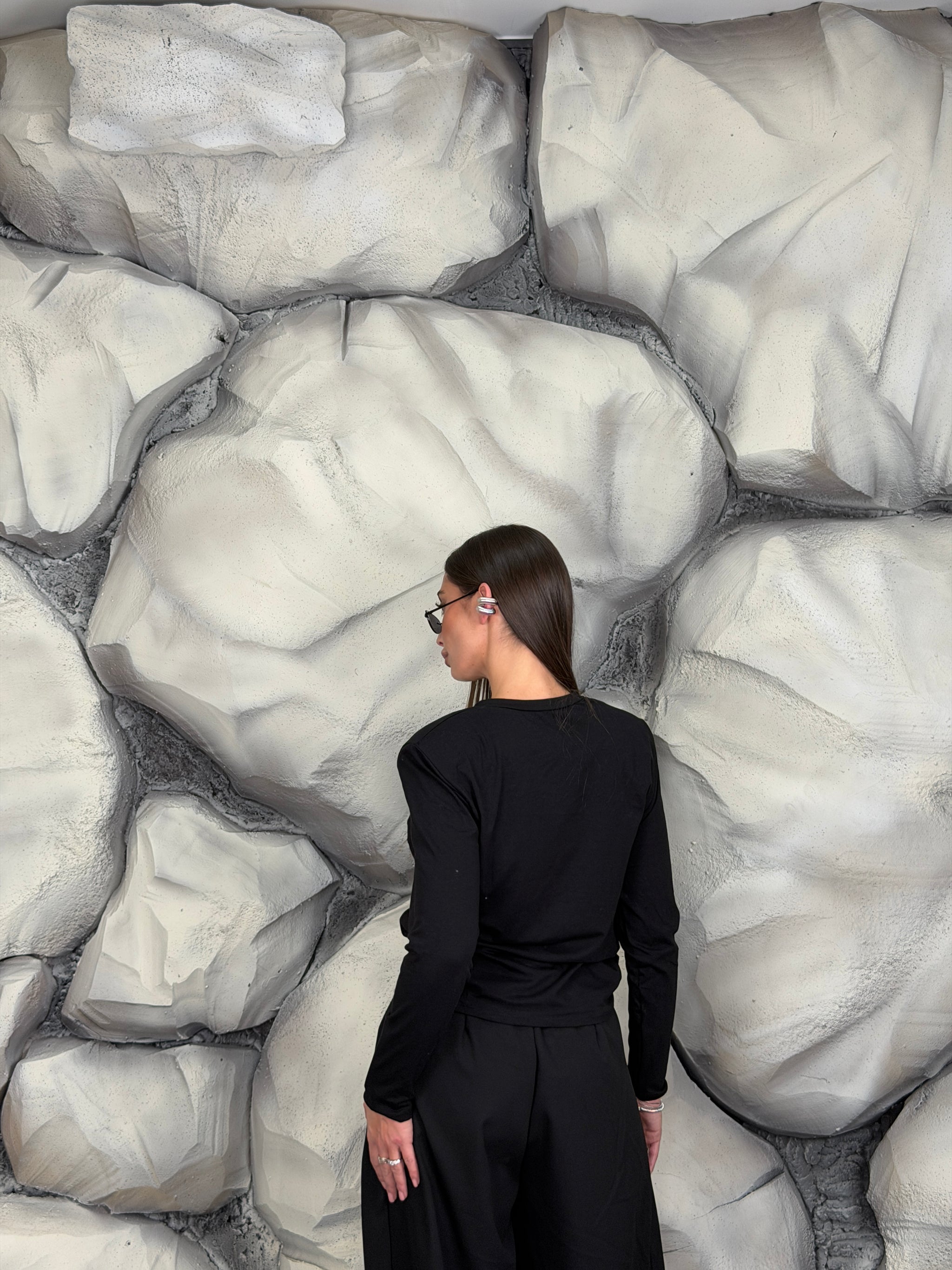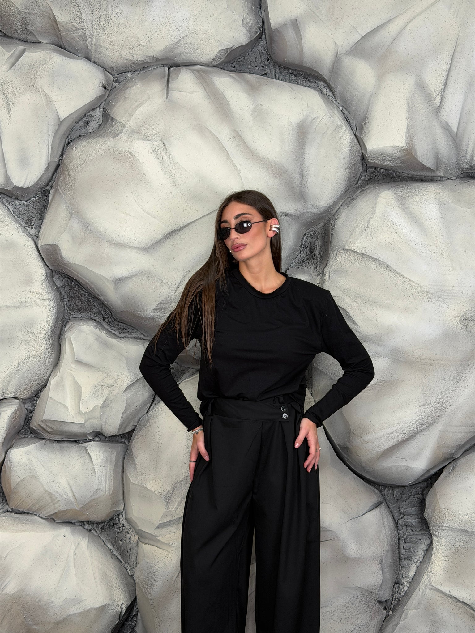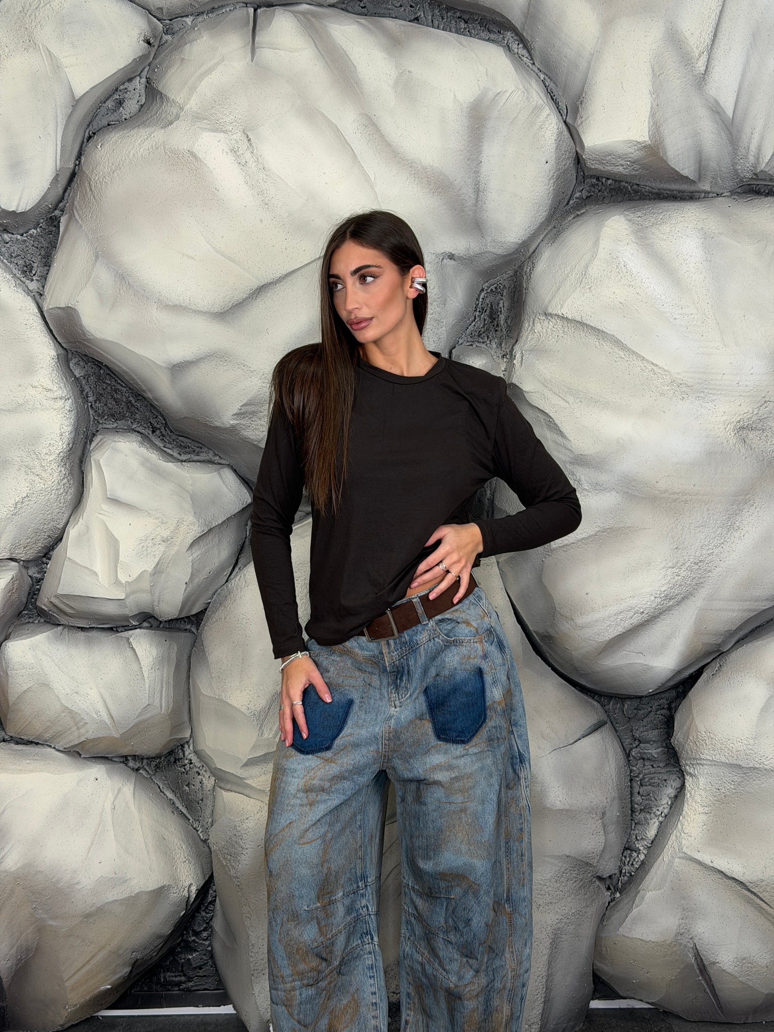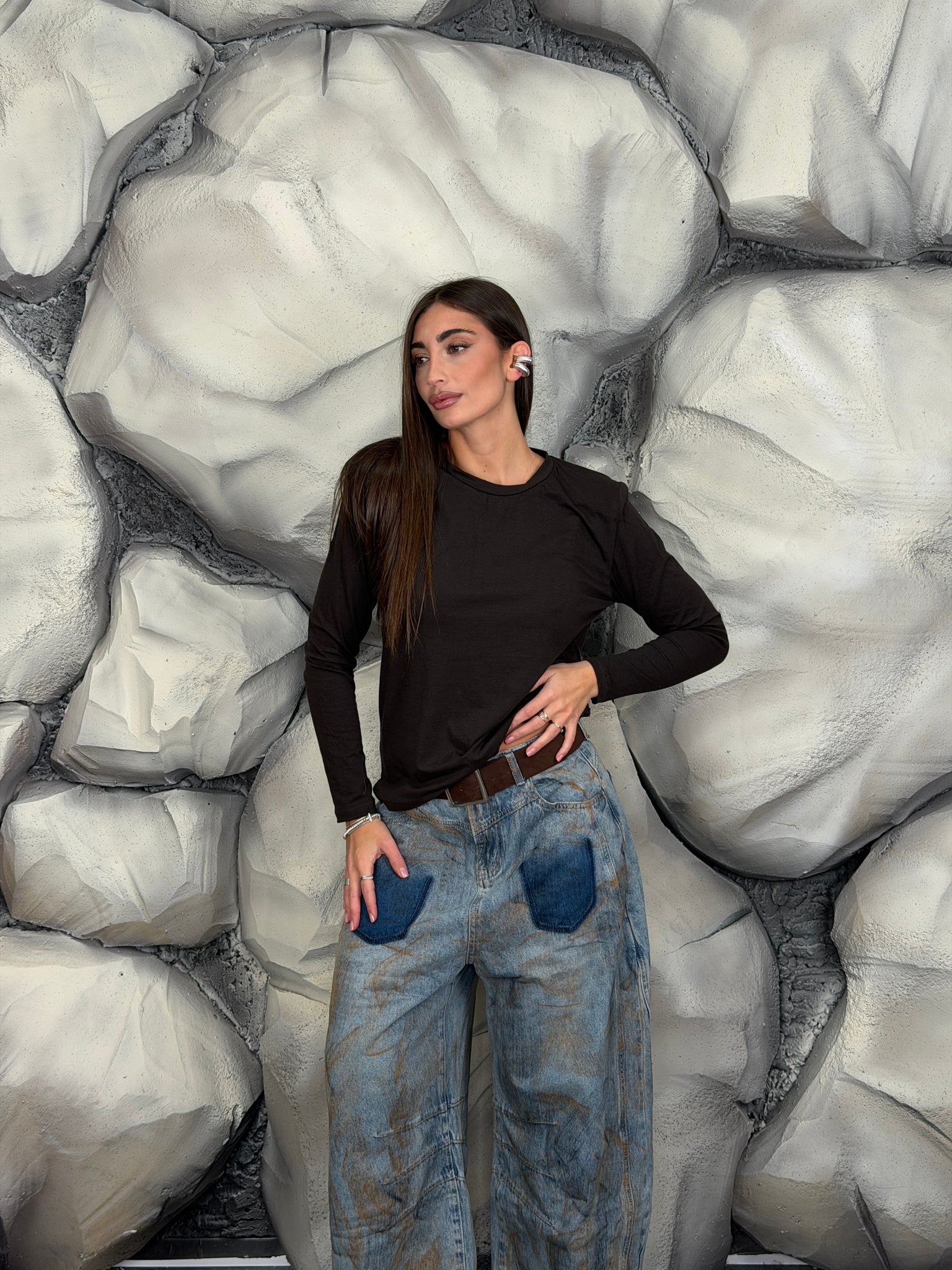 Maglia girocollo di cotone manica lunga e spalline preformate.