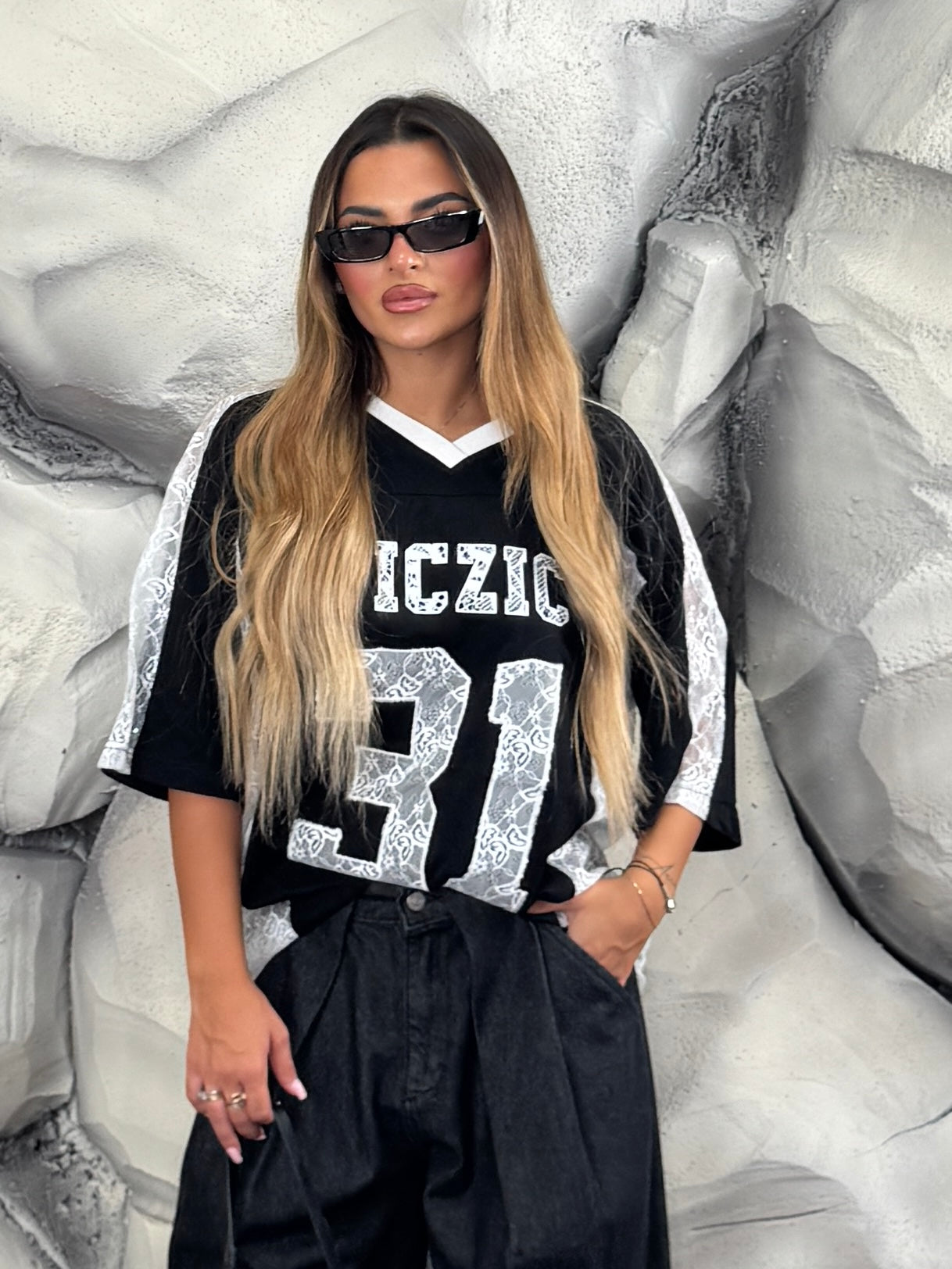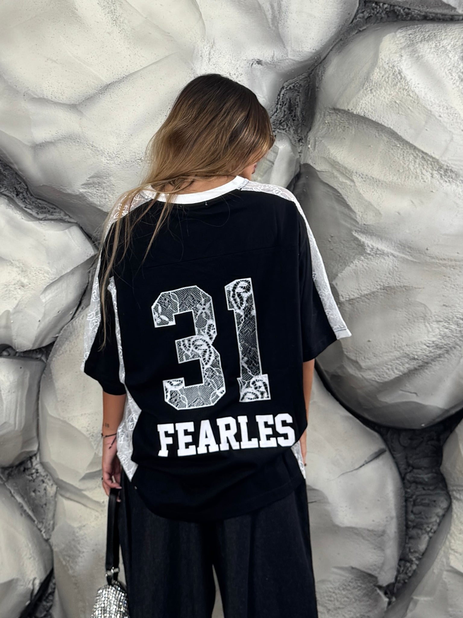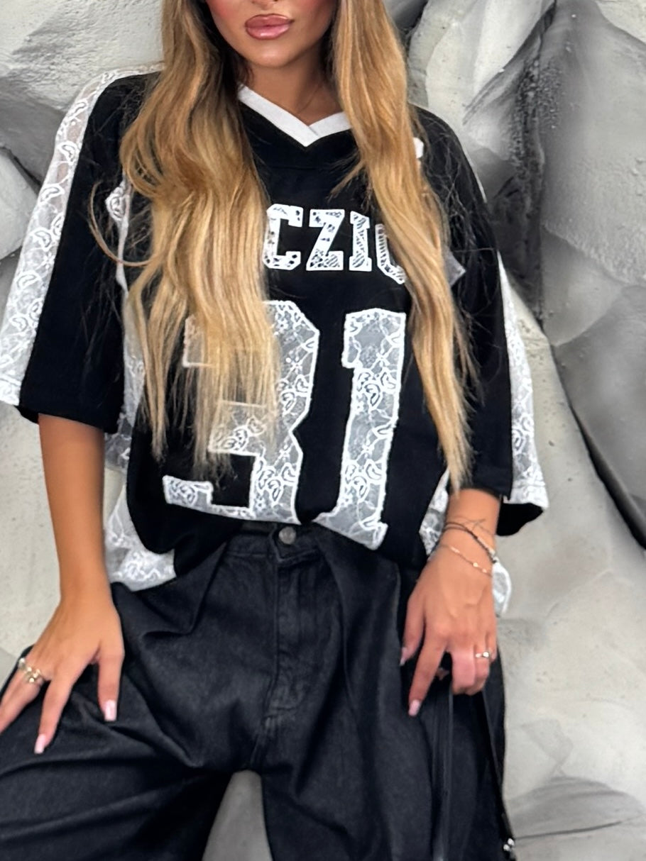 Maglia di tessuto con inserti di merletto, scollo a “V”, dettaglio scritte sul davanti e sul retro.