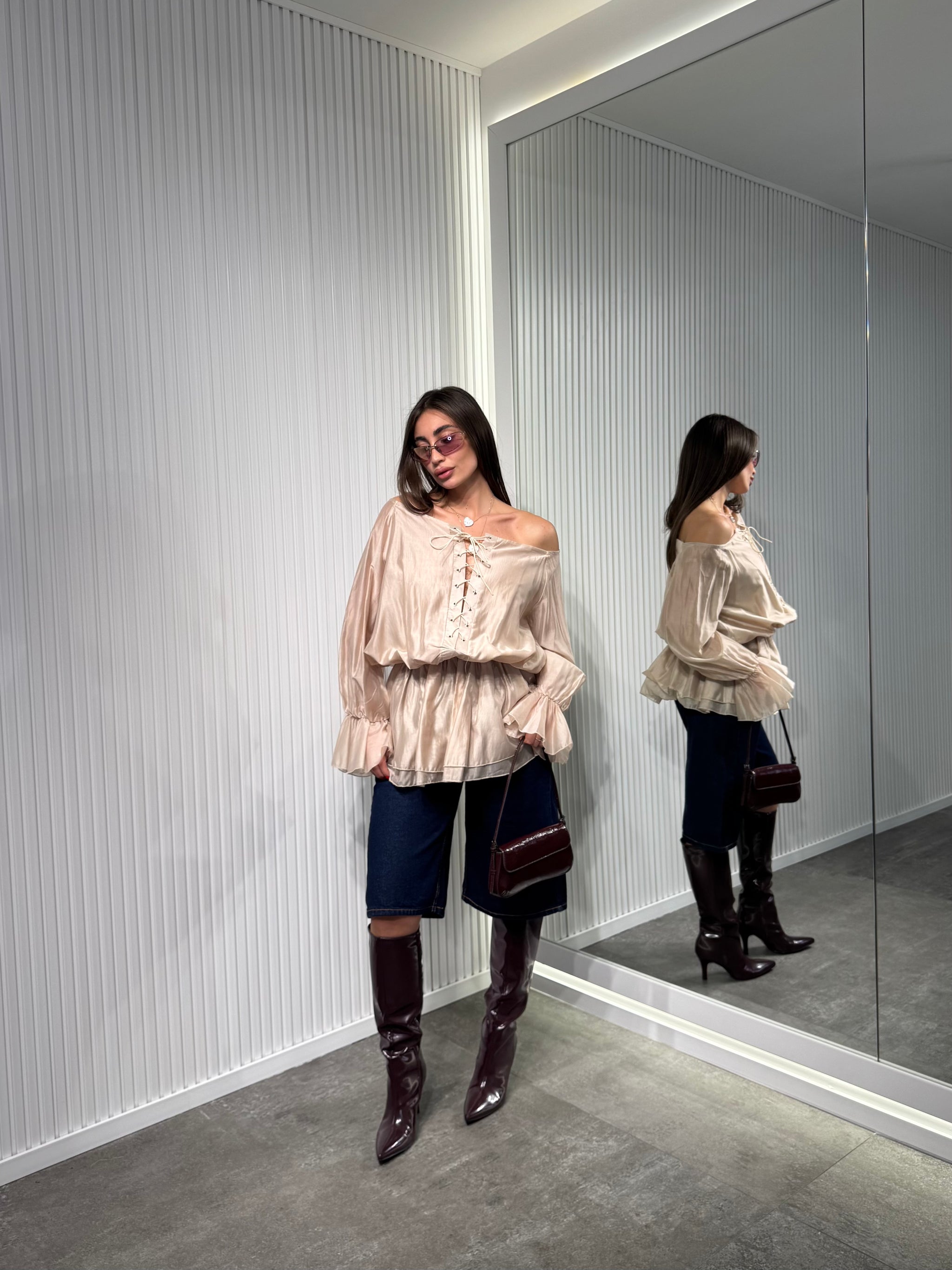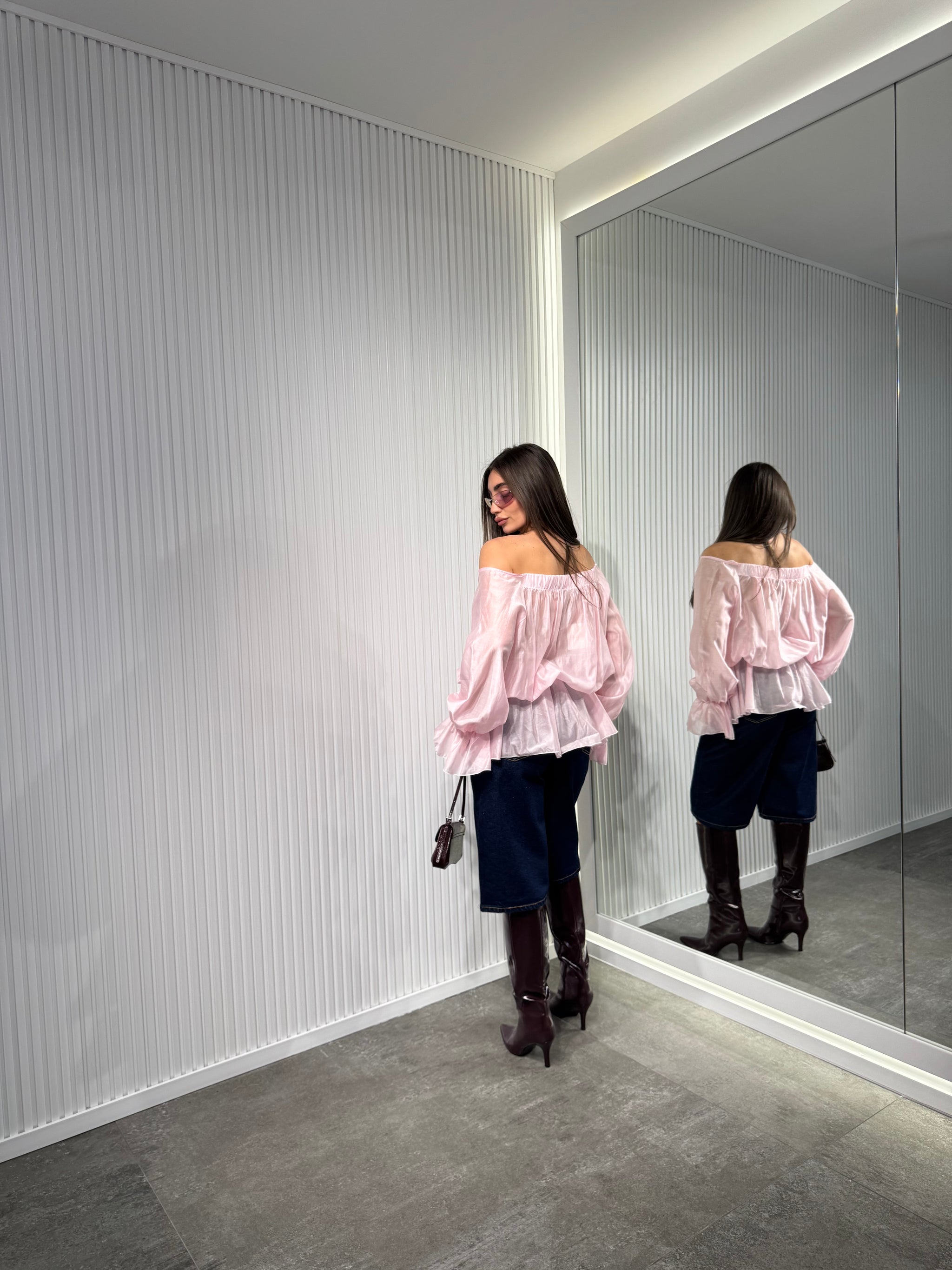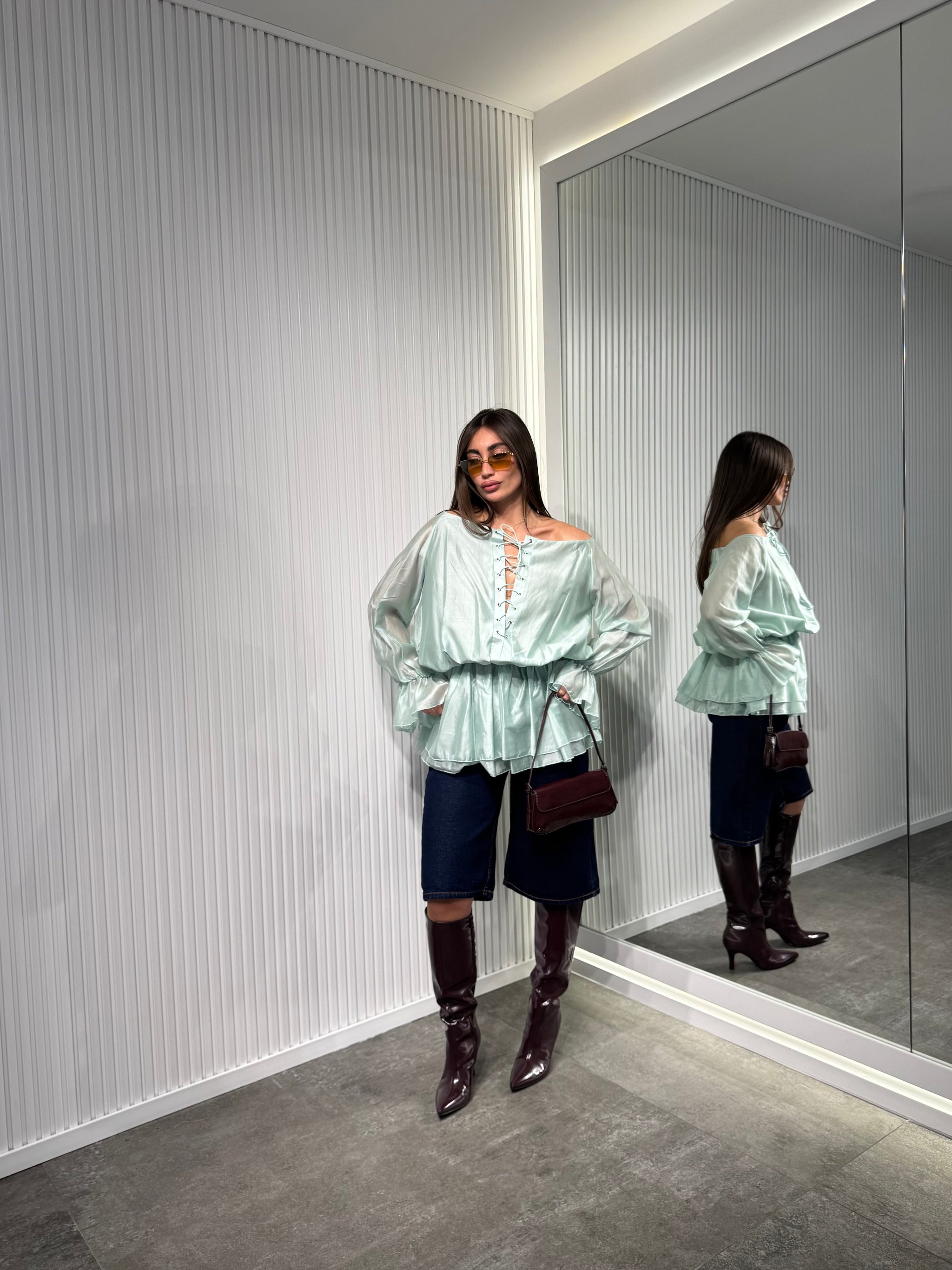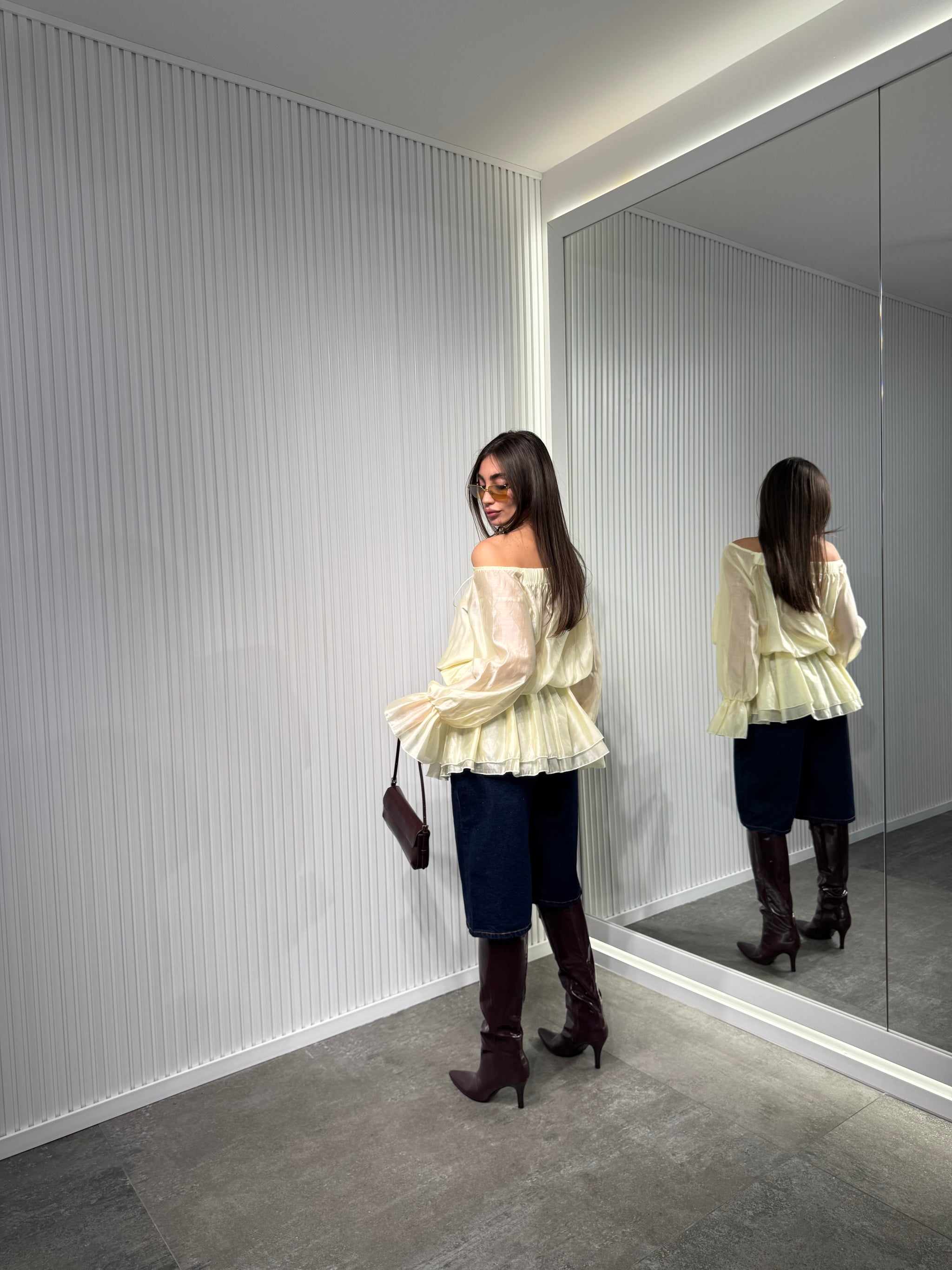 Maglia in tessuto chiffon, manica lunga ballon, con scollo particolare