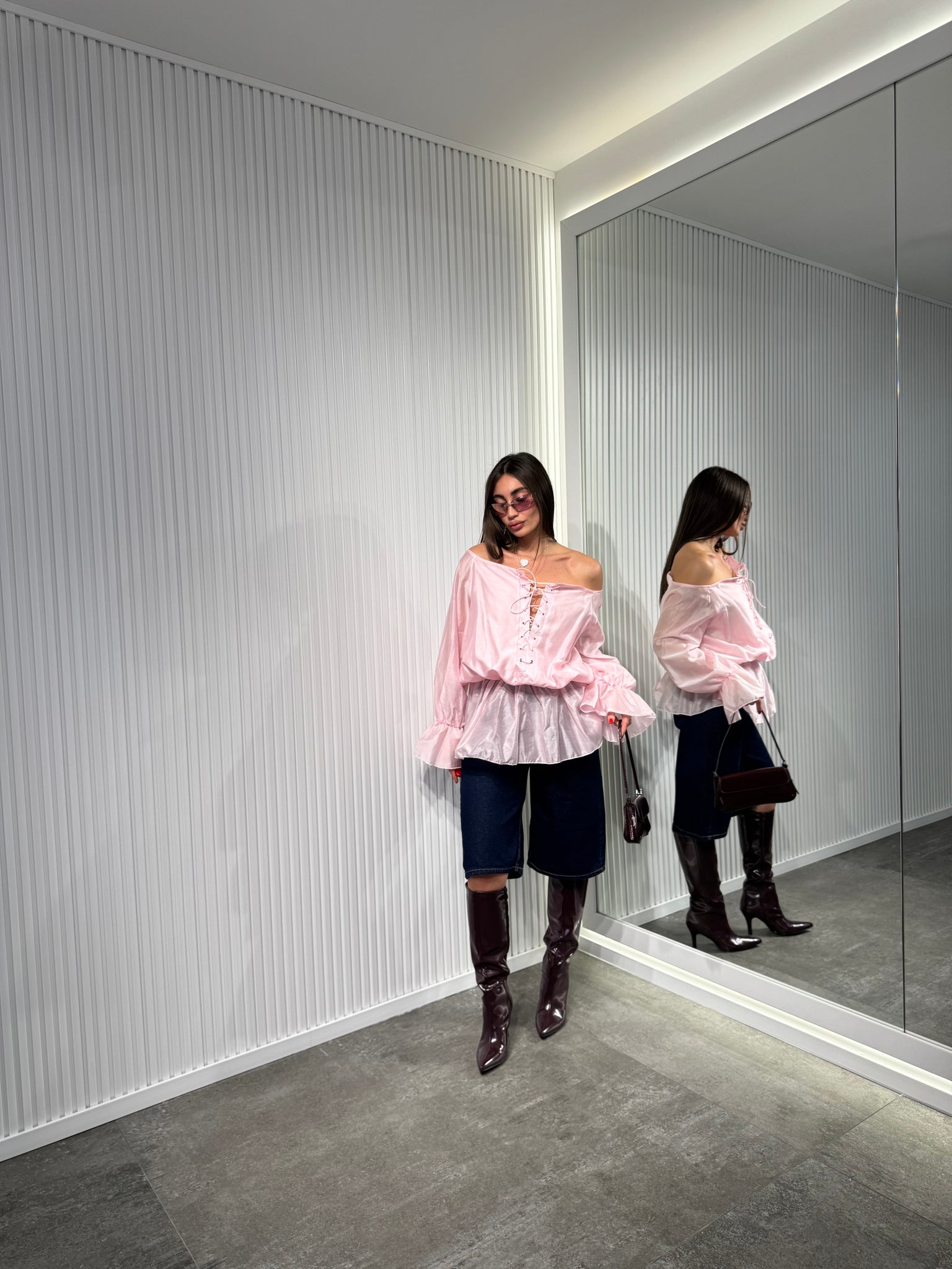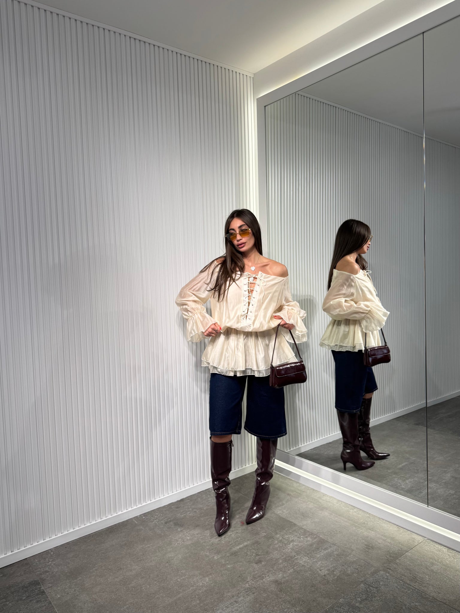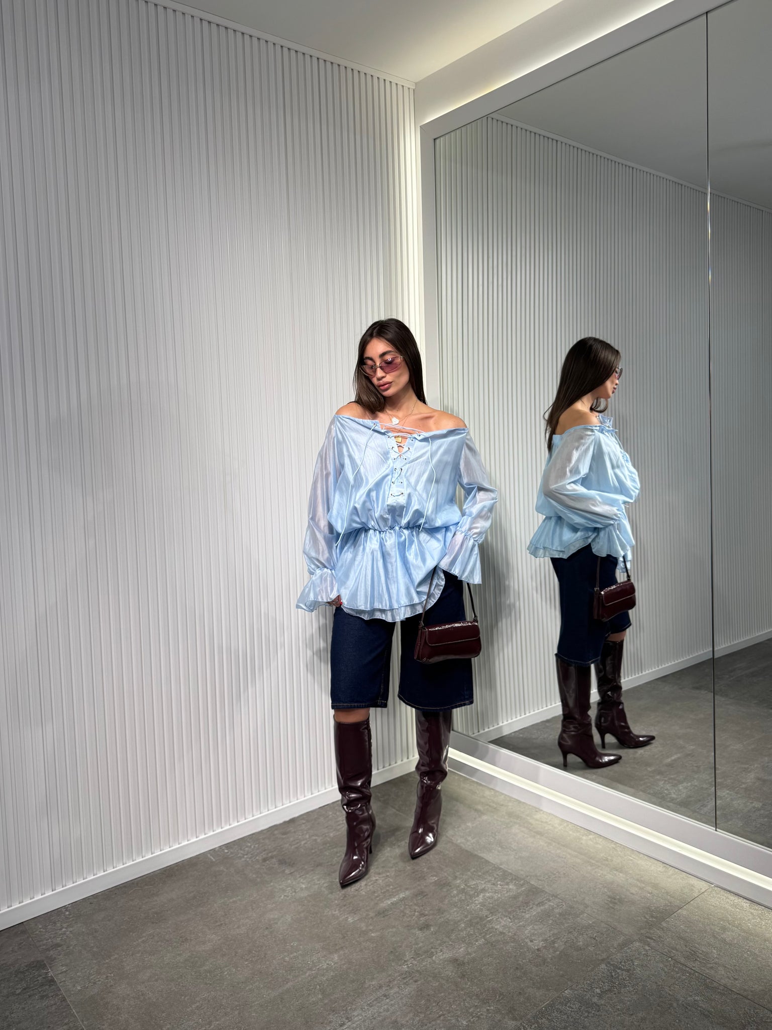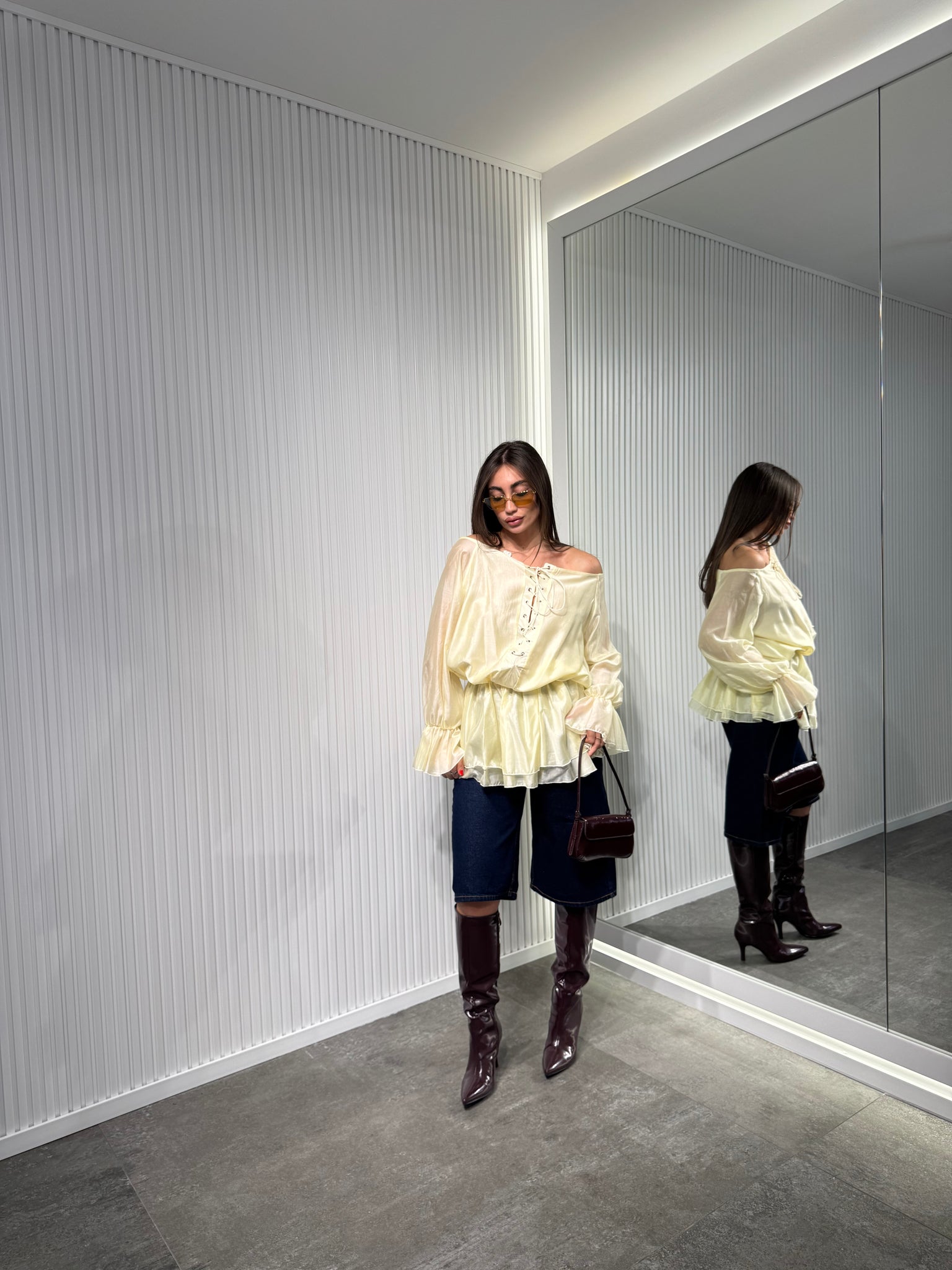 Maglia in tessuto chiffon, manica lunga ballon, con scollo particolare