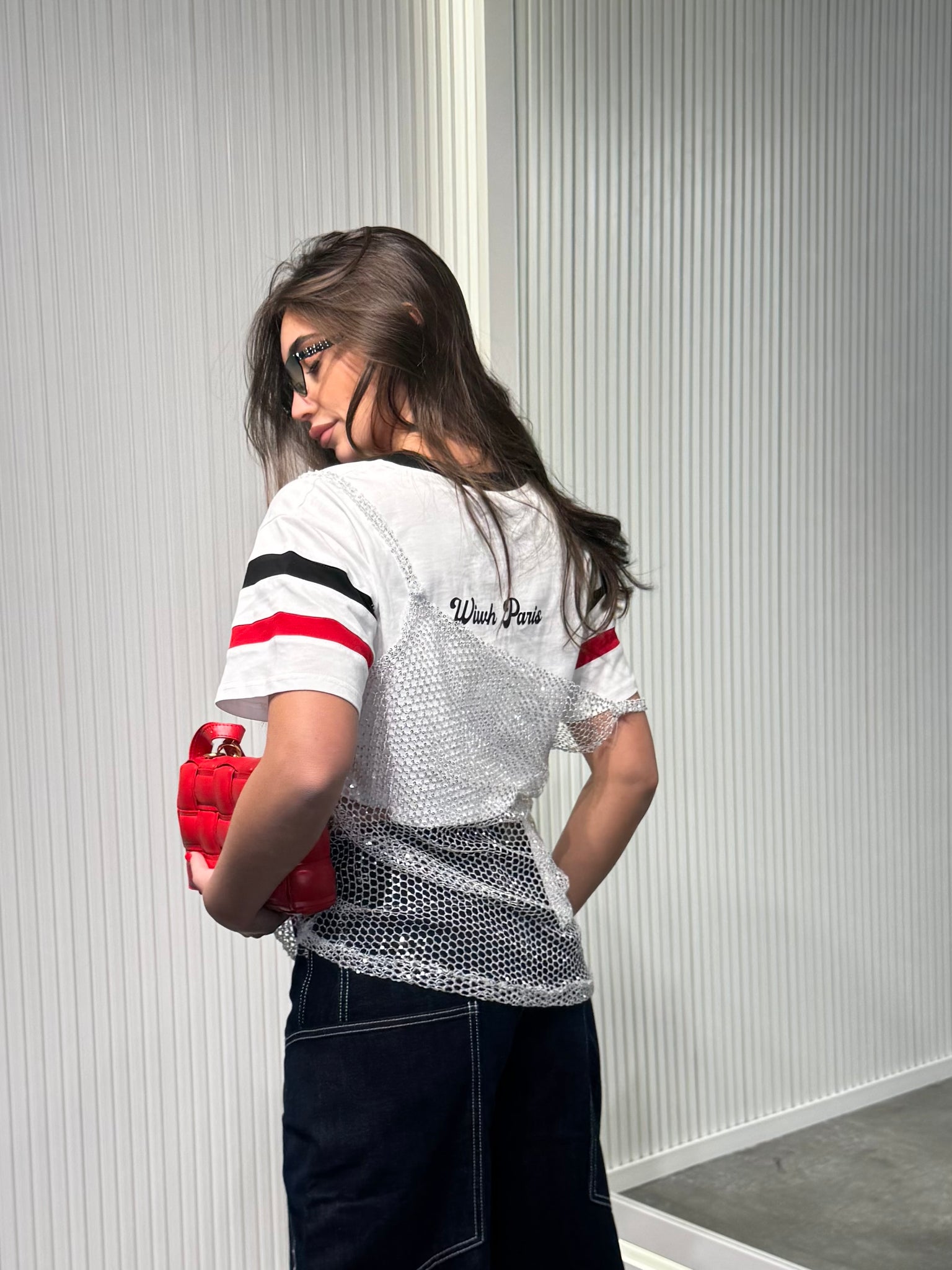 T-shirt crop in cotone, con stampa anteriore, giro collo, con canotta a rete brillantinata