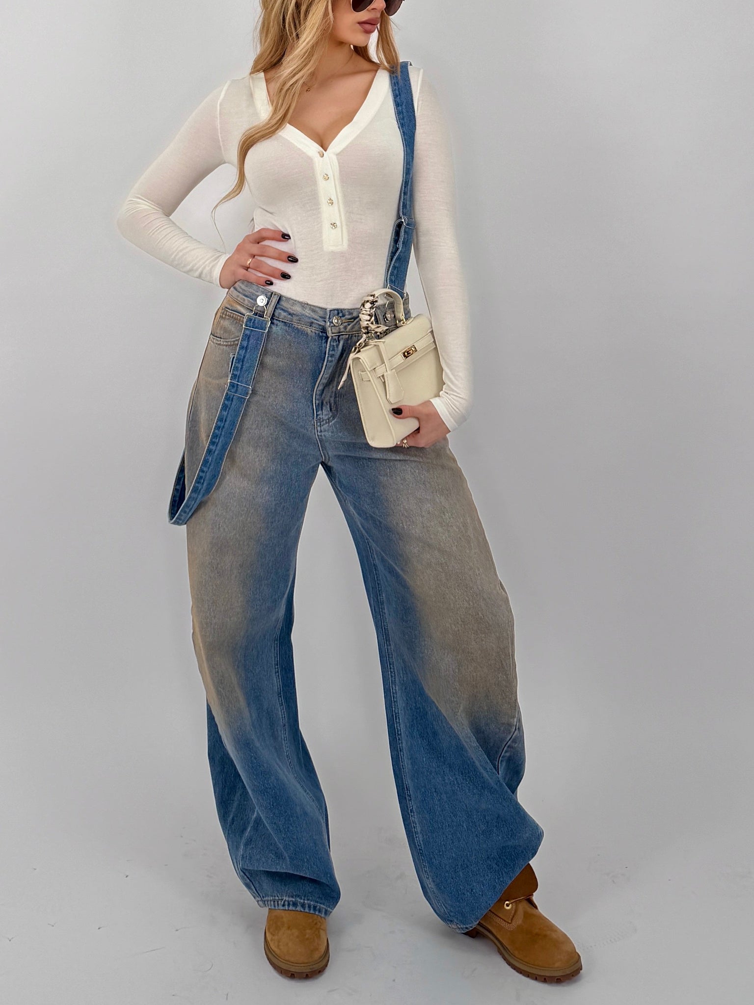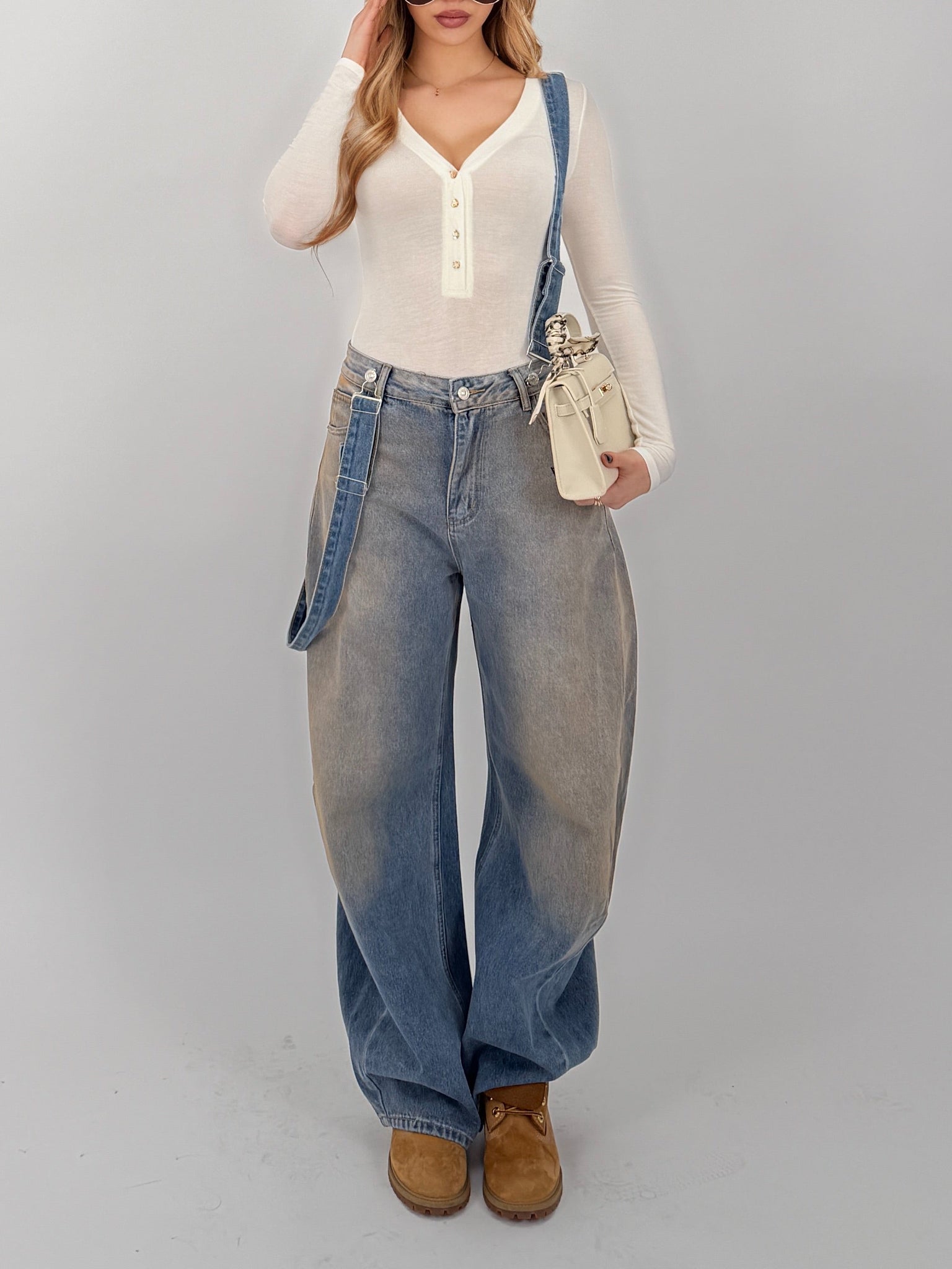 Salopette di jeans, fit ballon, bretelle regolabili.