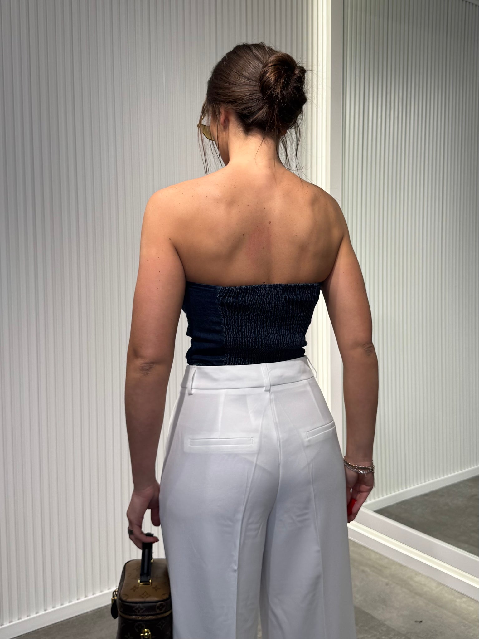 Top in denim, stringato sul davanti, elastico sul retro