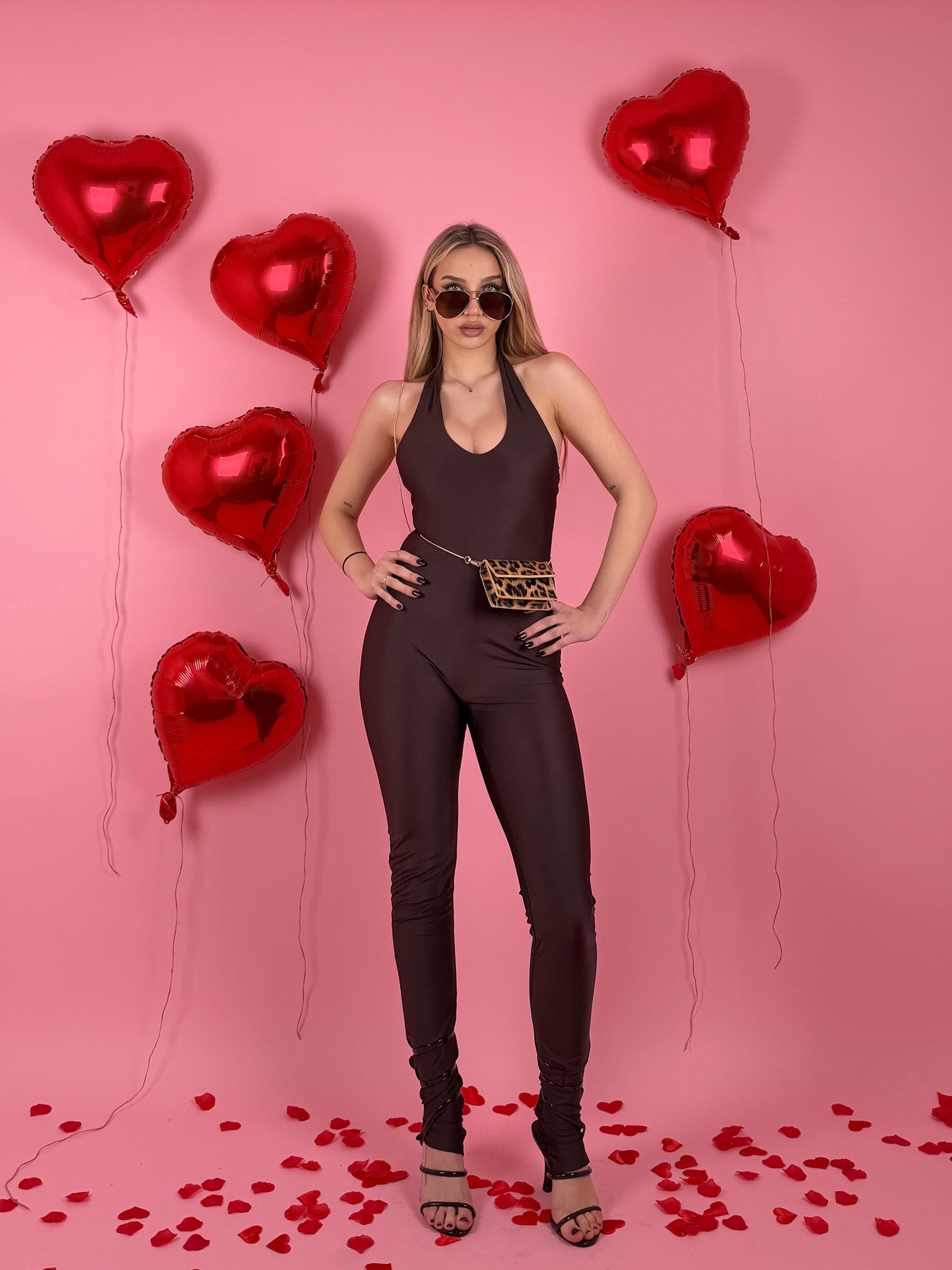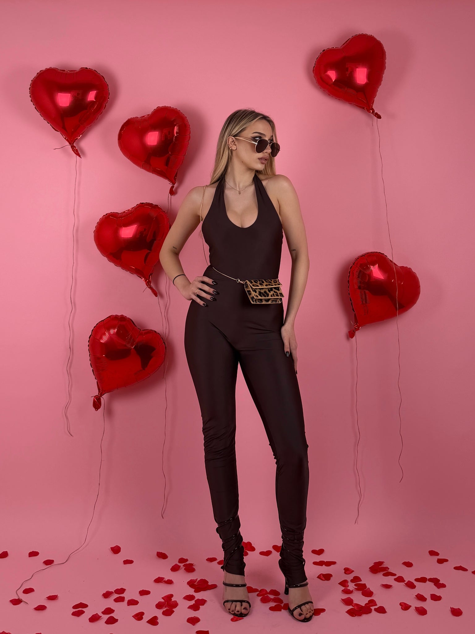 Tutina lunga di lycra, si lega al collo, scollata sul retro, presenta arricciature sul retro.