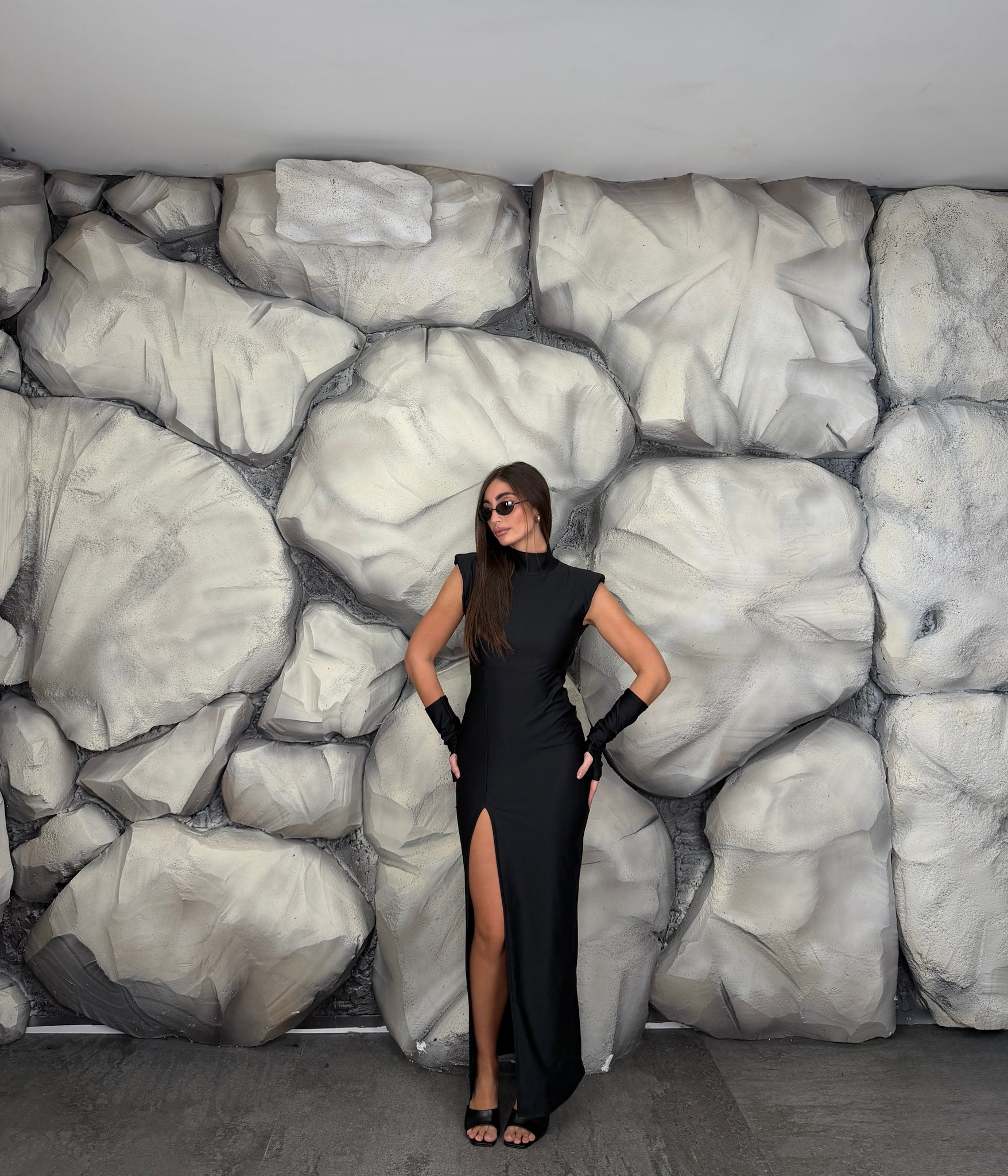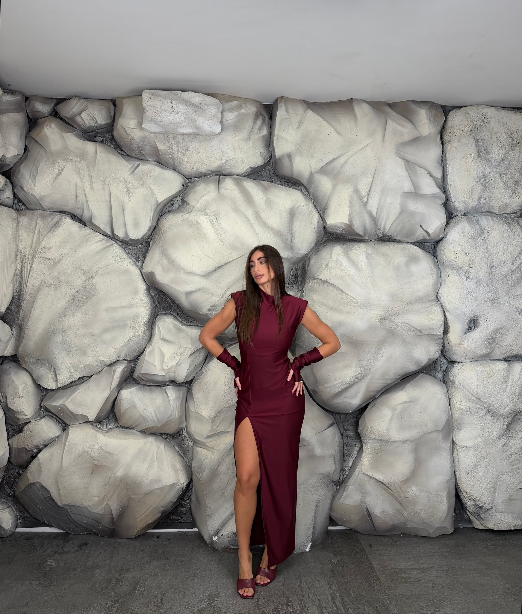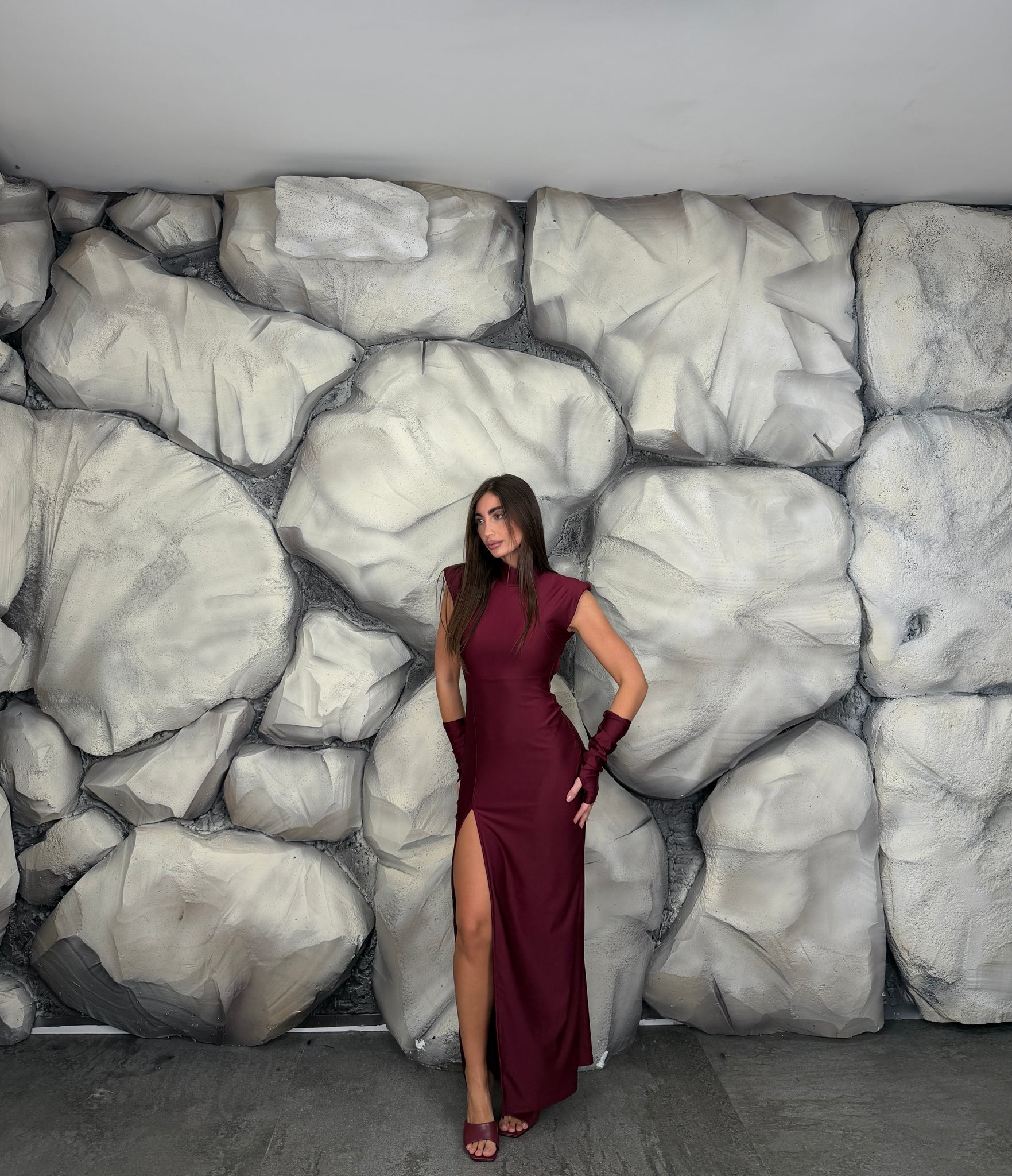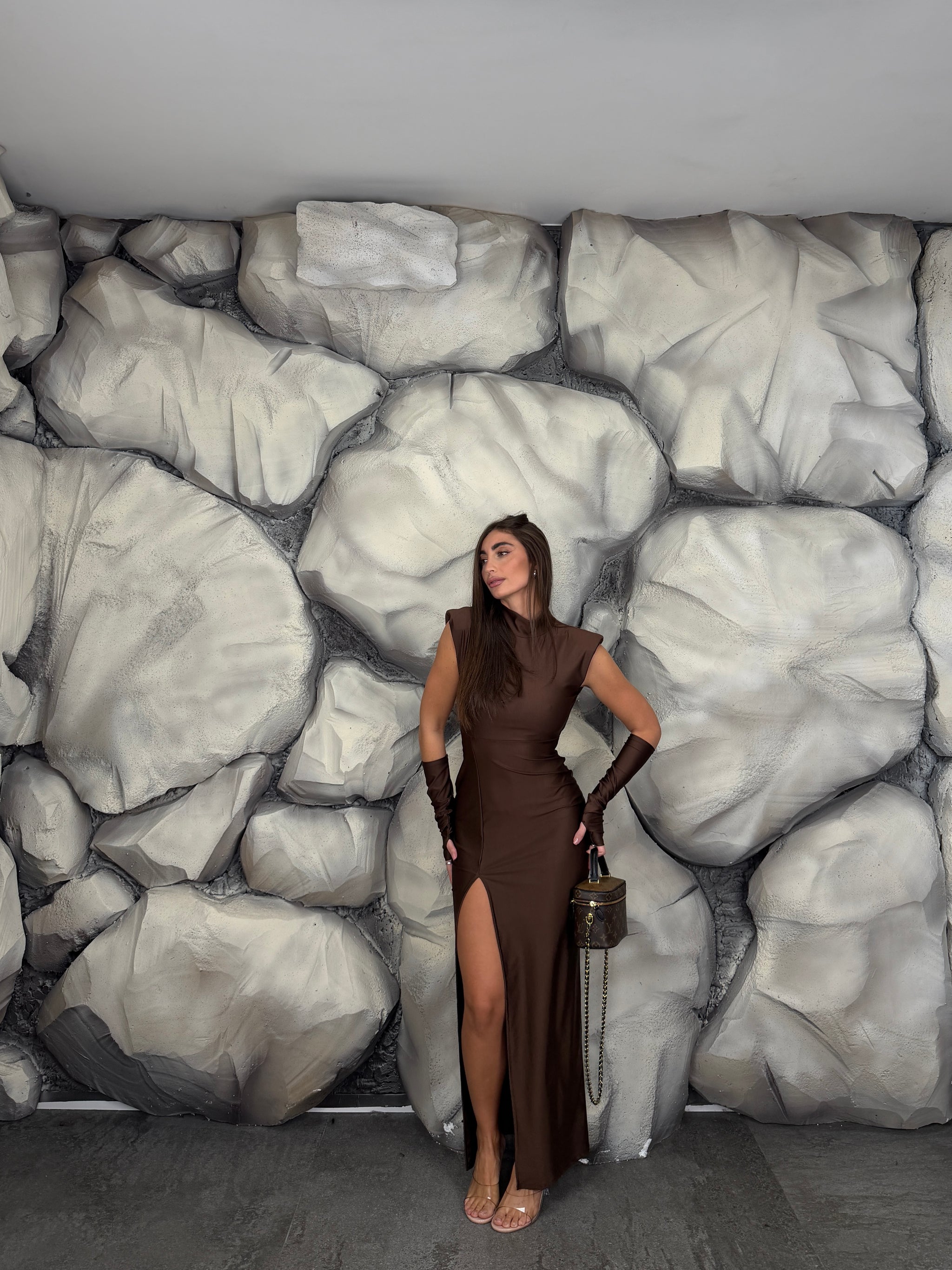 Vestito lungo di lycra giromanica  con spalline preformate e colletto, scollato sul retro, spacco laterale, manicotti annessi.