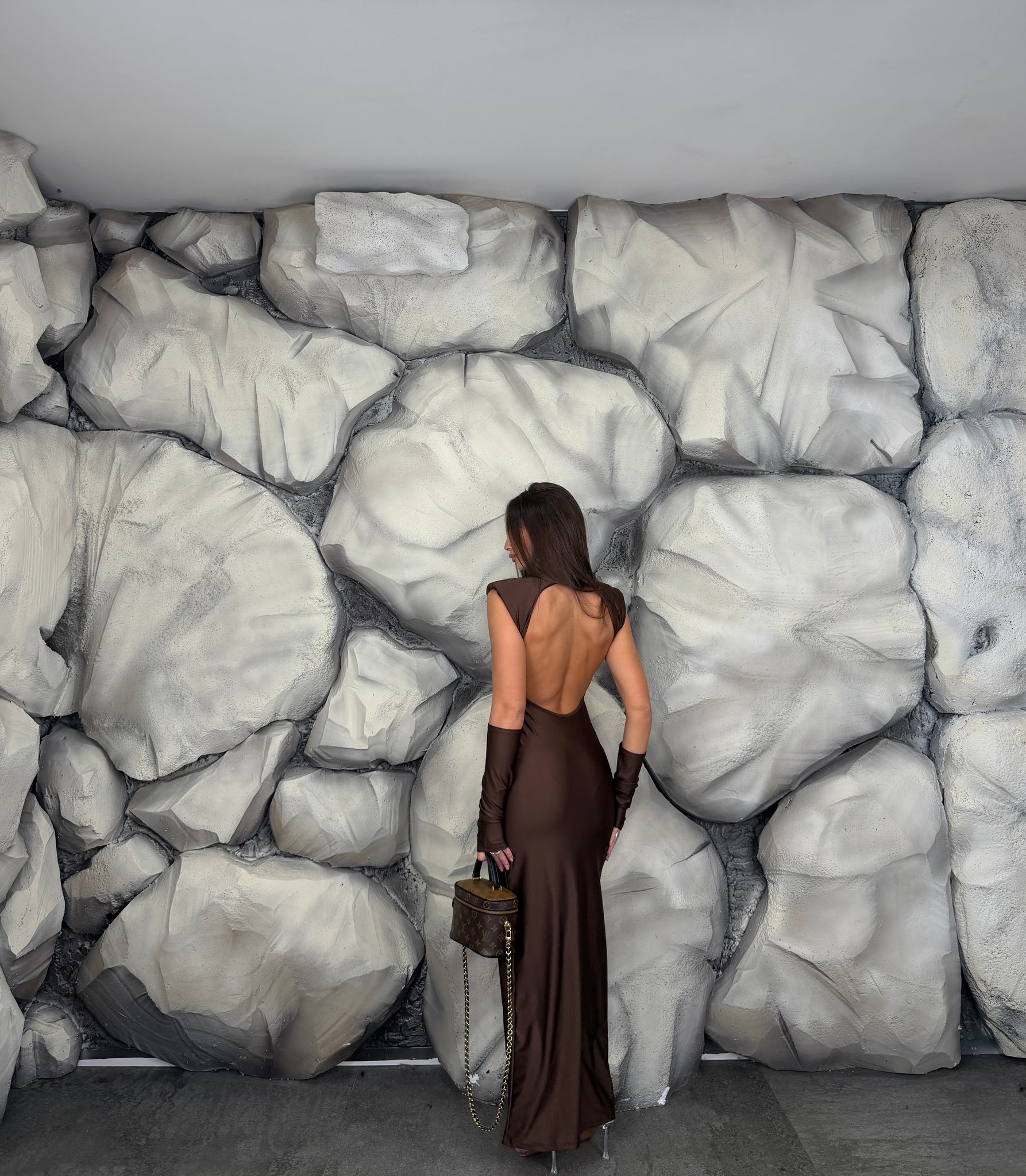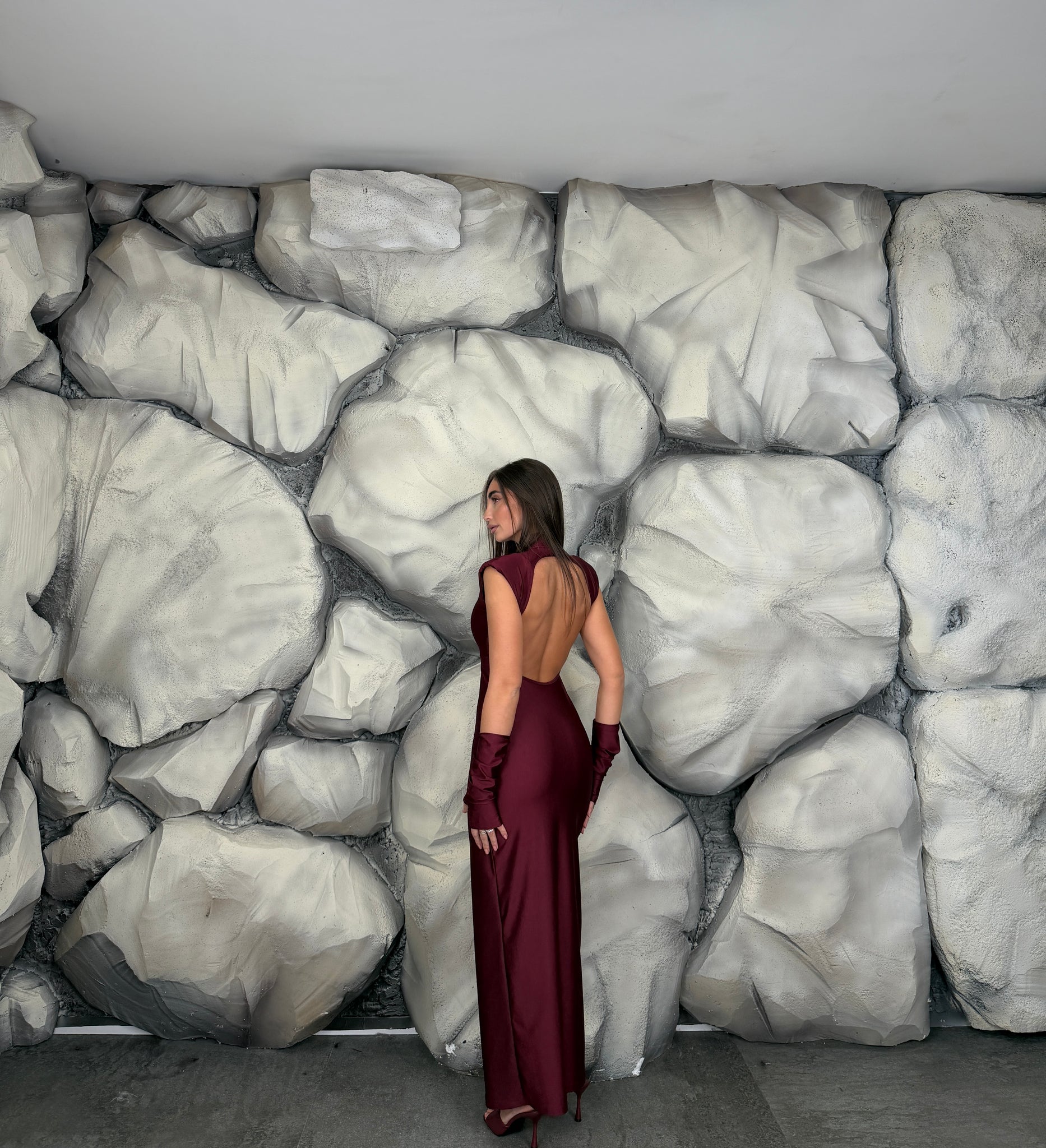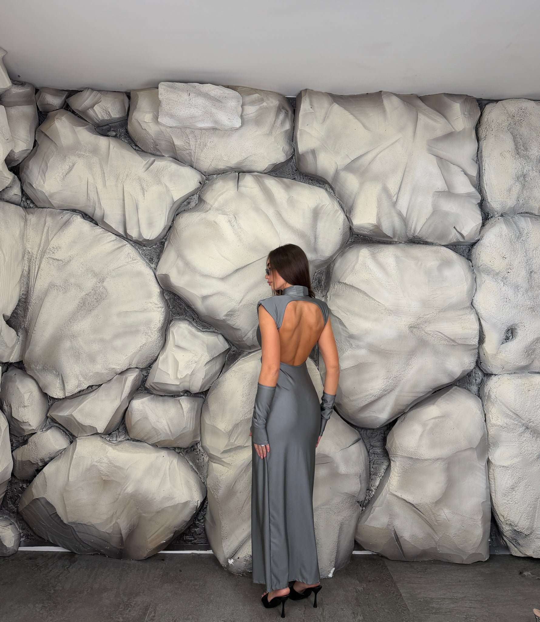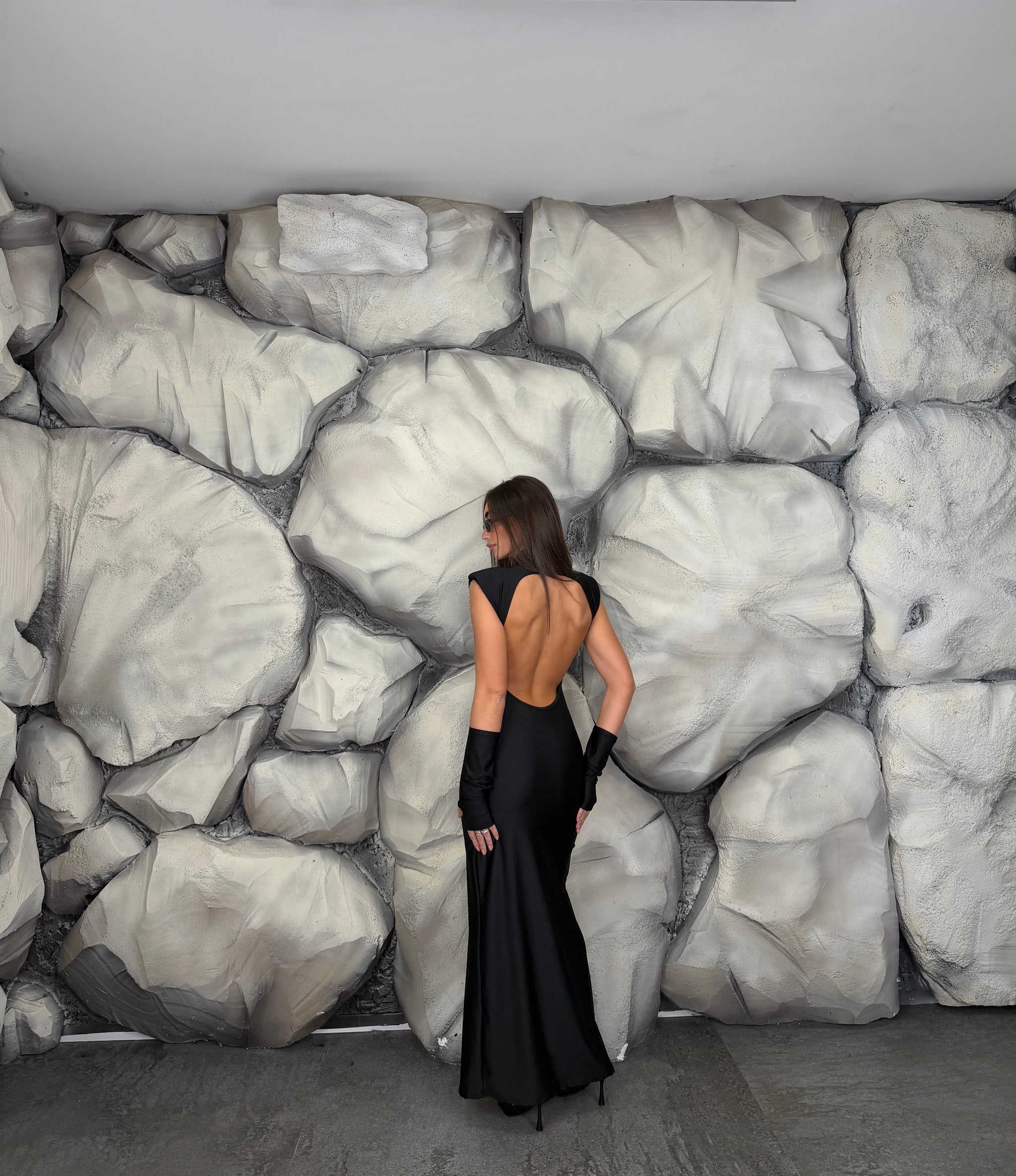 Vestito lungo di lycra giromanica  con spalline preformate e colletto, scollato sul retro, spacco laterale, manicotti annessi.