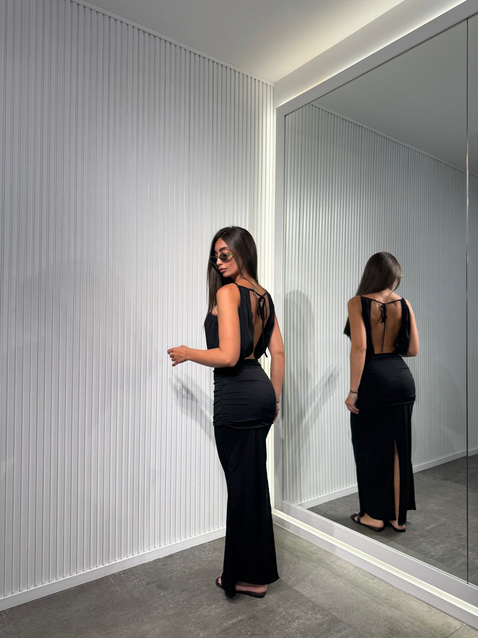 Vestito lungo che si lega sul retro con le bretelle che si incrociano sul davanti, elastico in vita, arricciato lateralmente, scollato sul retro.