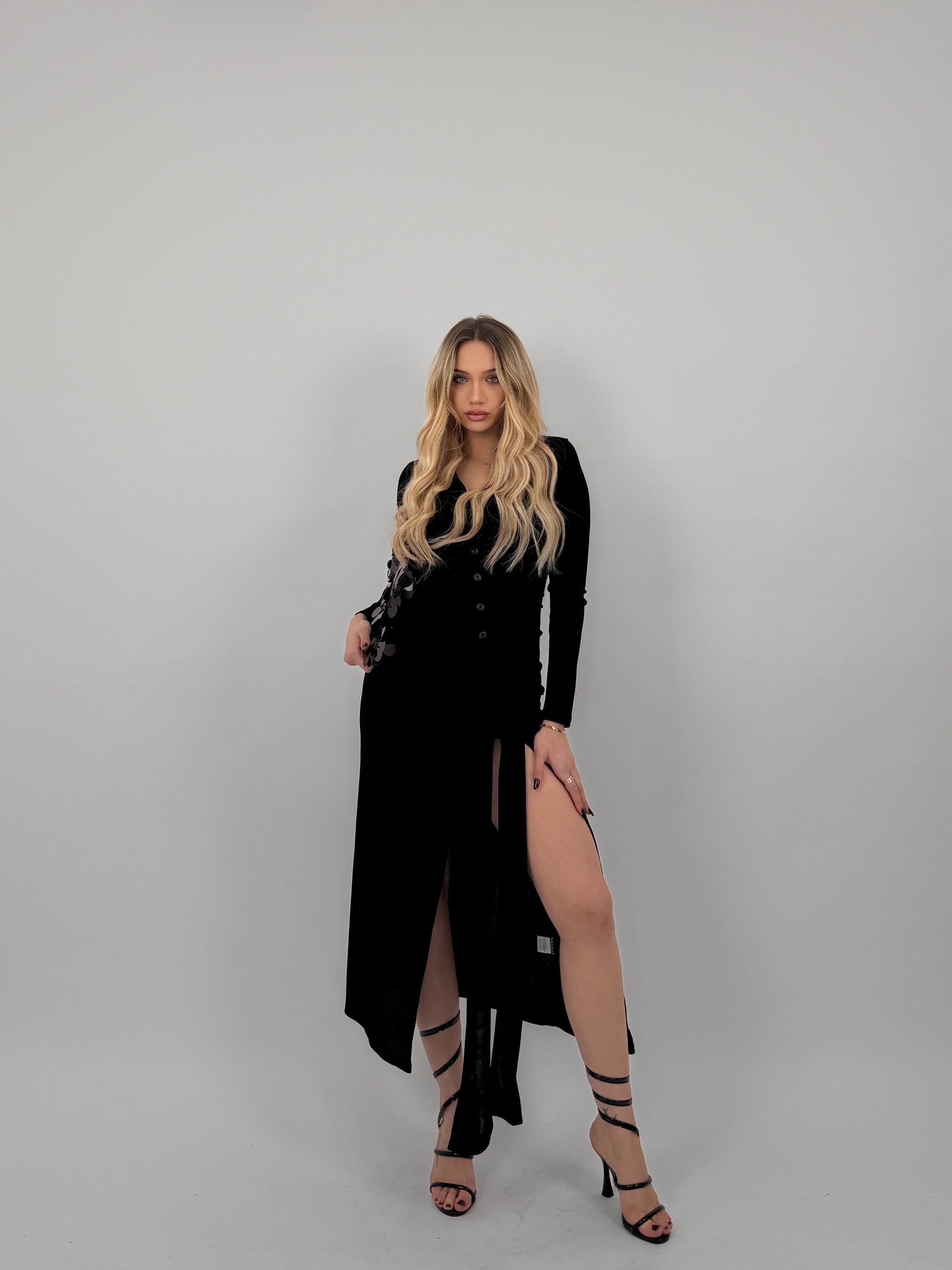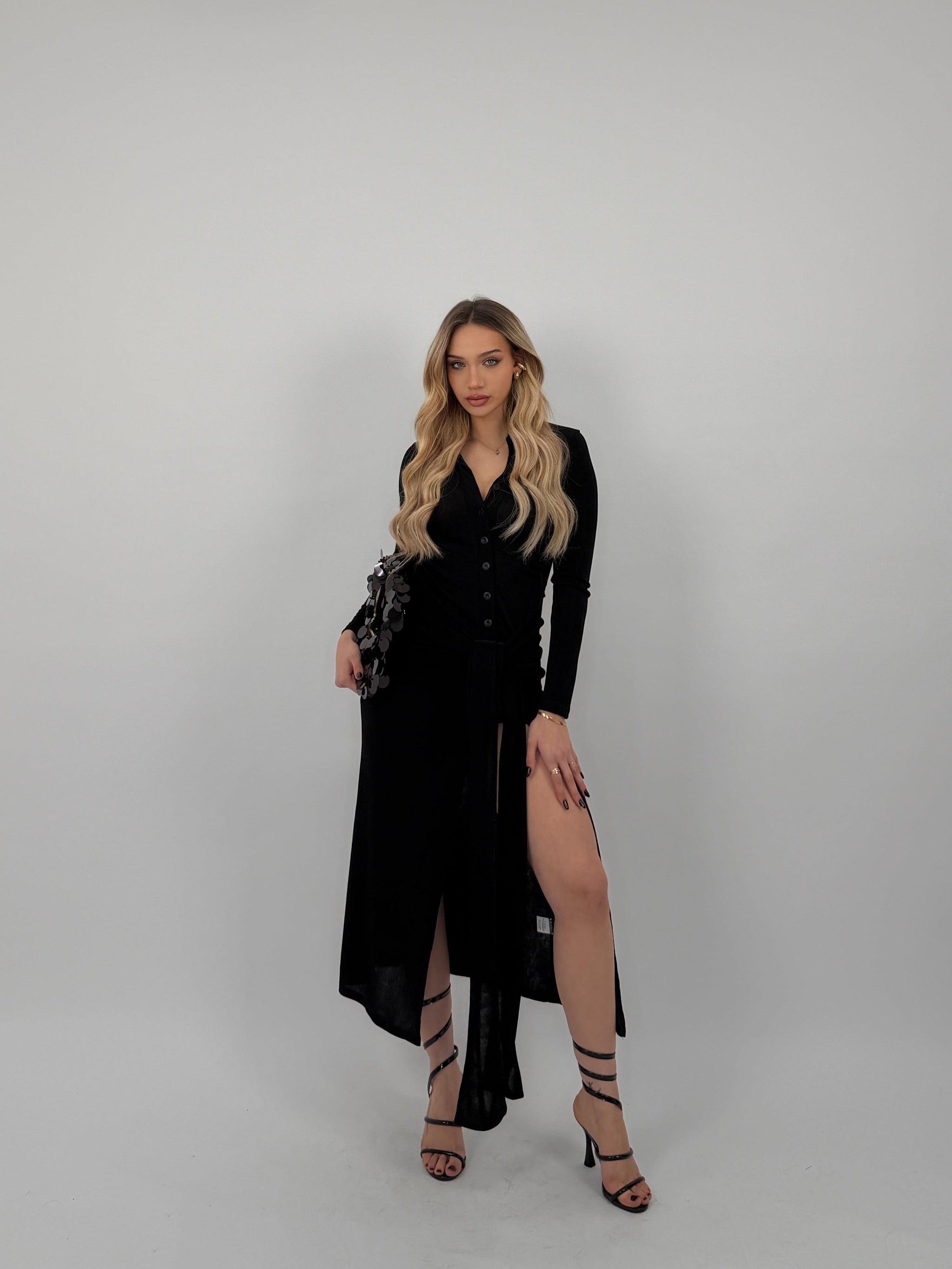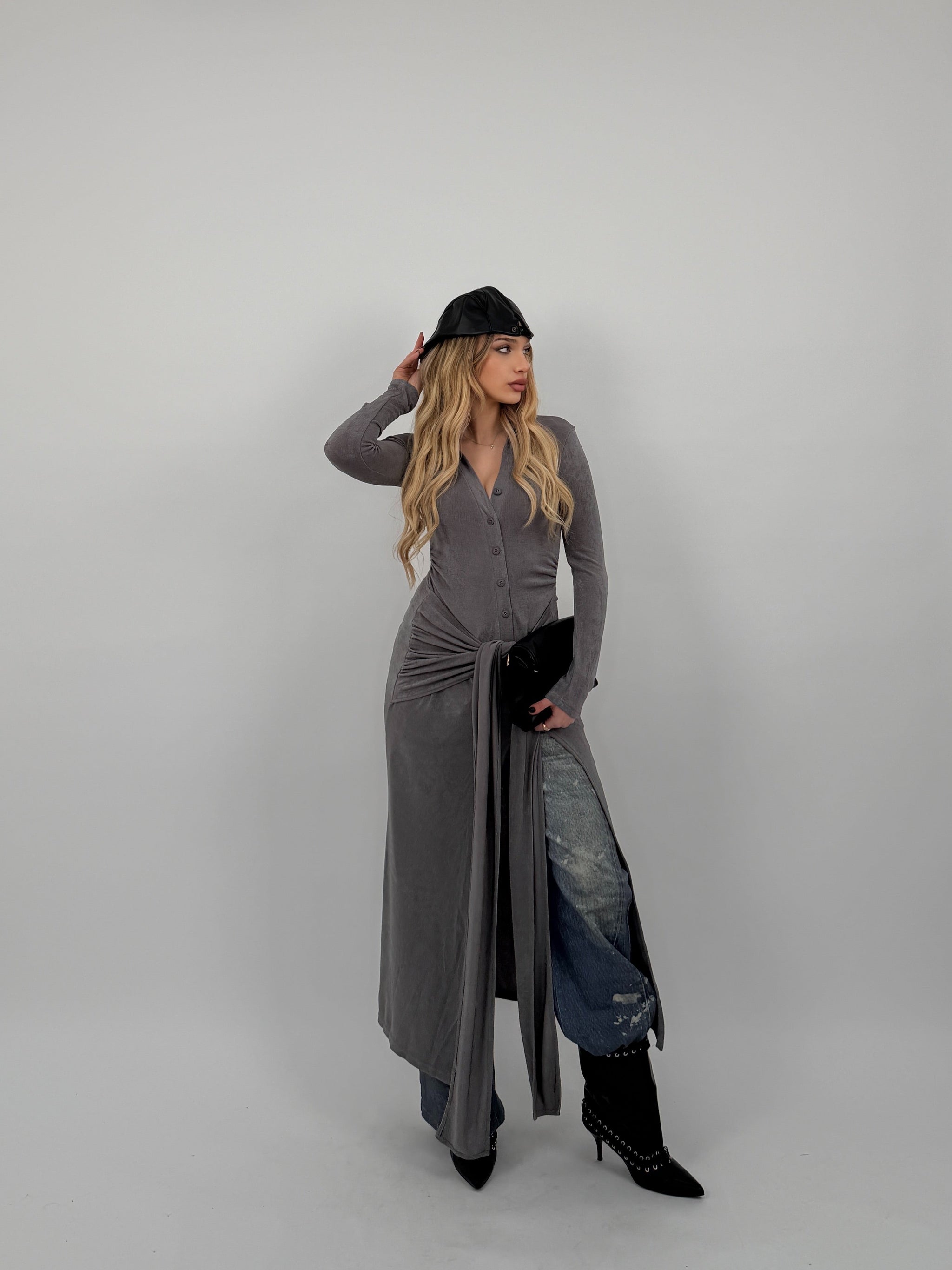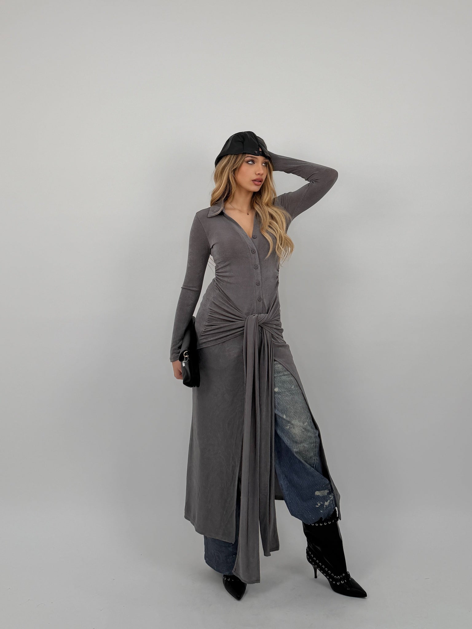 Vestito in tessuto morbido, bottoncini sul davanti, cintura in vita, scollo a camicia.