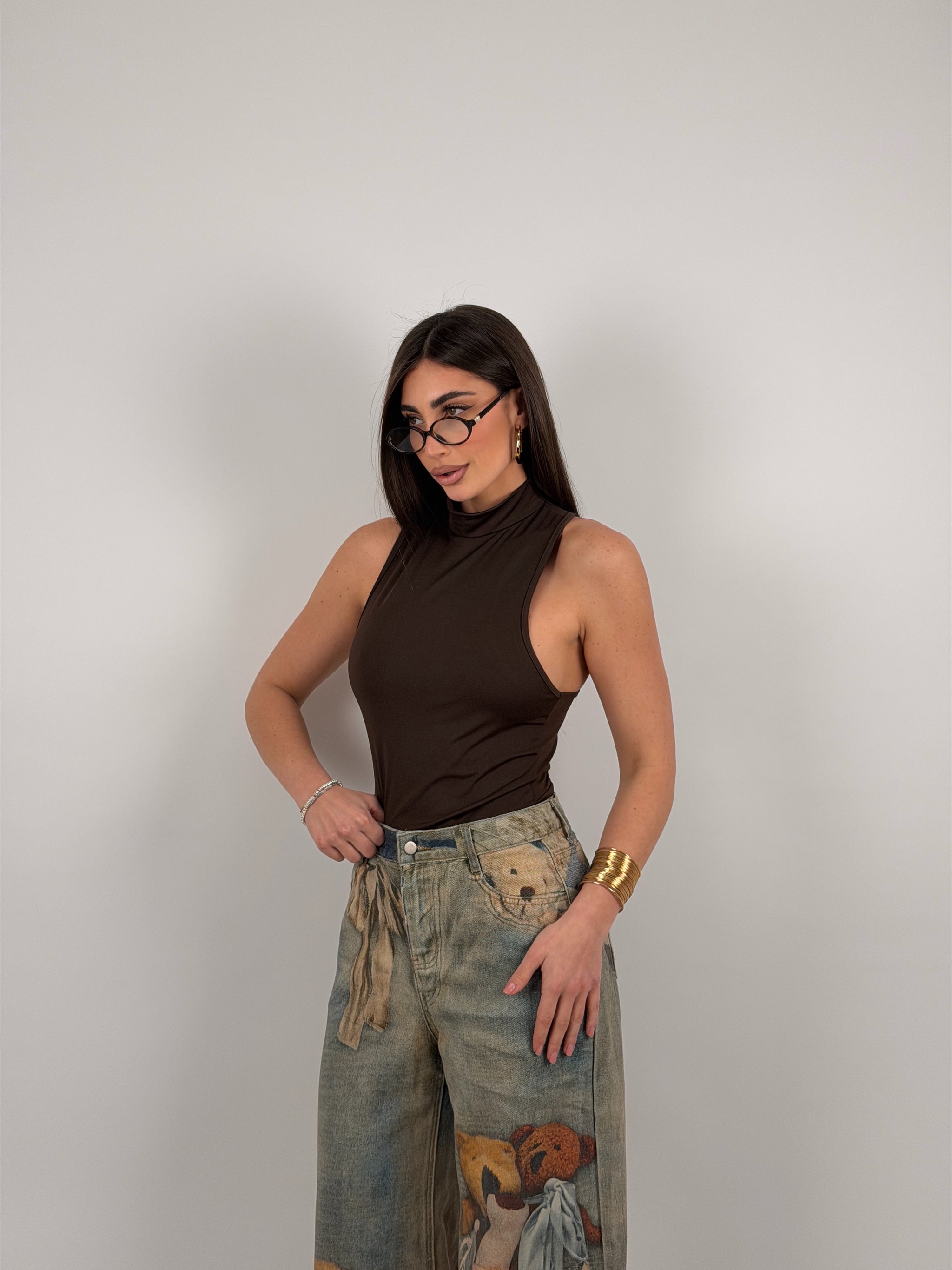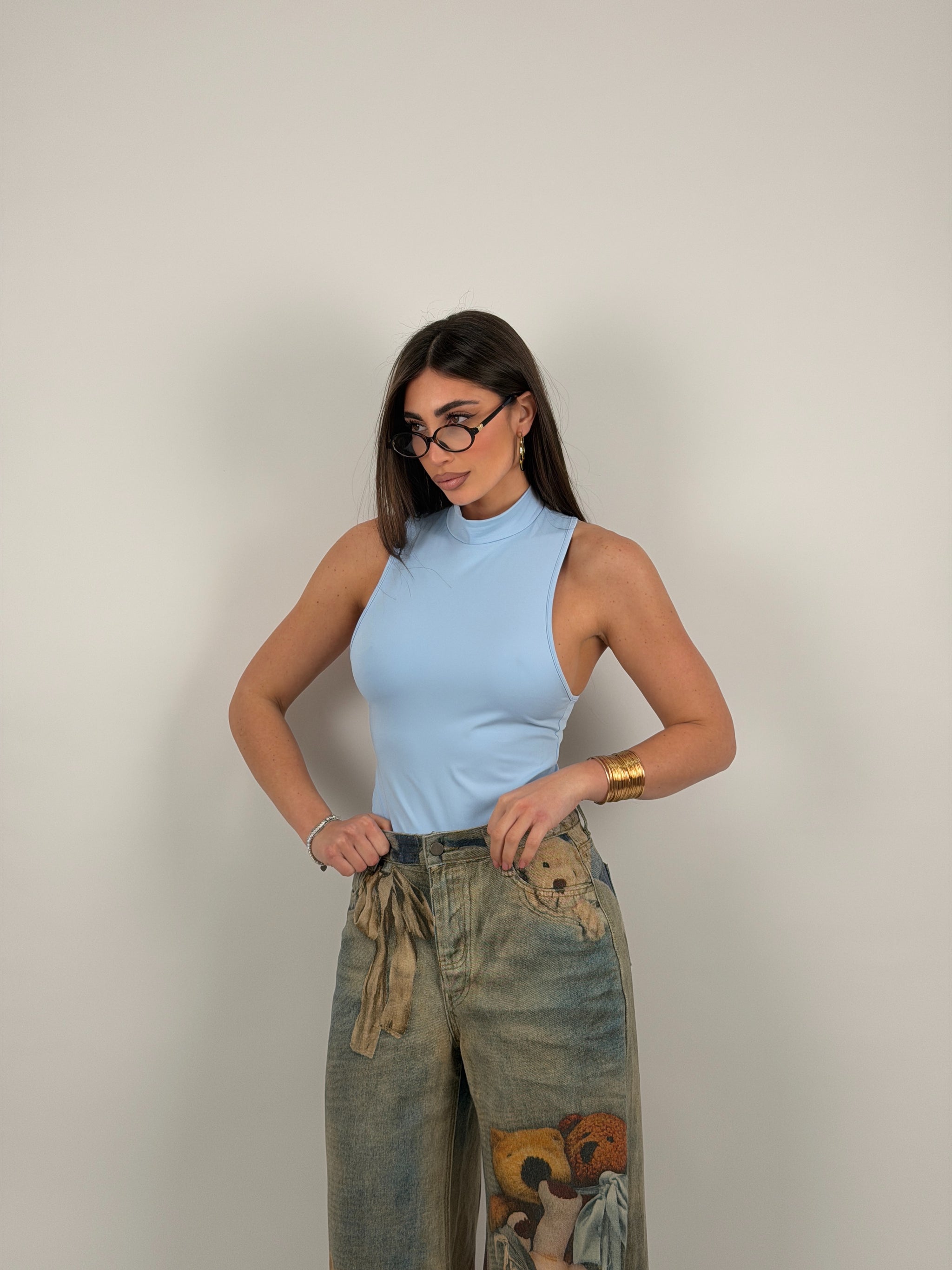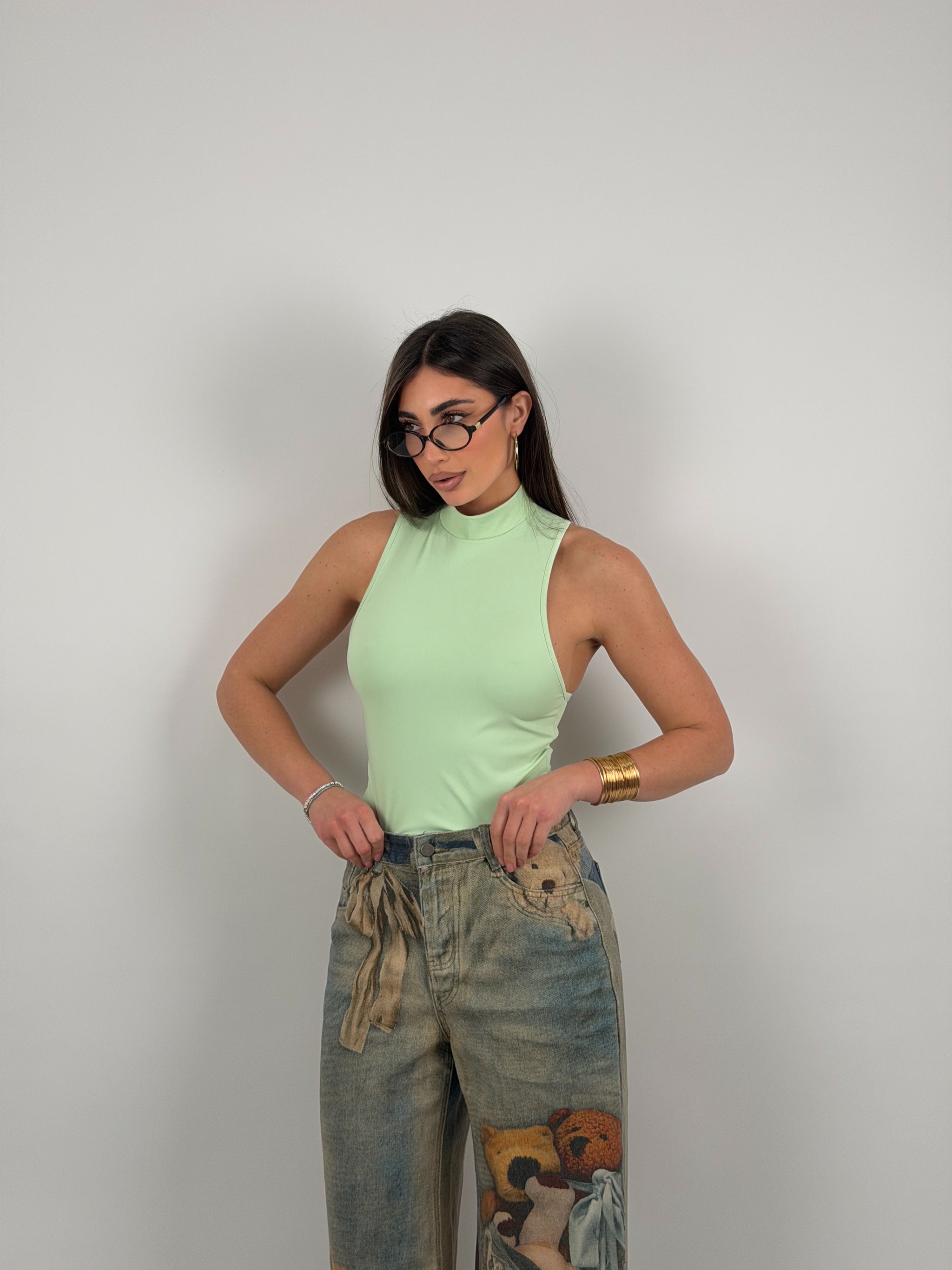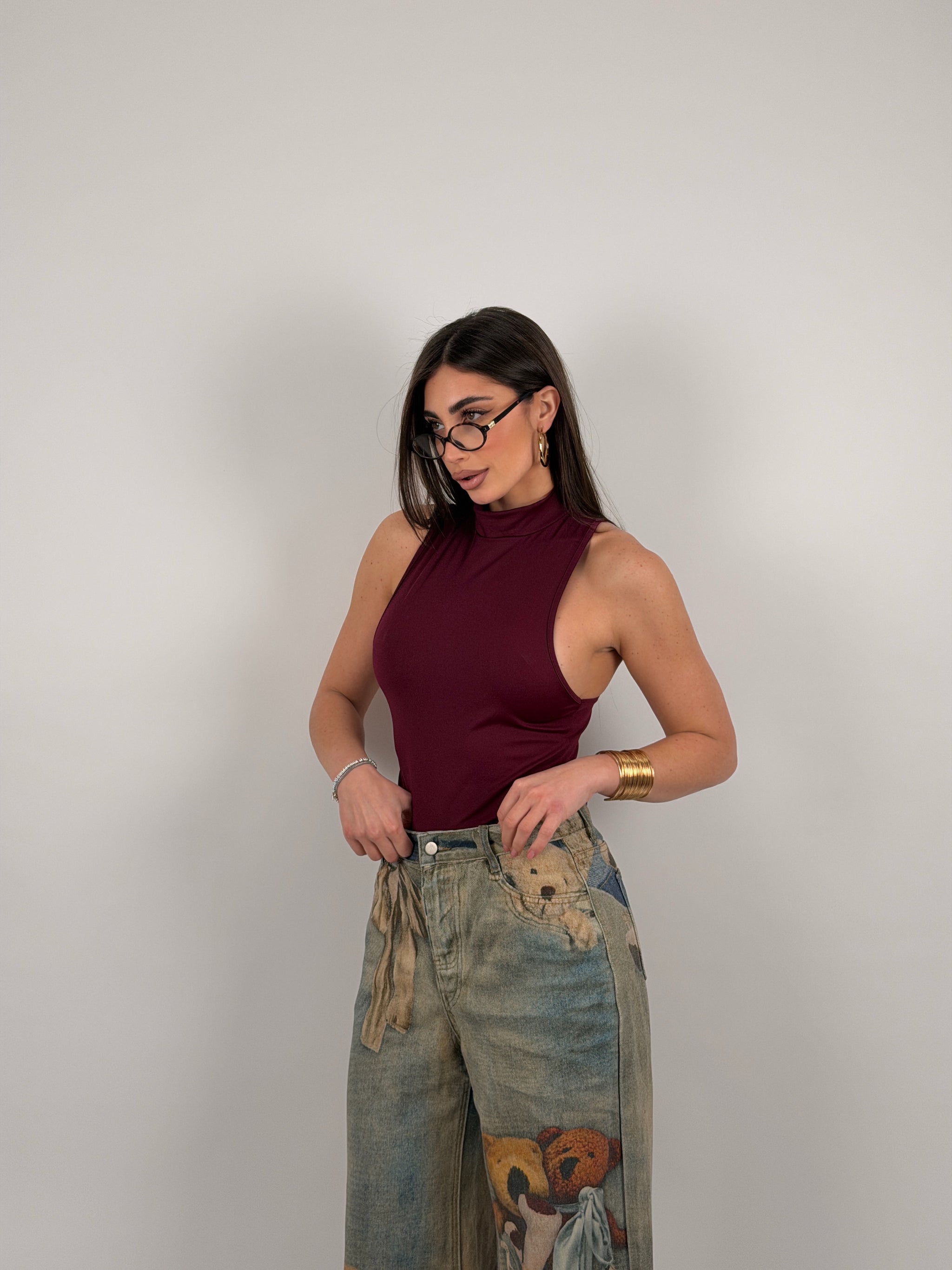 Body di lycra, scollo all’americana, con colletto.