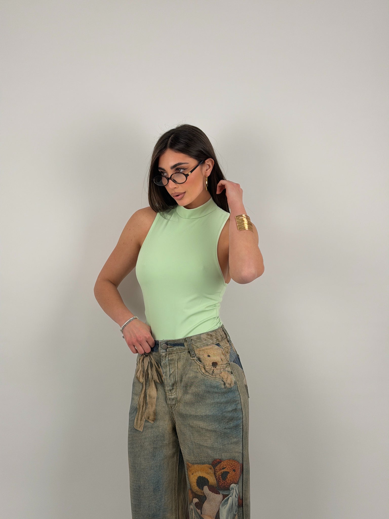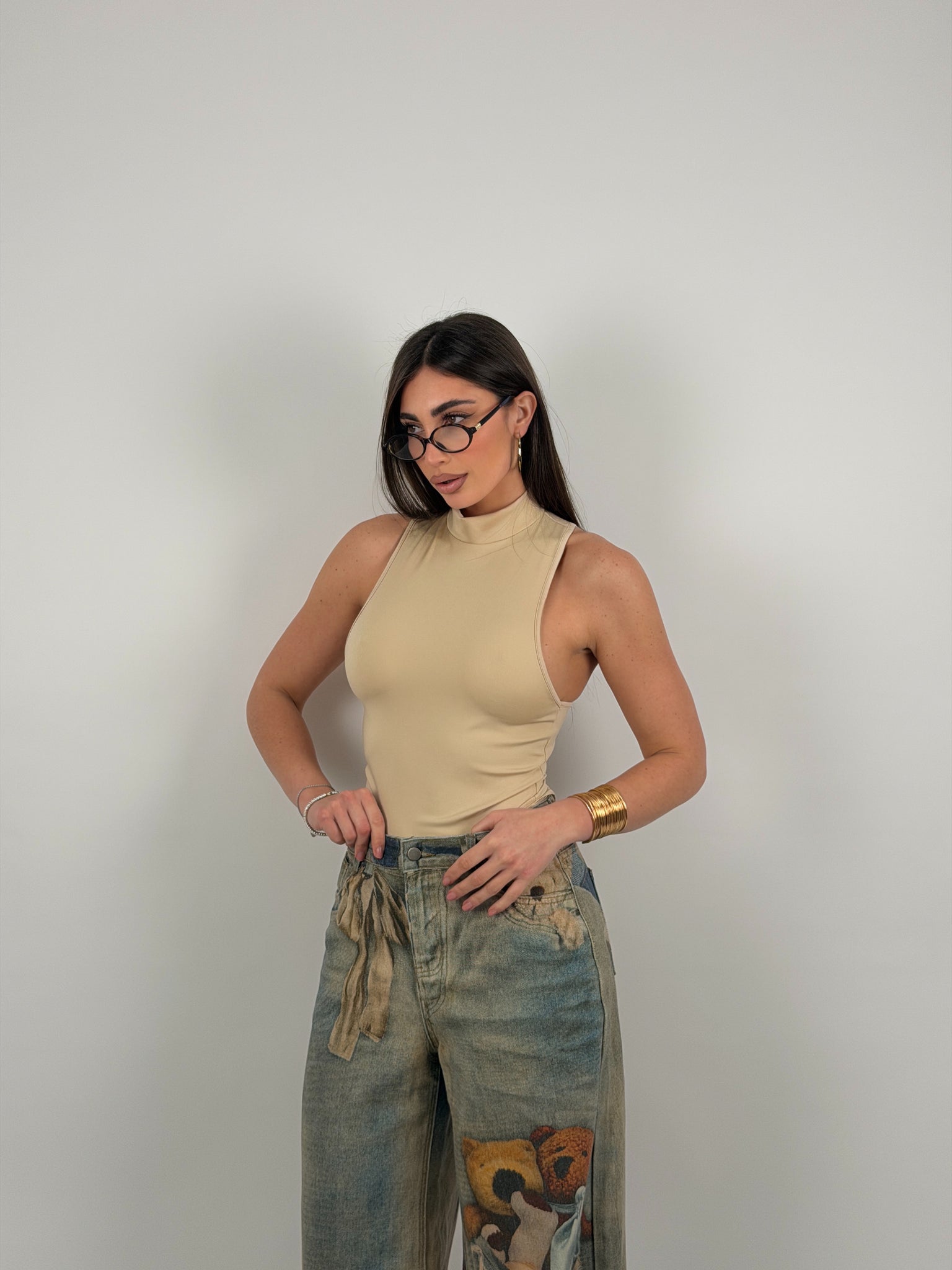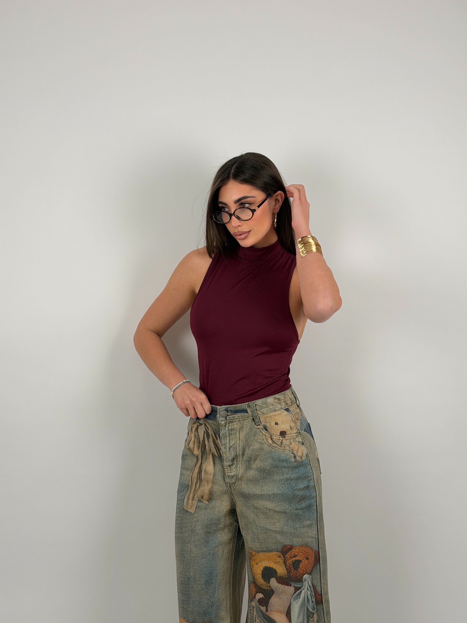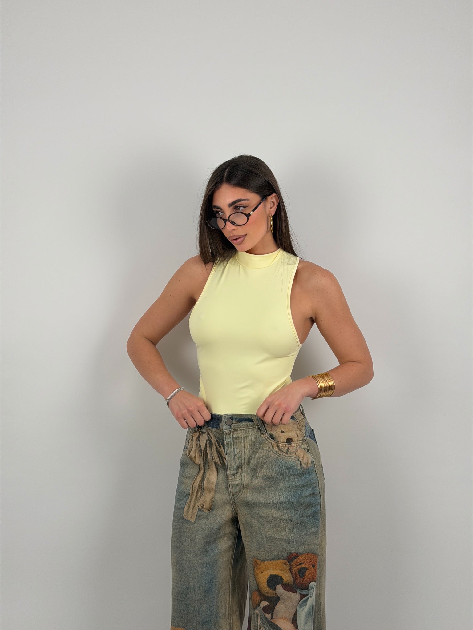 Body di lycra, scollo all’americana, con colletto.