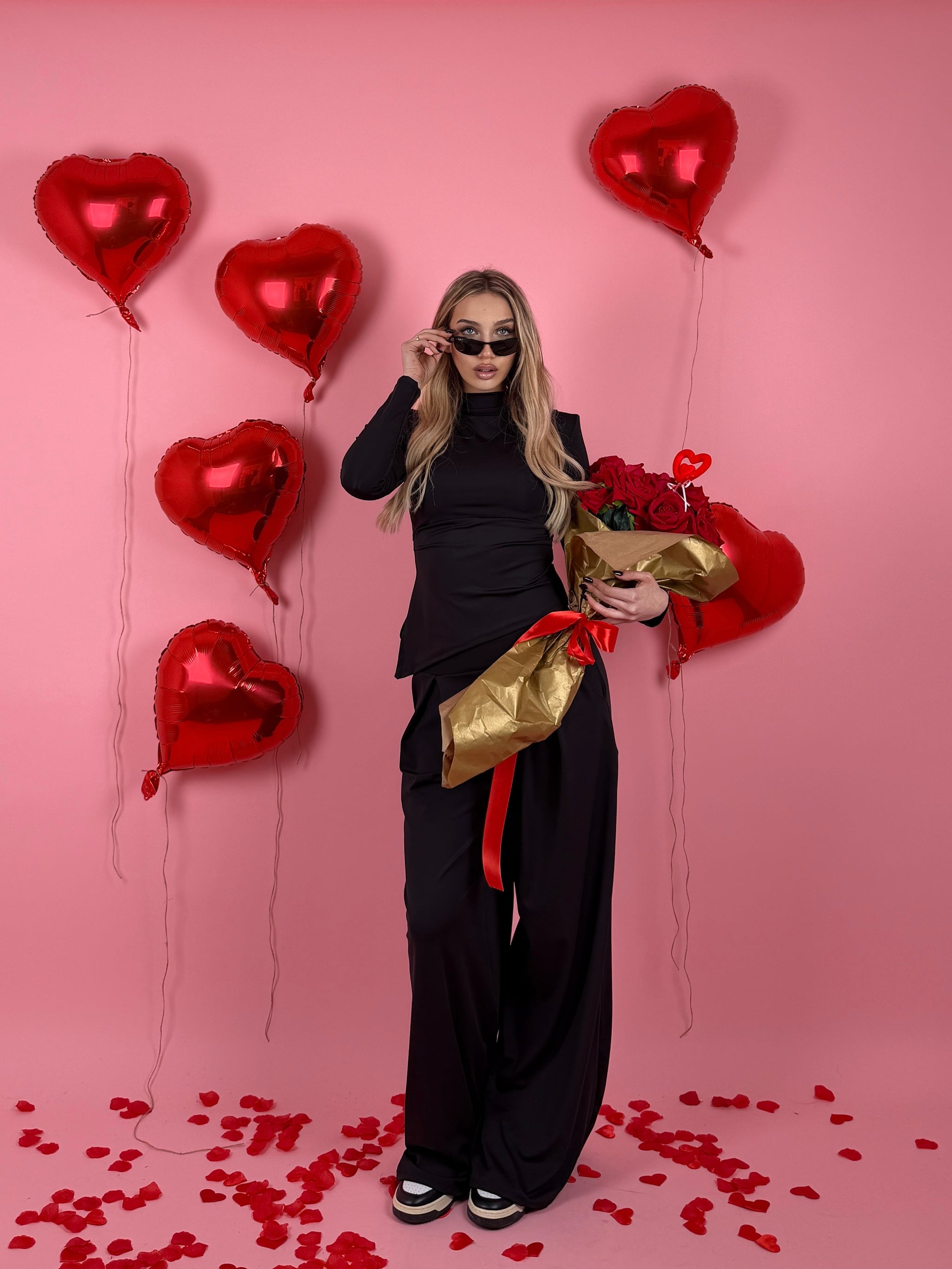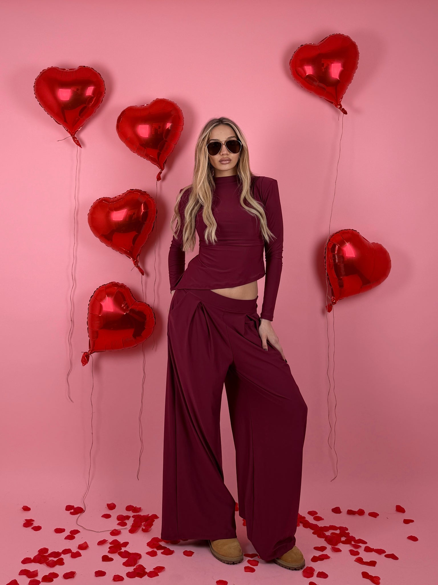Completo di lycra, composto da maglia manica lunga con spalline preformate e taglio svasato, pantalone modello palazzo con elastico in vita.