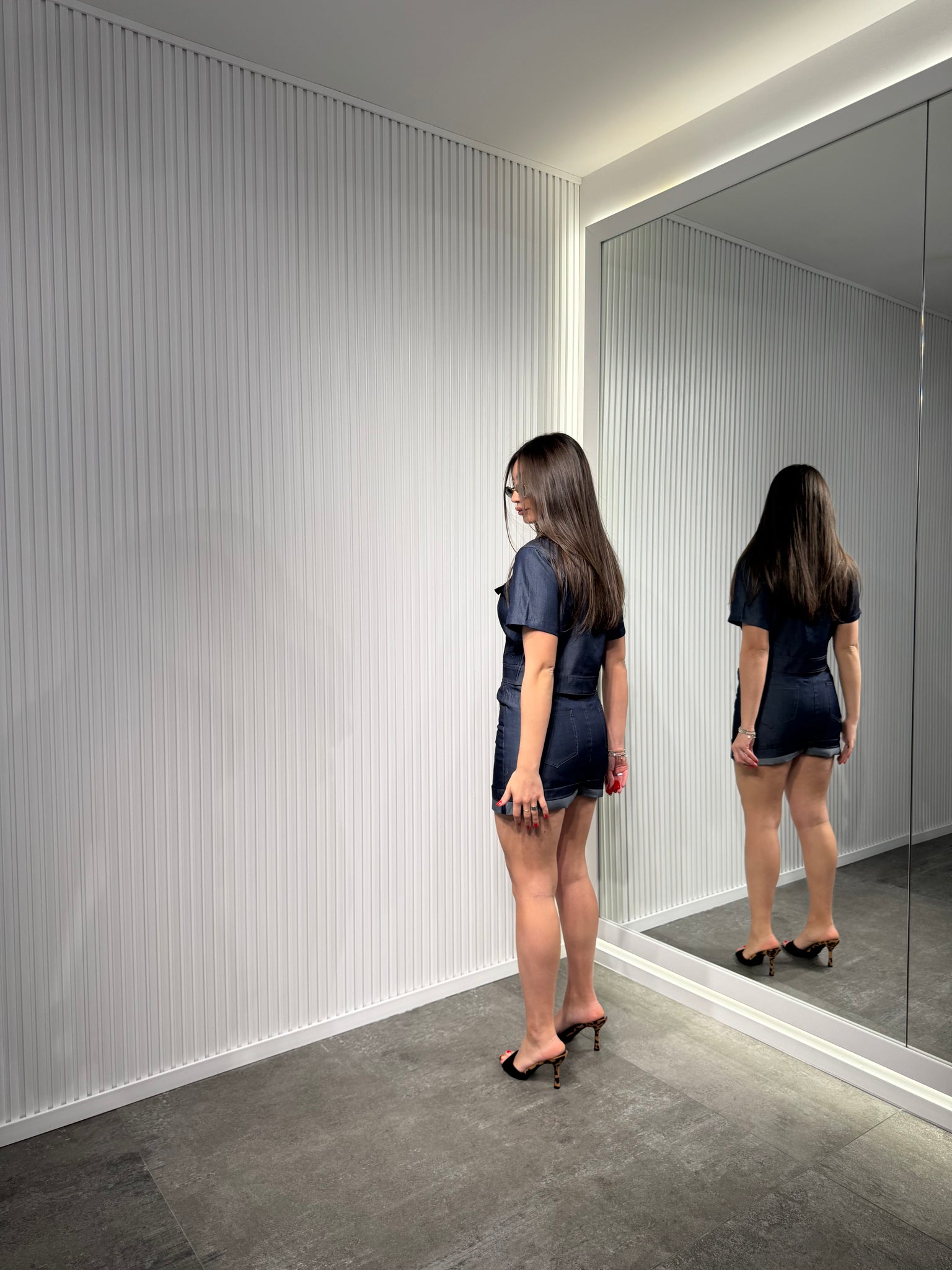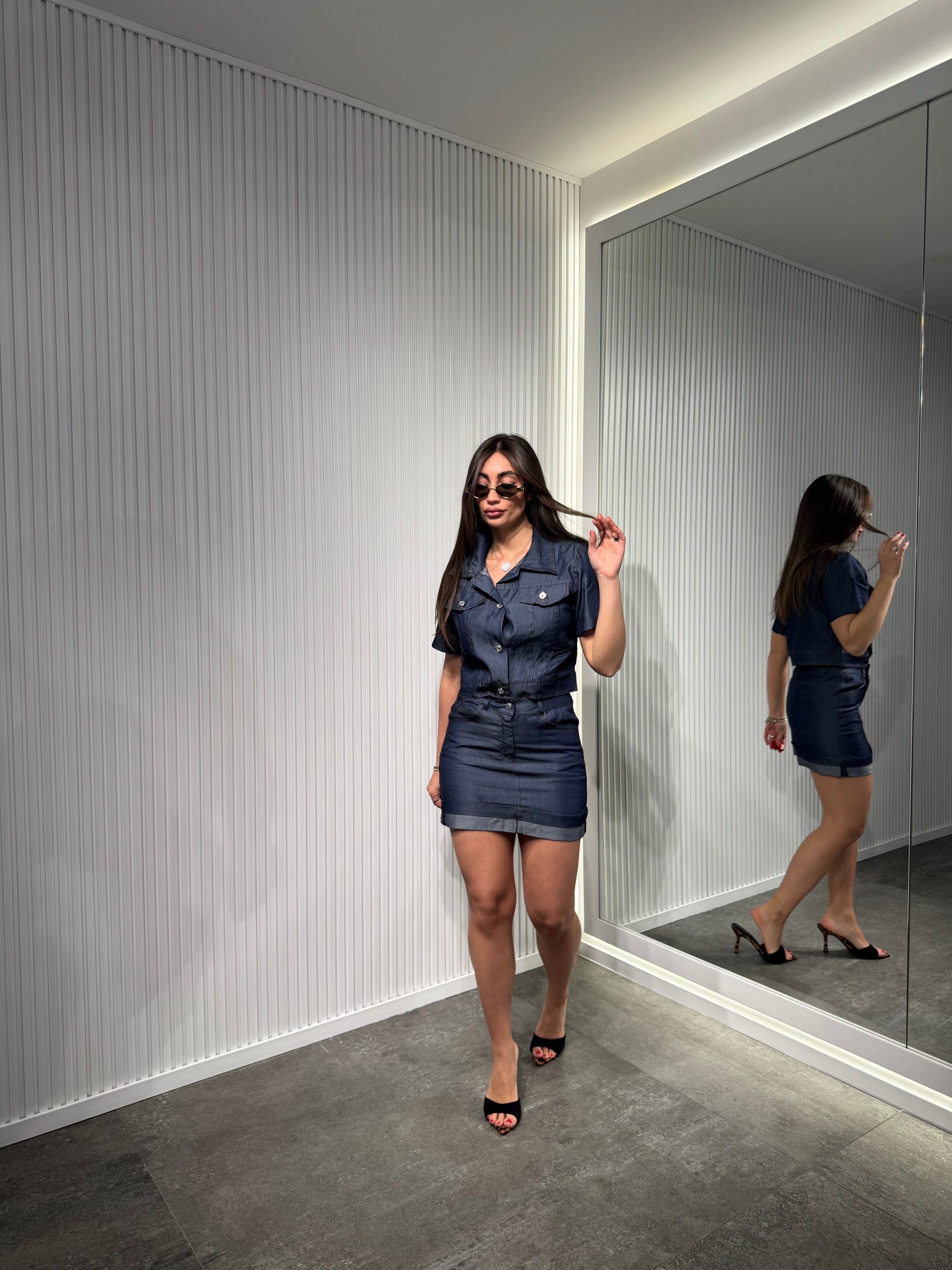Completo di jeans, composto da giacca leggermente crop, con bottoni sul davanti, gonna con piegone sul finale.