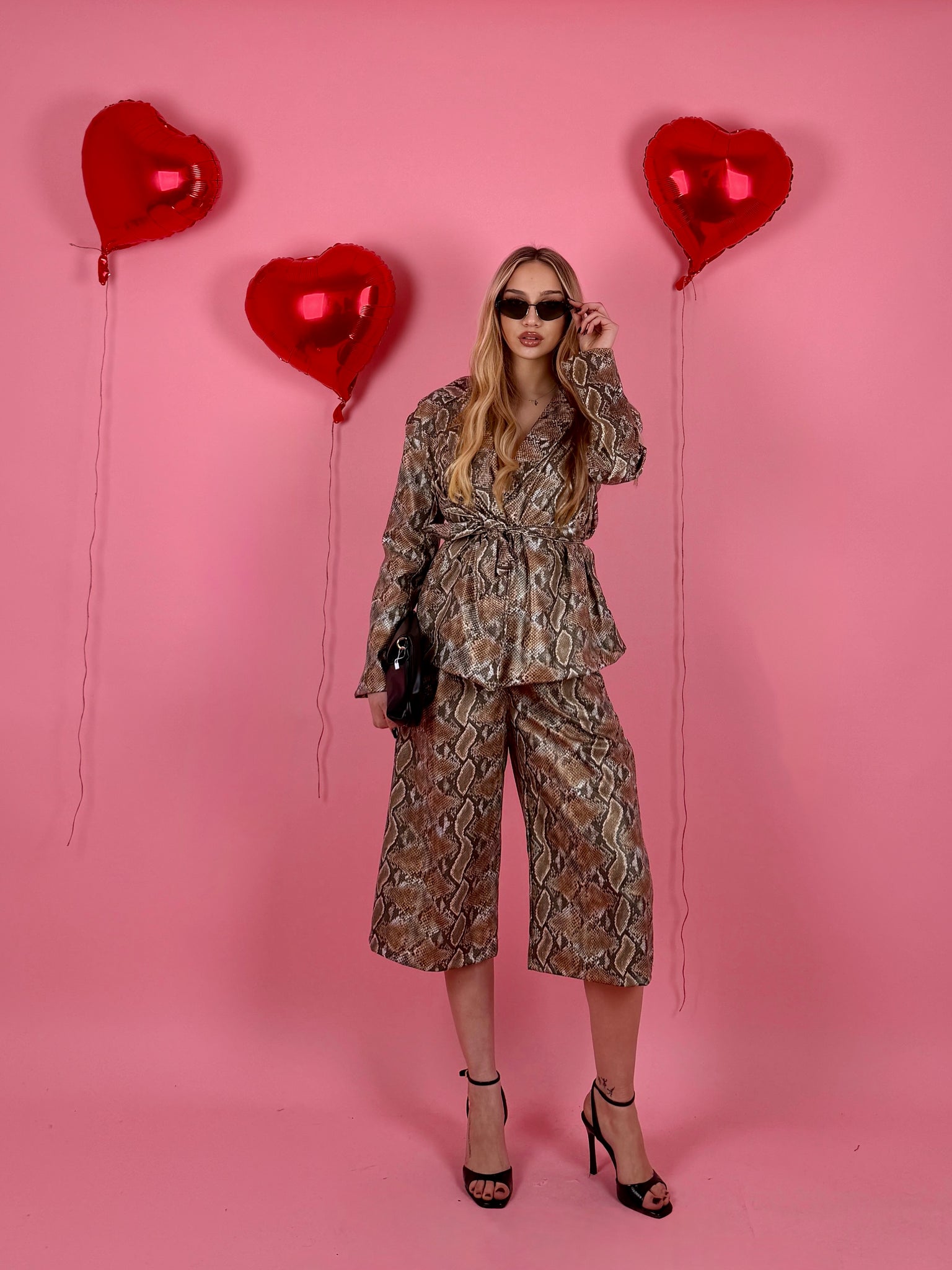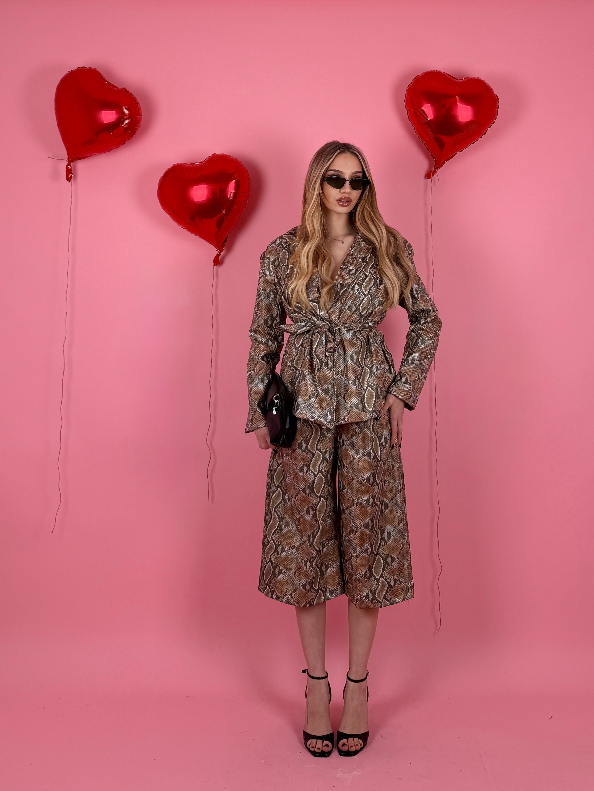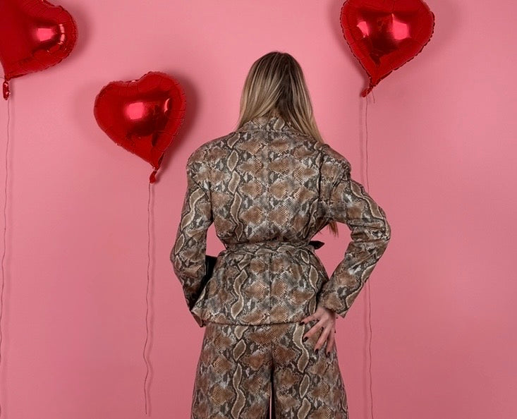 Completo in ecopelle pitonato, giacca strutturata over size con cintura in vita e foderata all’interno, spalline preformate, jorts con elastico sul retro.
