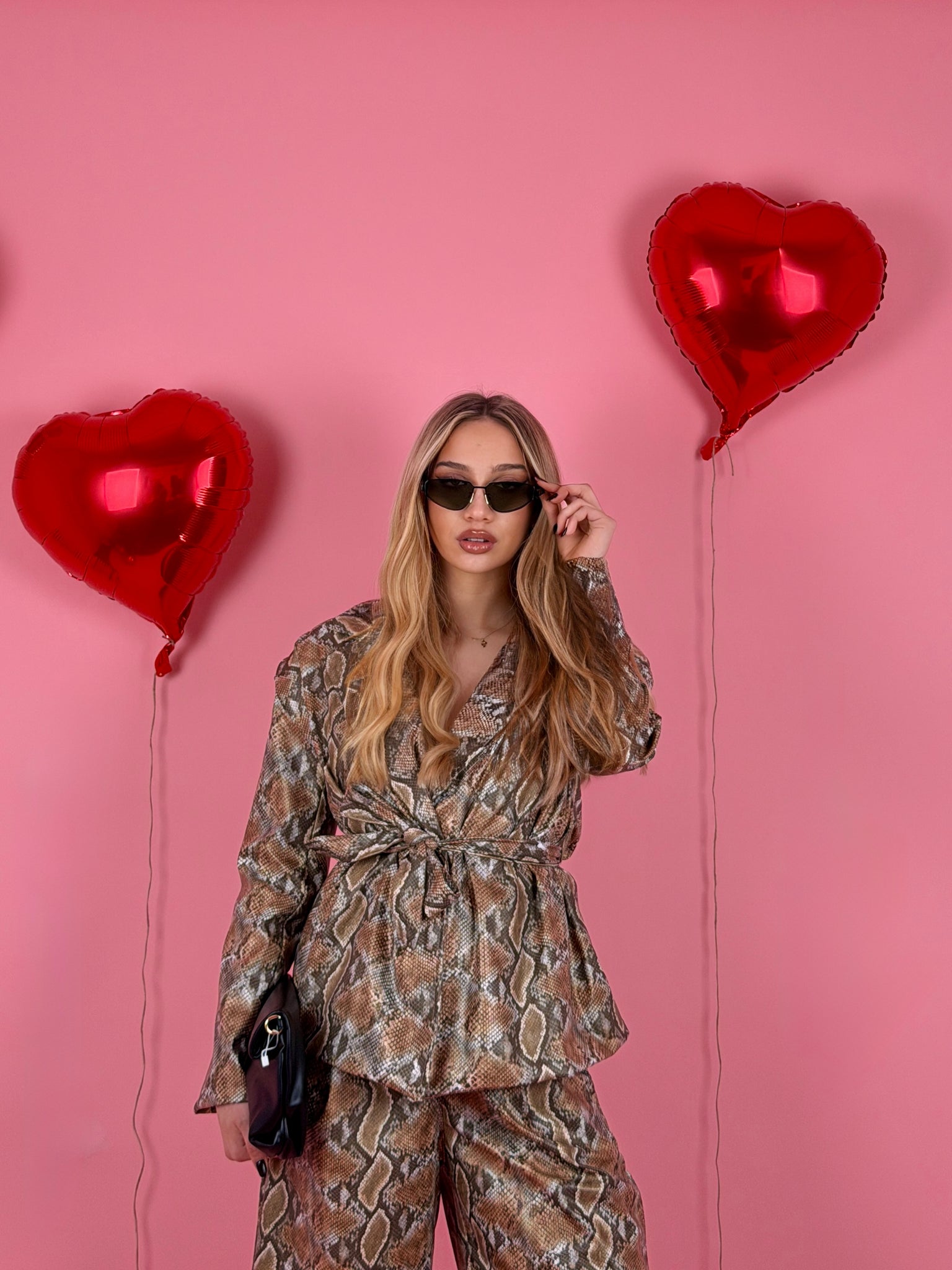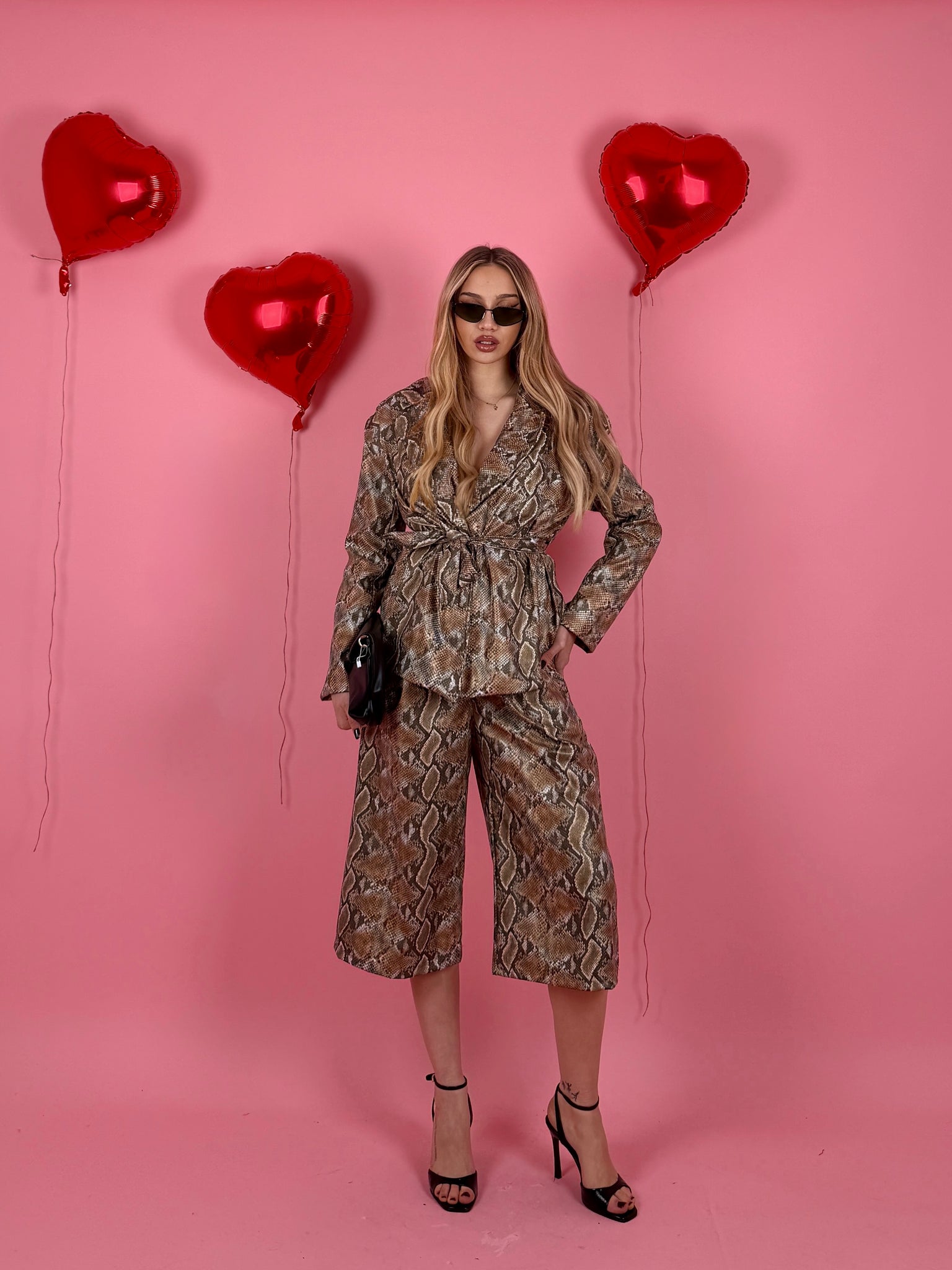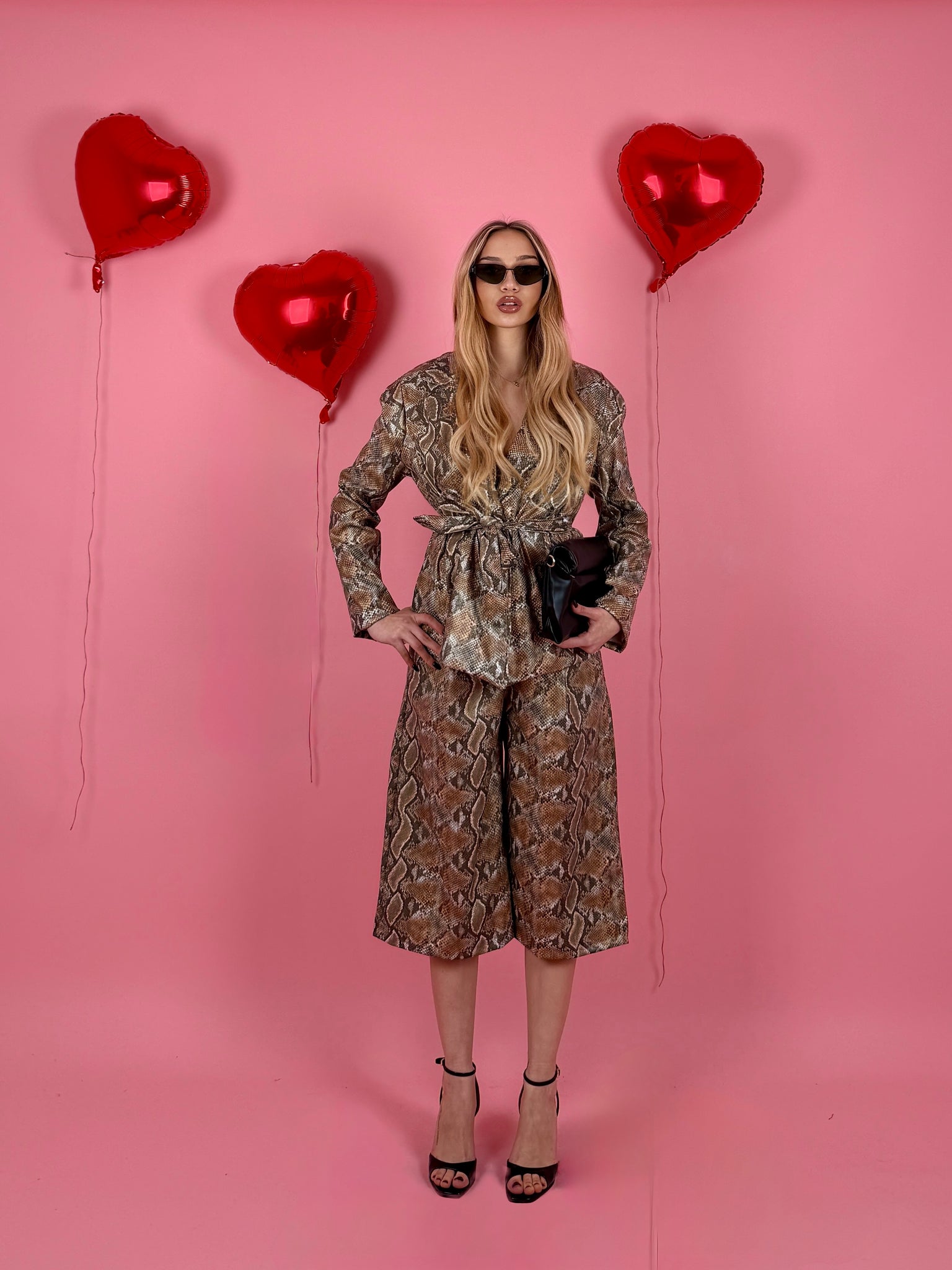 Completo in ecopelle pitonato, giacca strutturata over size con cintura in vita e foderata all’interno, spalline preformate, jorts con elastico sul retro.