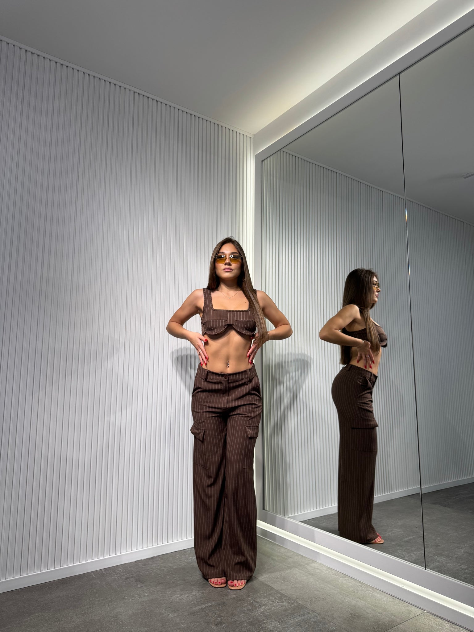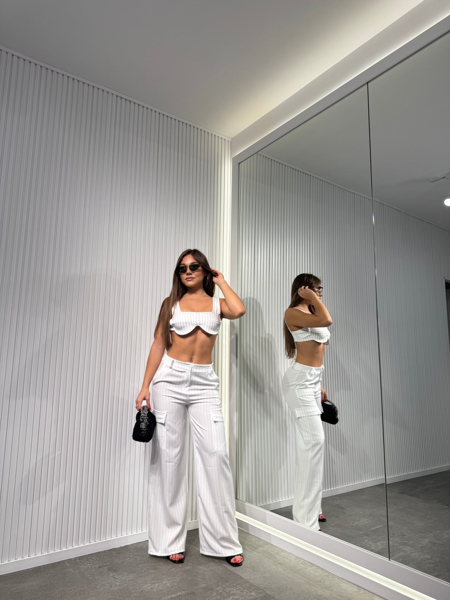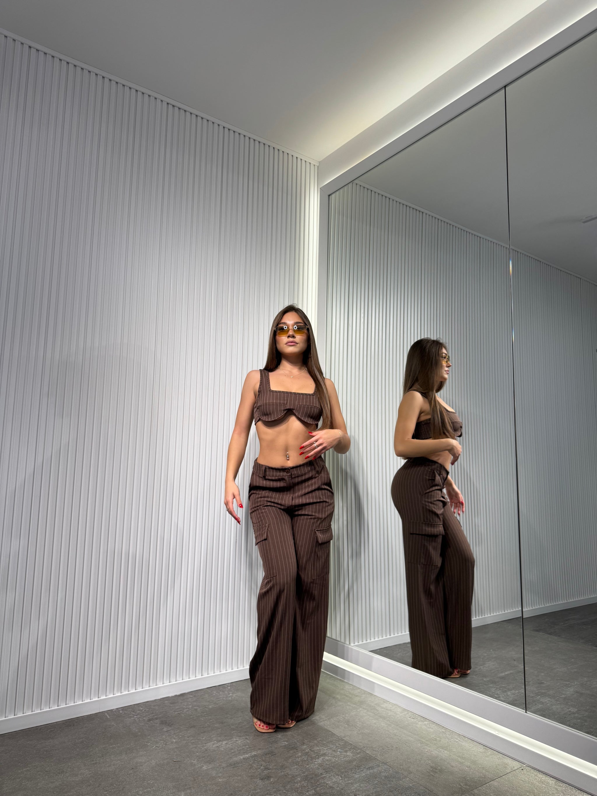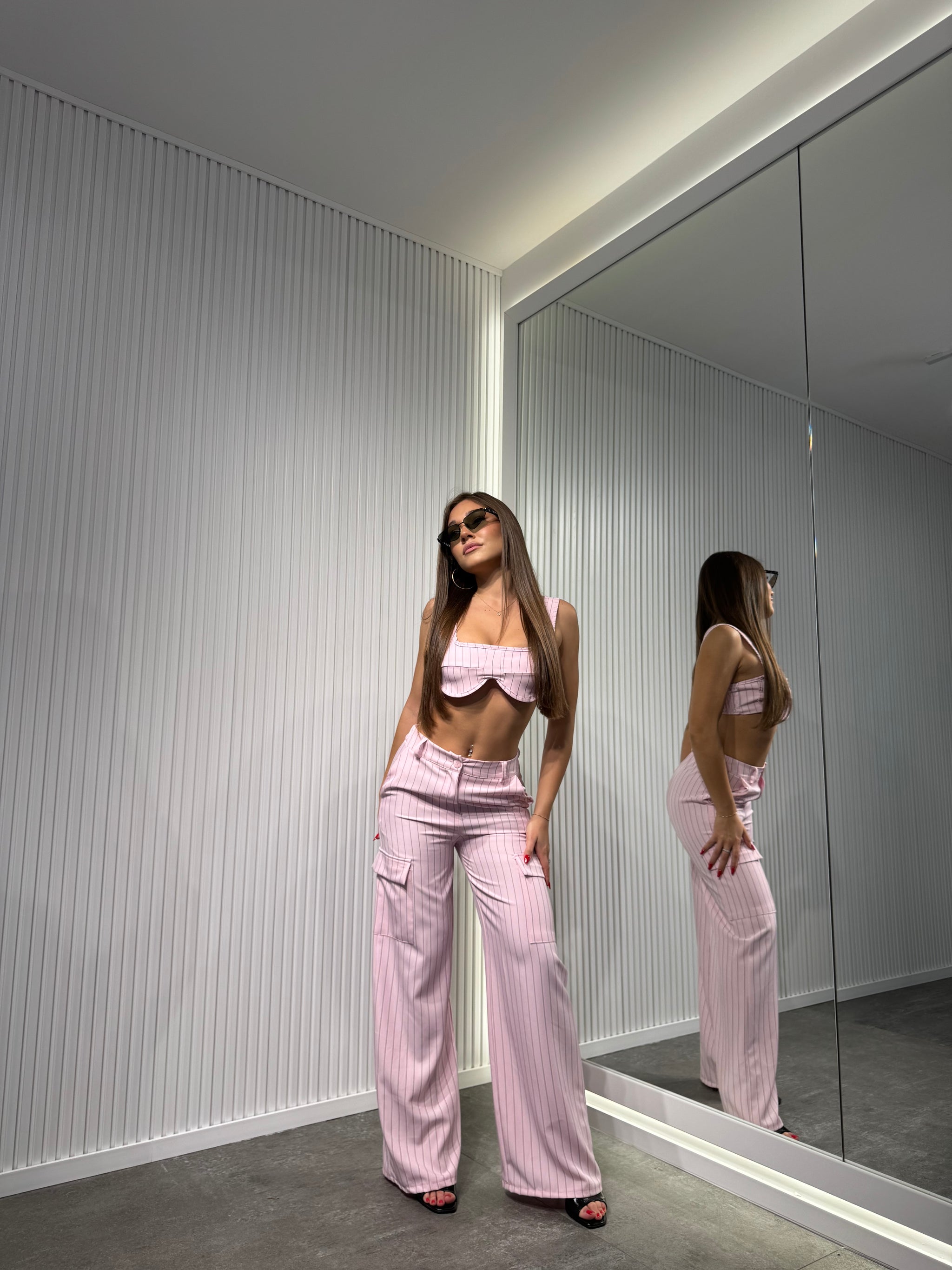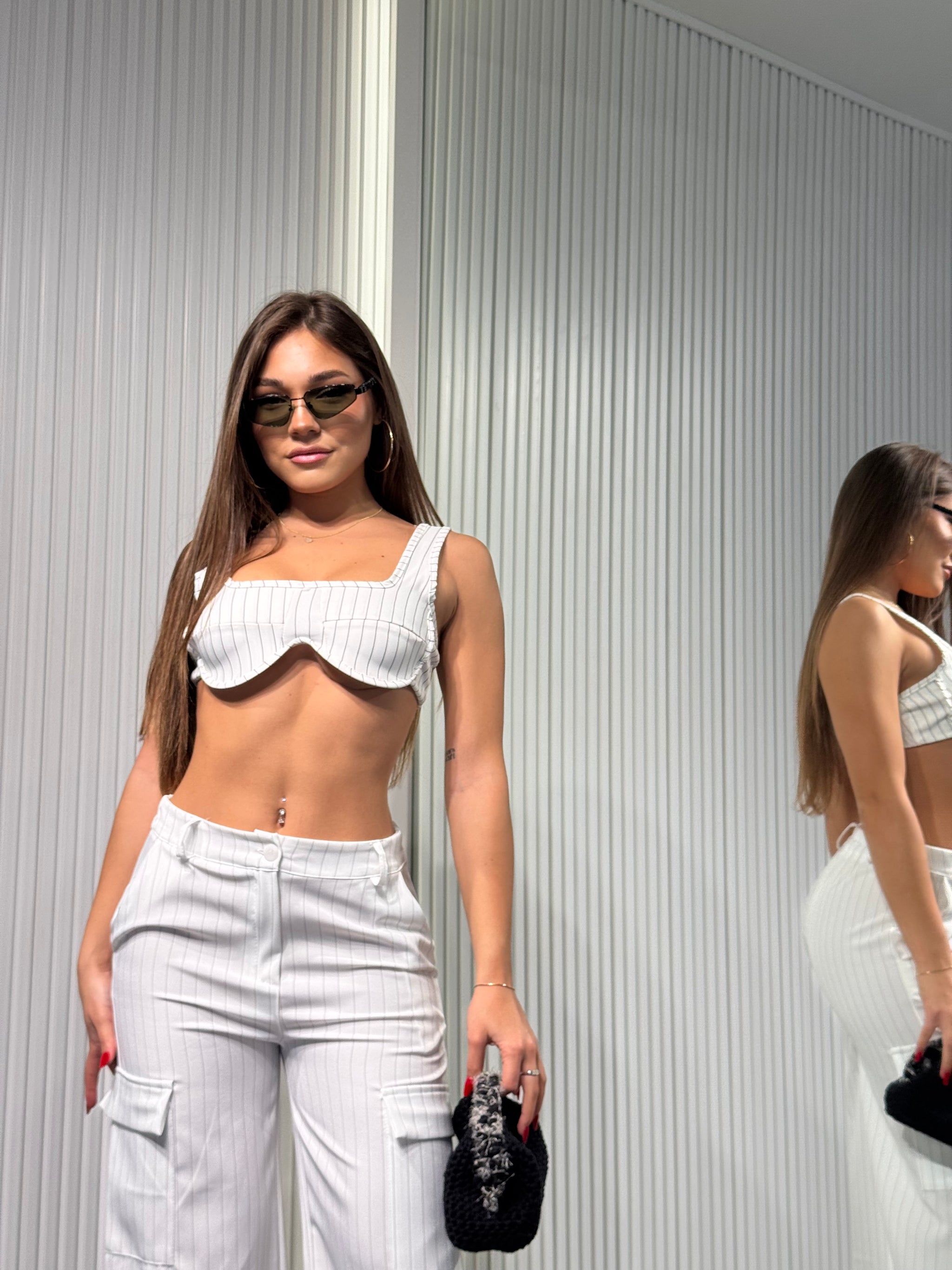 Completo in tessuto, a righe di gesso, pantalone palazzo con elastico sul retro, top sagomato