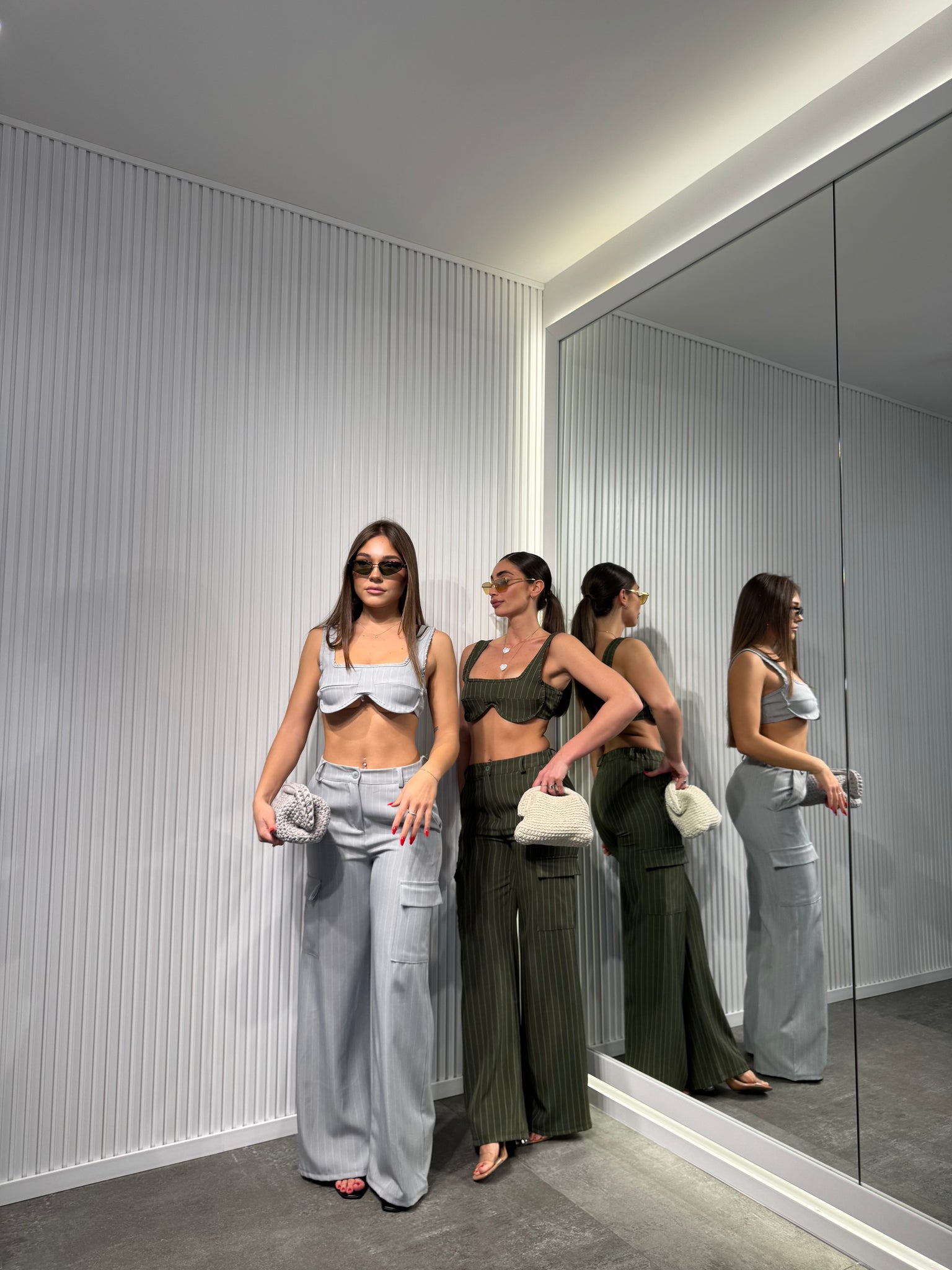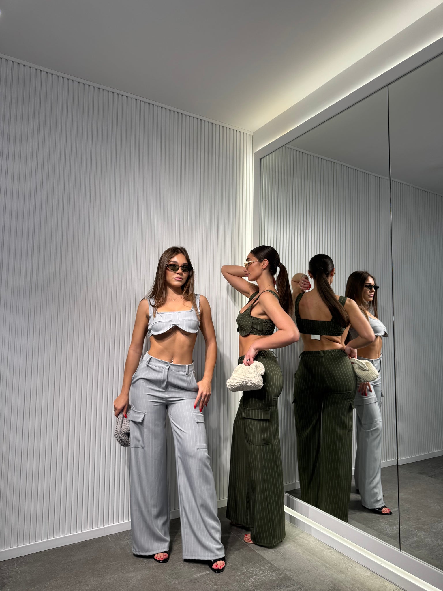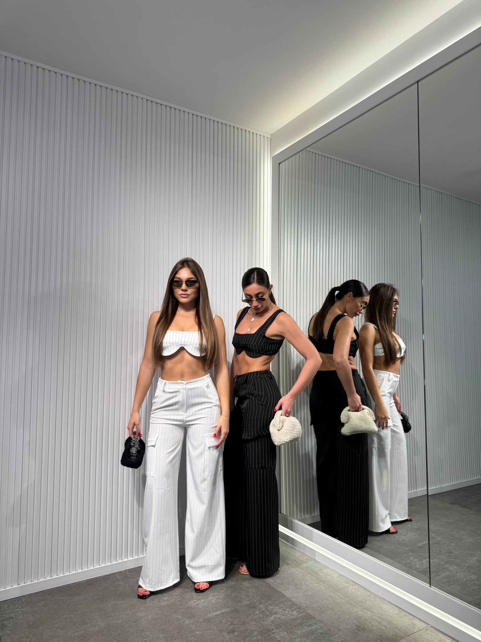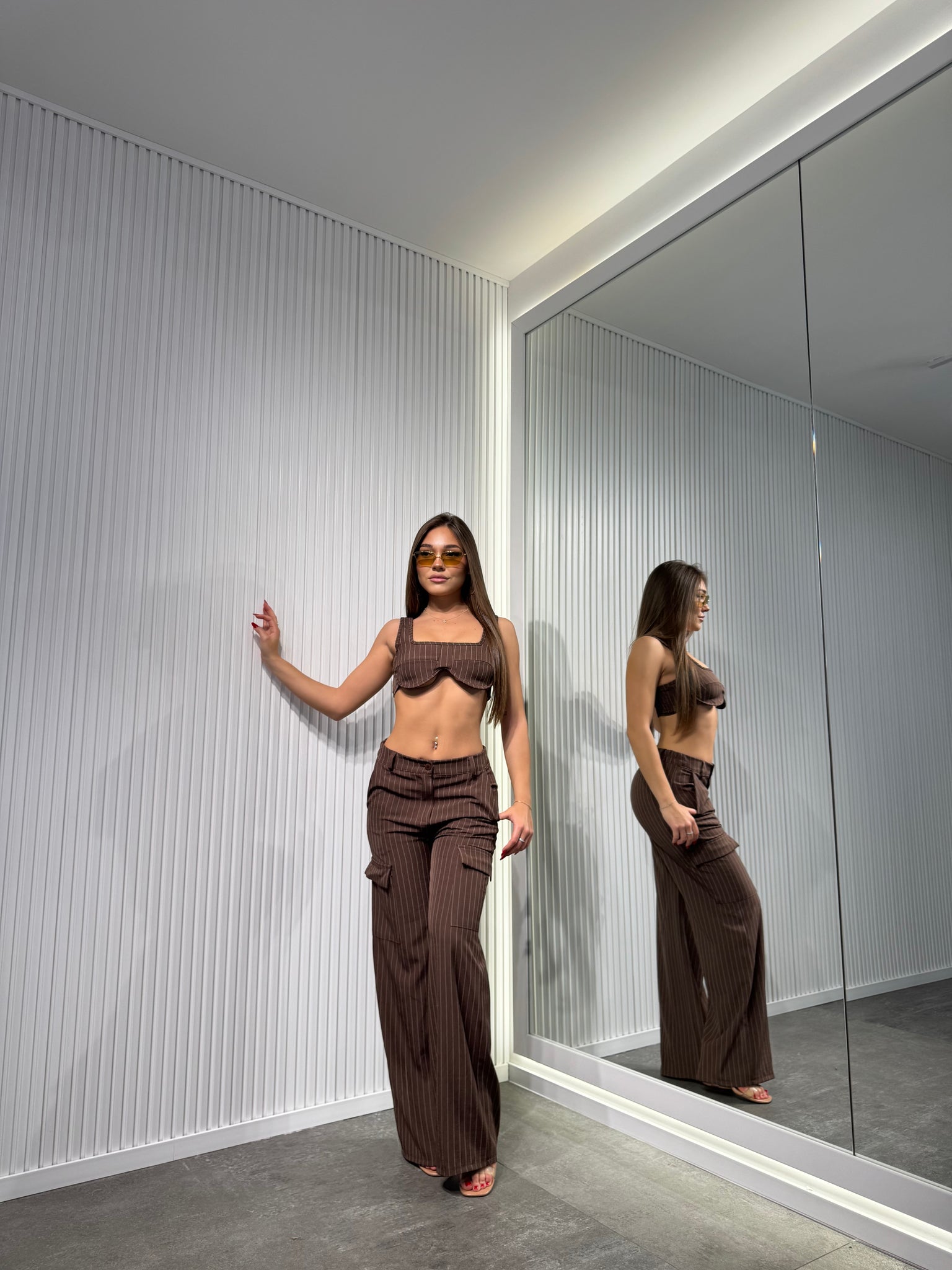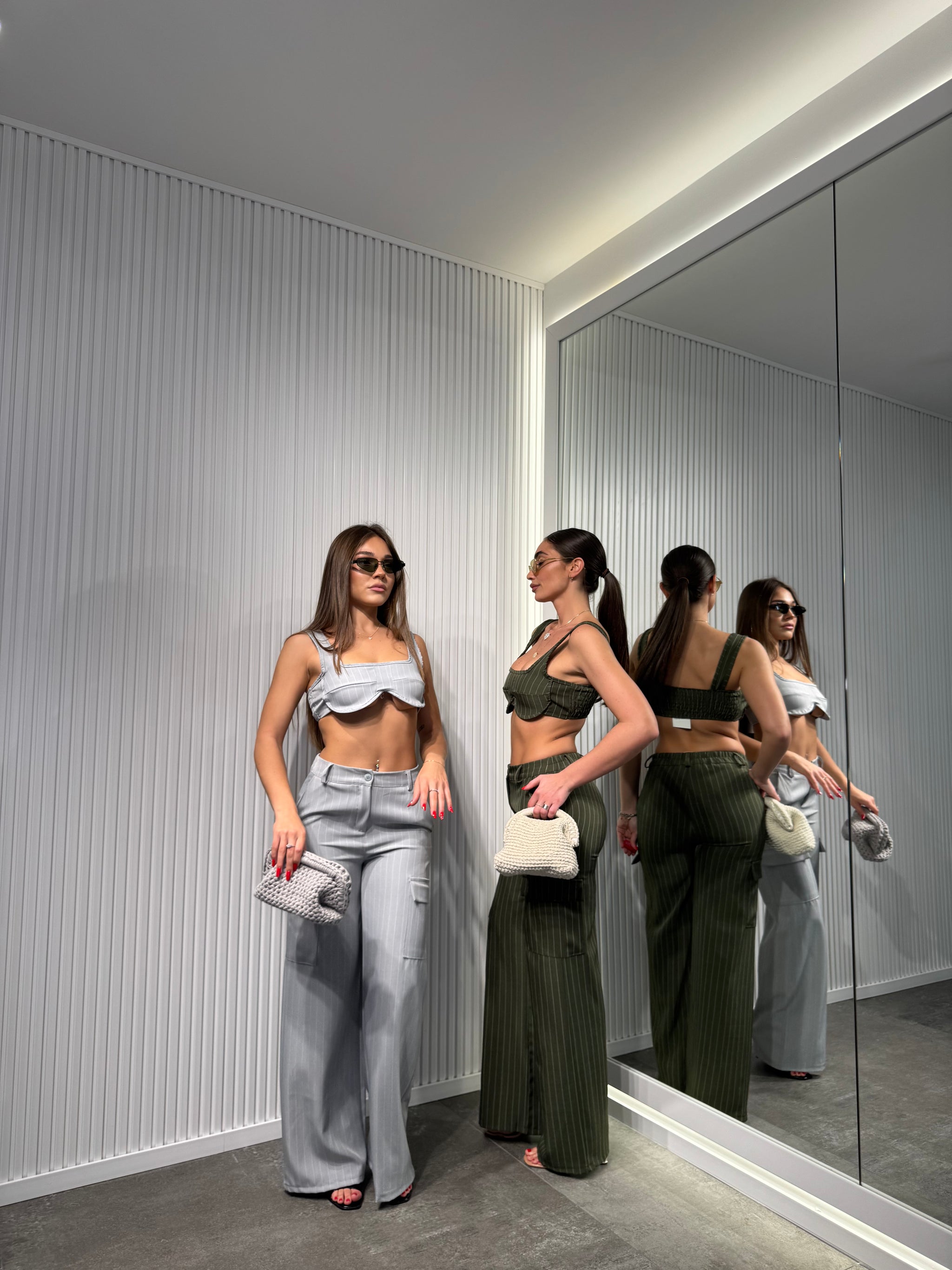 Completo in tessuto, a righe di gesso, pantalone palazzo con elastico sul retro, top sagomato