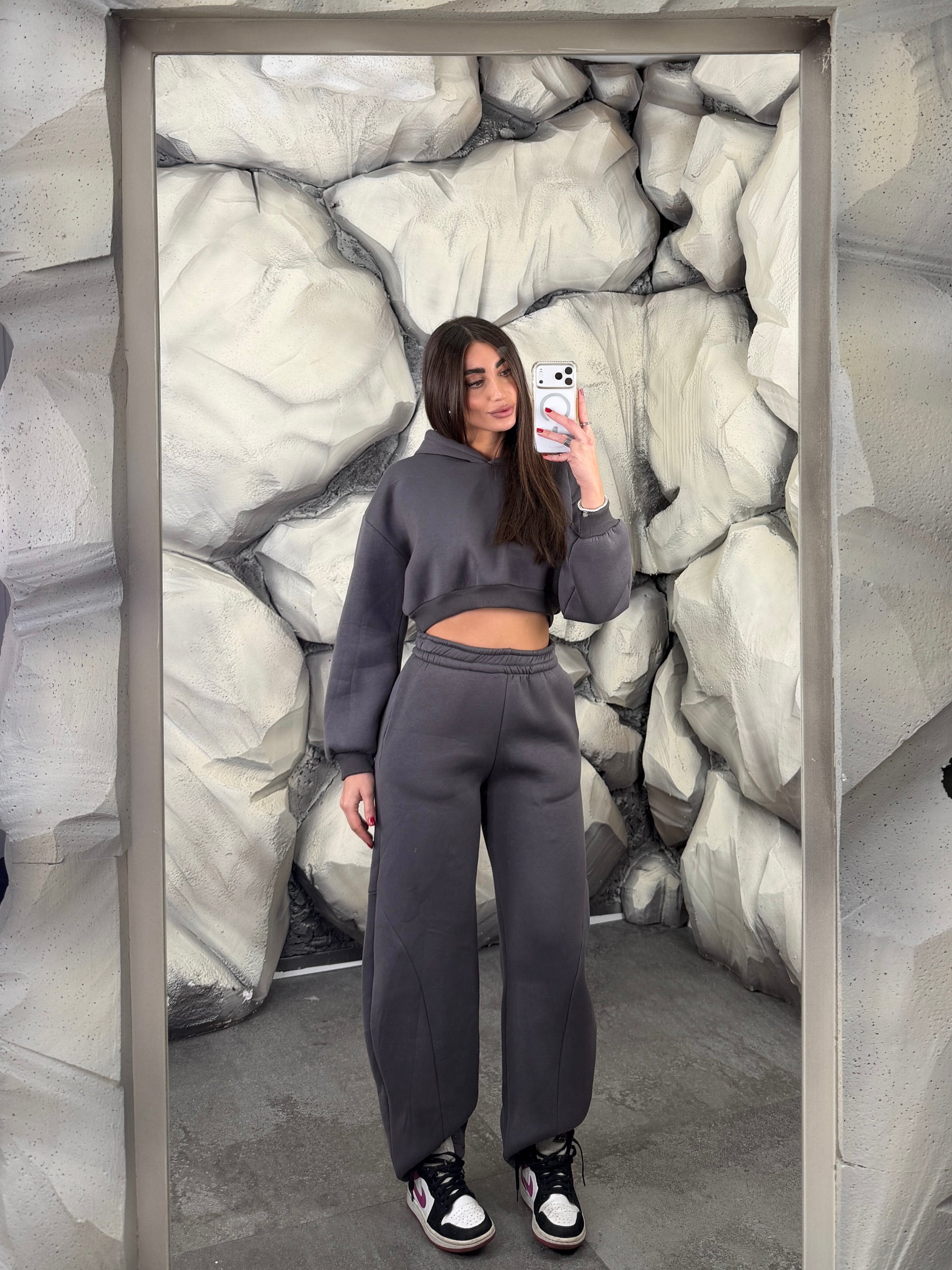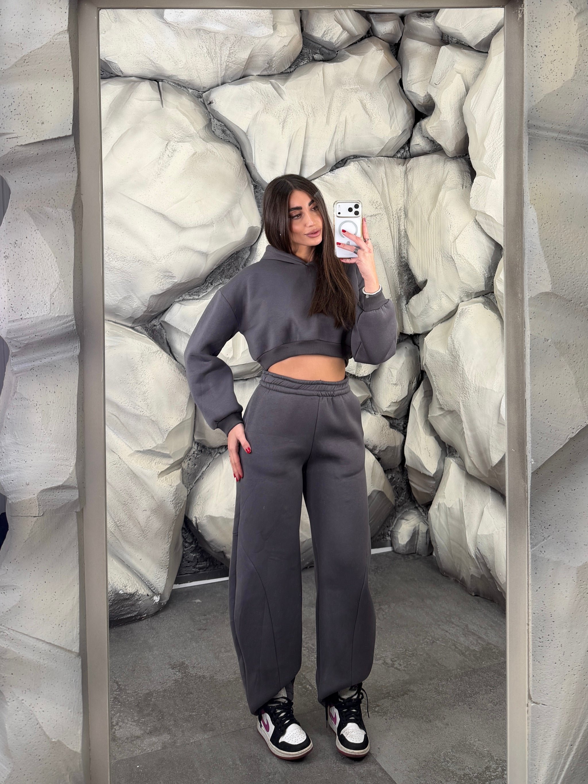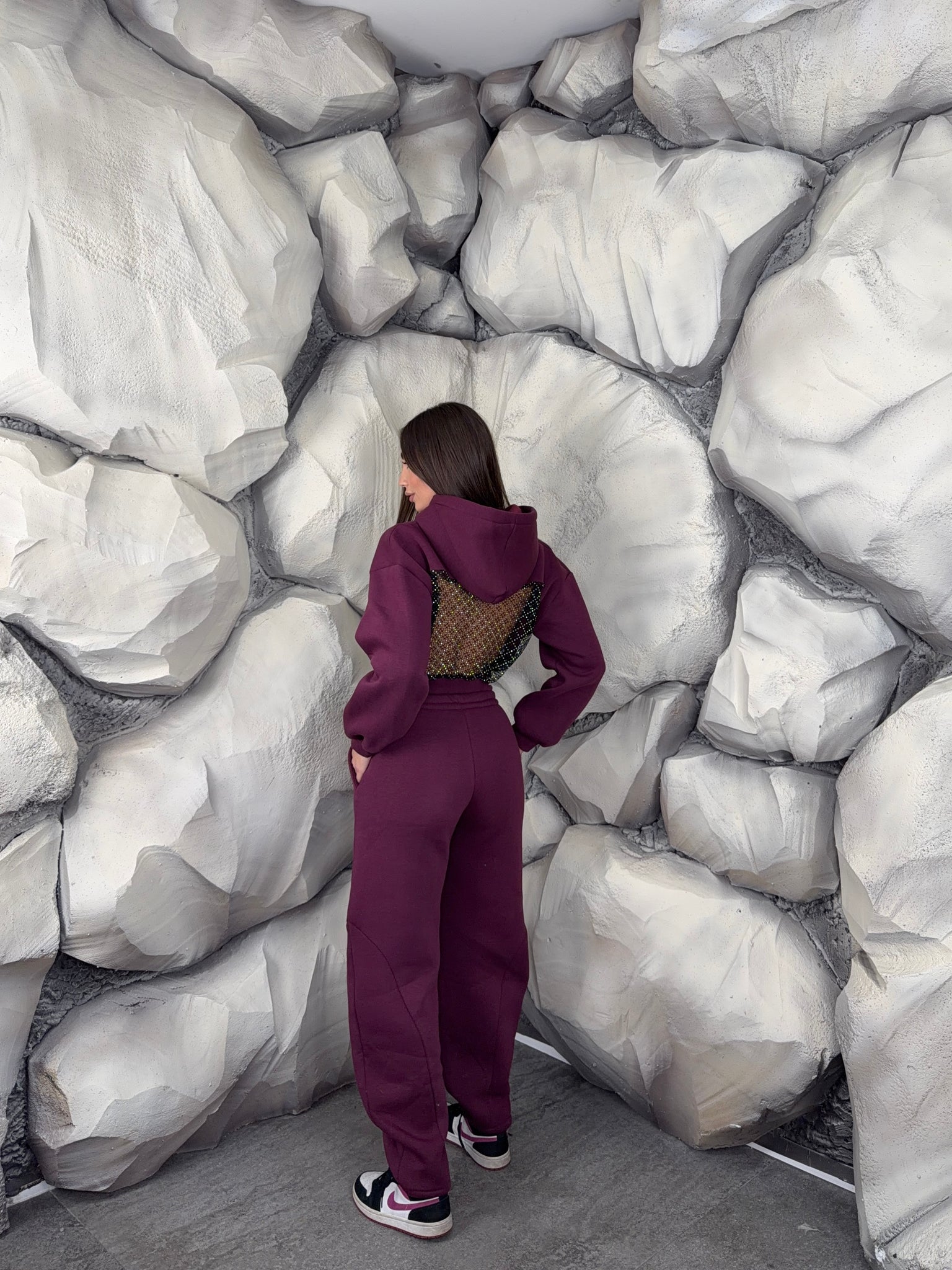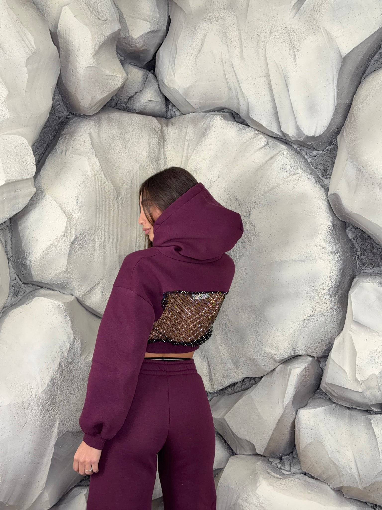 Completo tuta con pantalone ballon e felpa crop con cappuccio. Schiena tessuto rete con brillantini