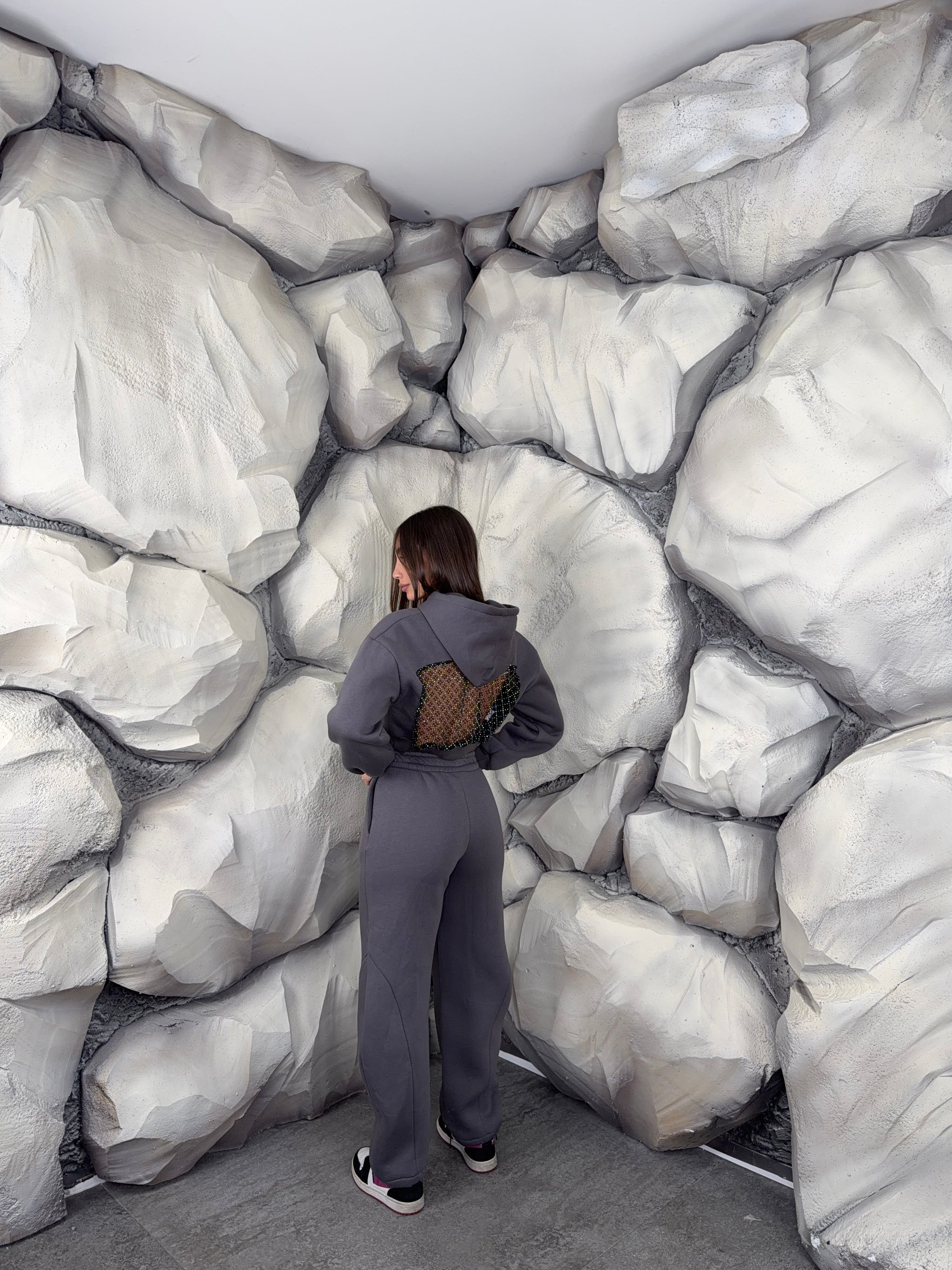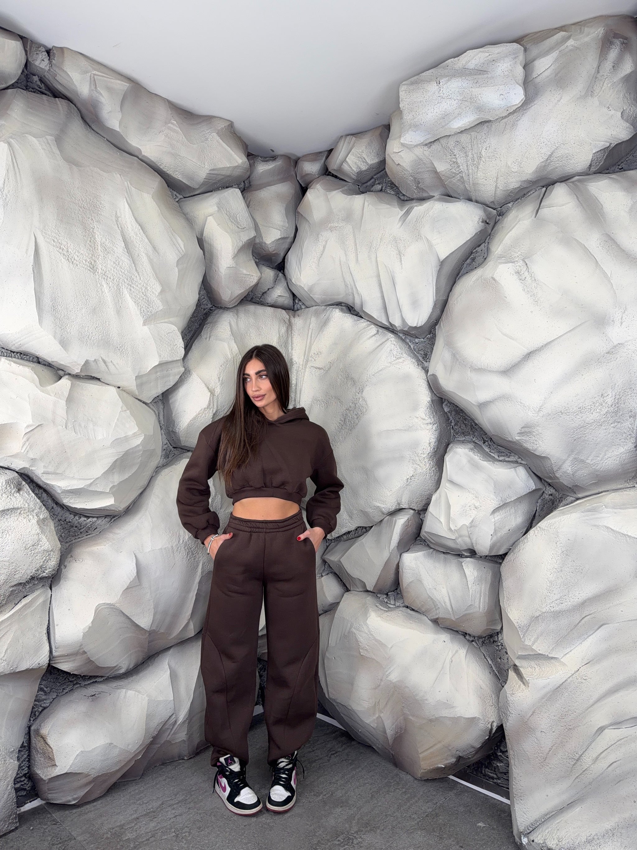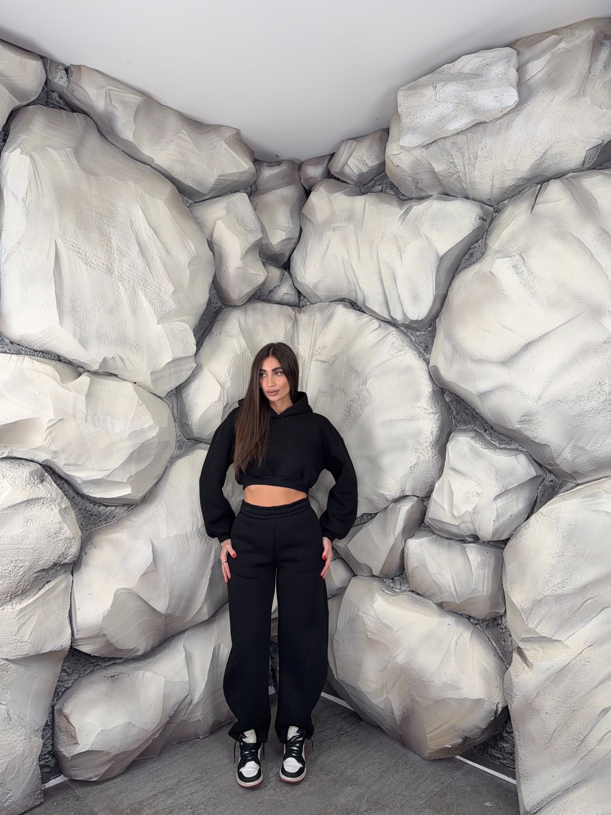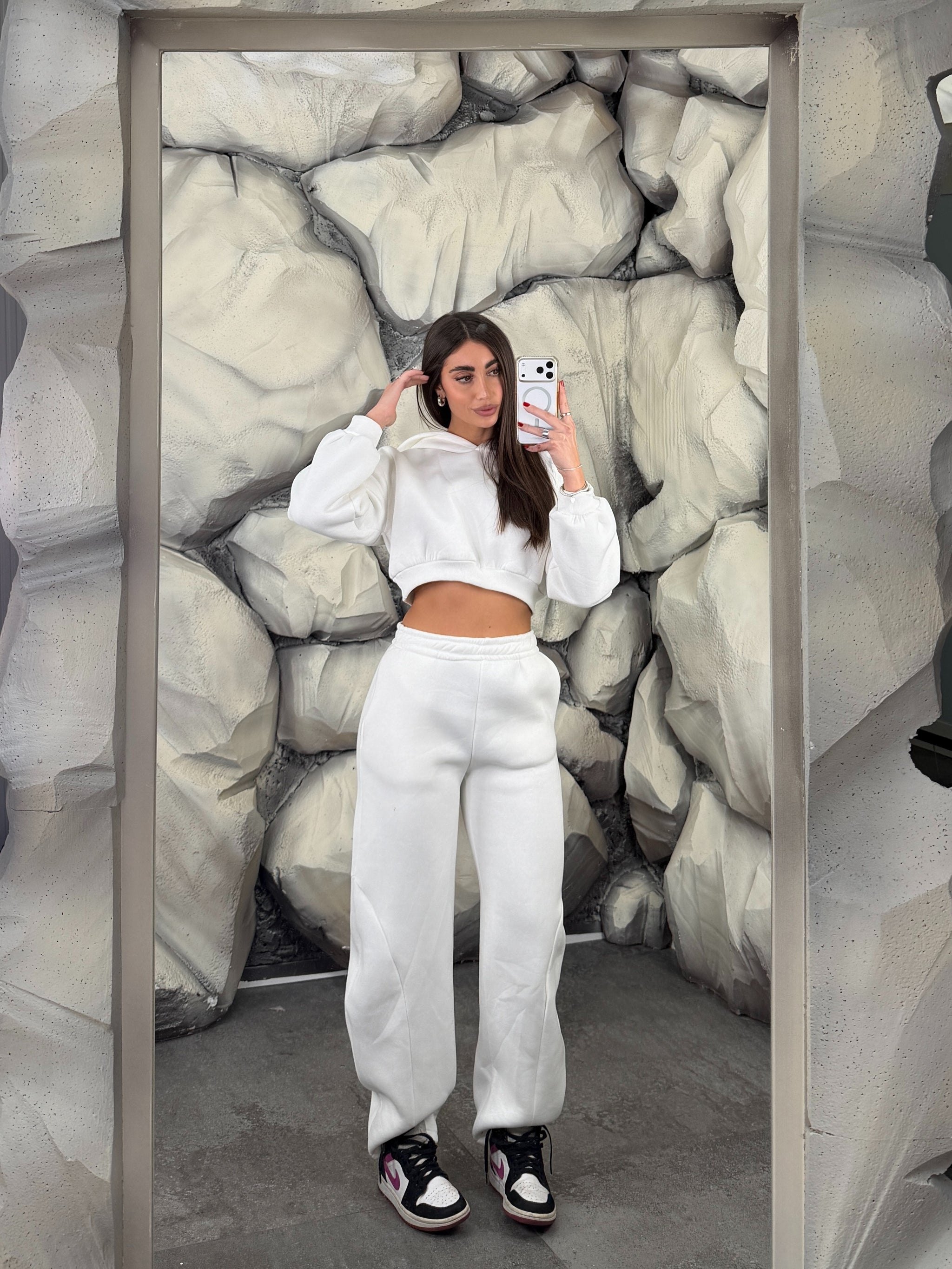Completo tuta con pantalone ballon e felpa crop con cappuccio. Schiena tessuto rete con brillantini