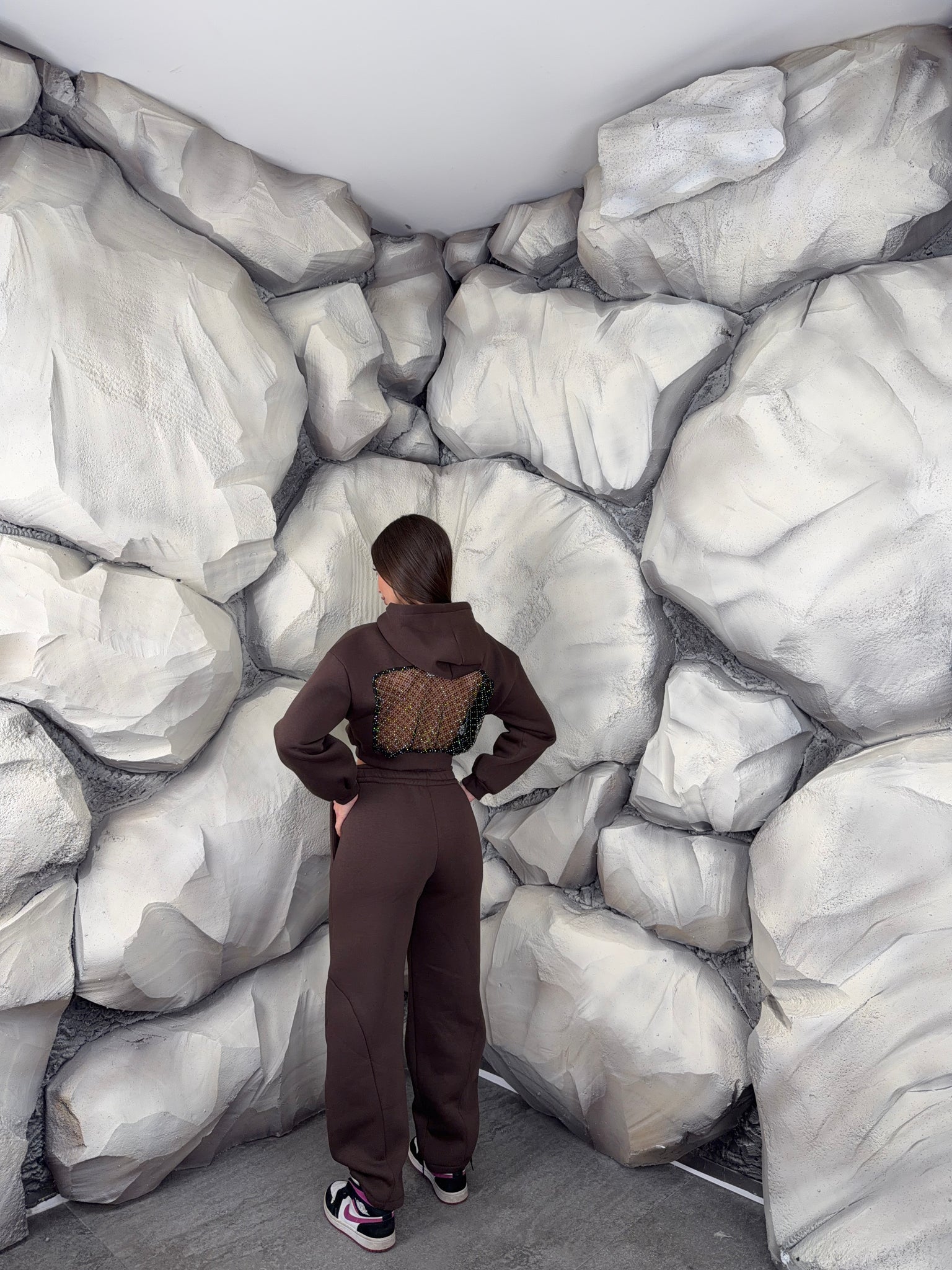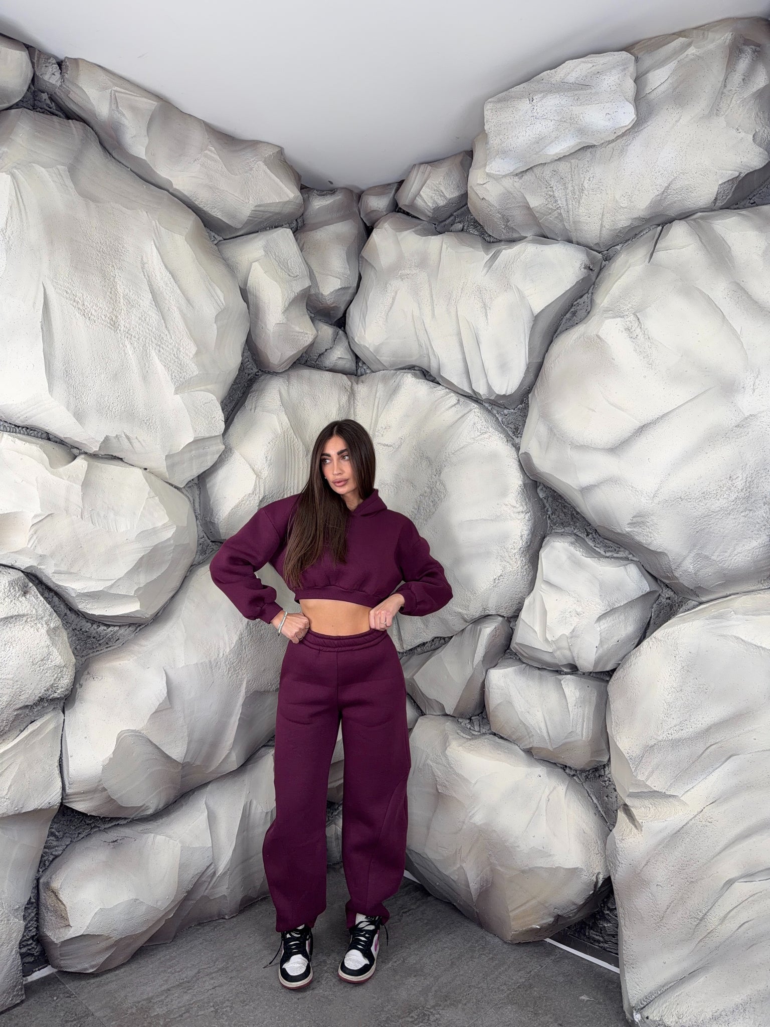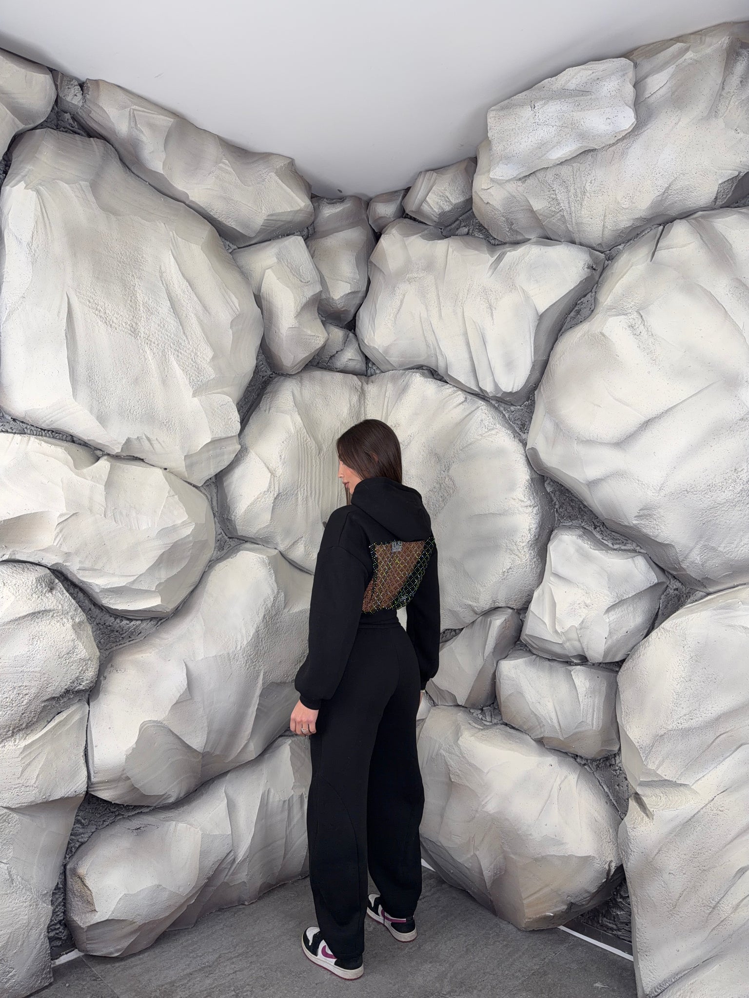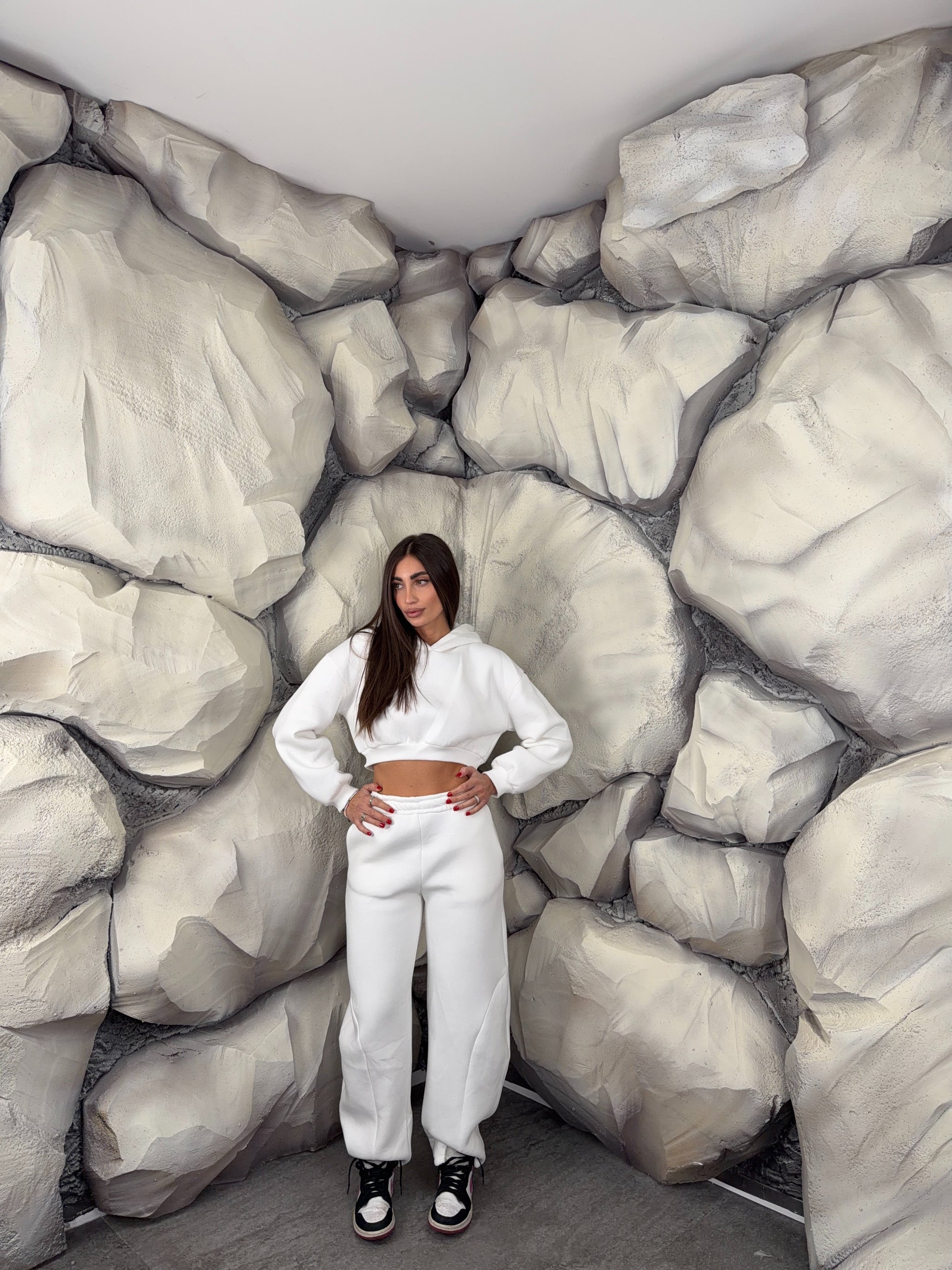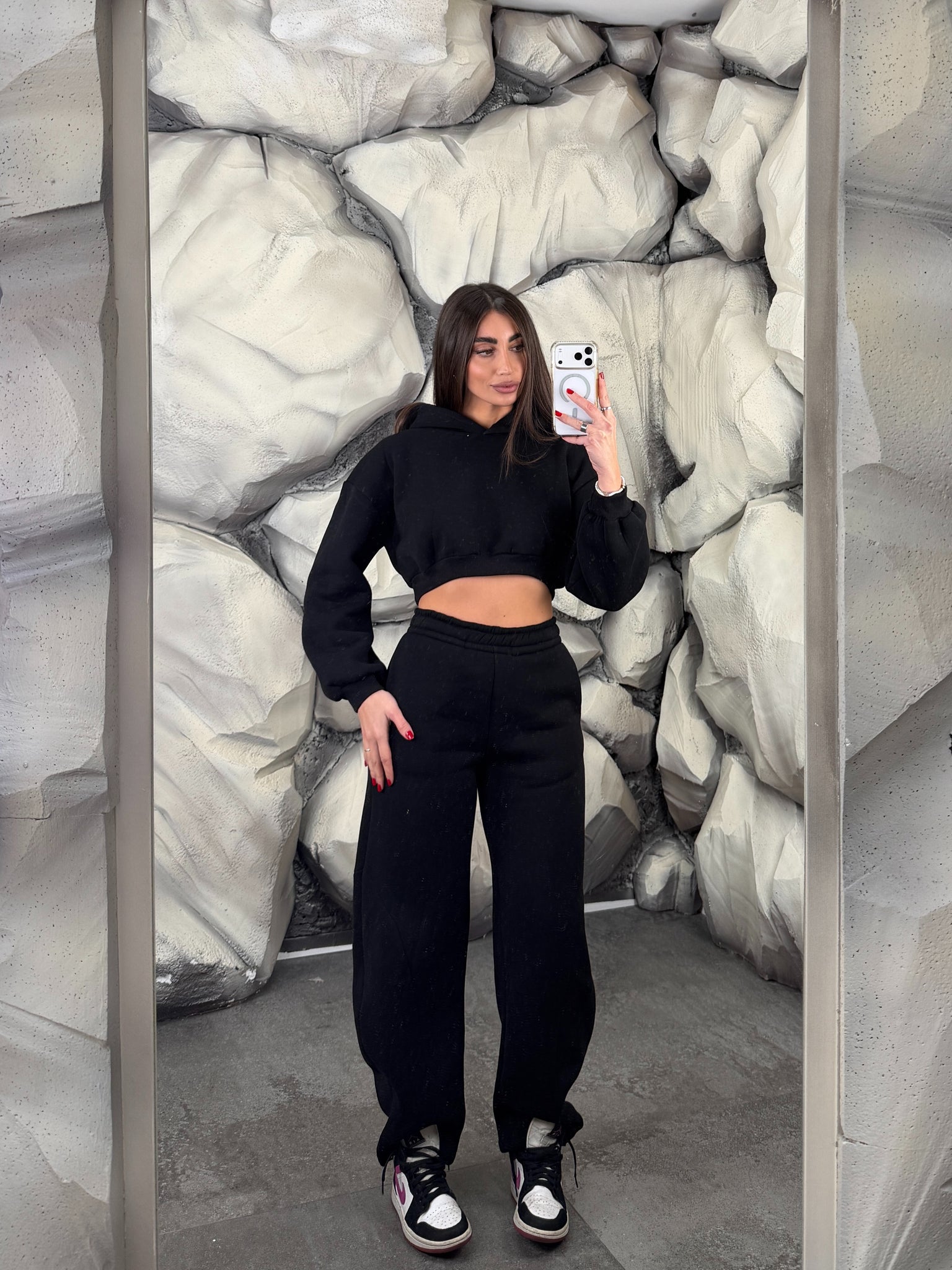Completo tuta con pantalone ballon e felpa crop con cappuccio. Schiena tessuto rete con brillantini
