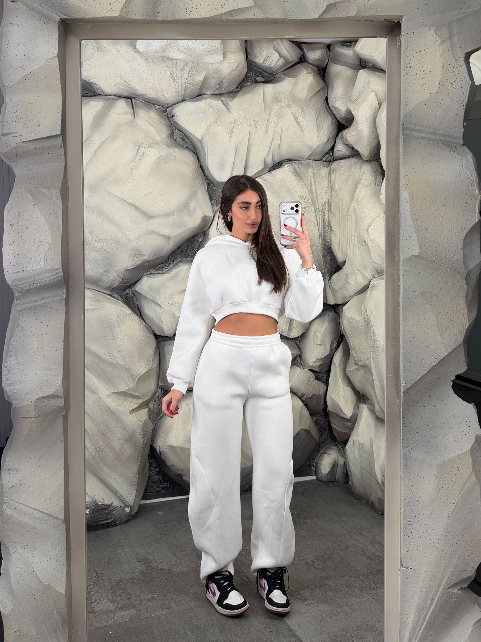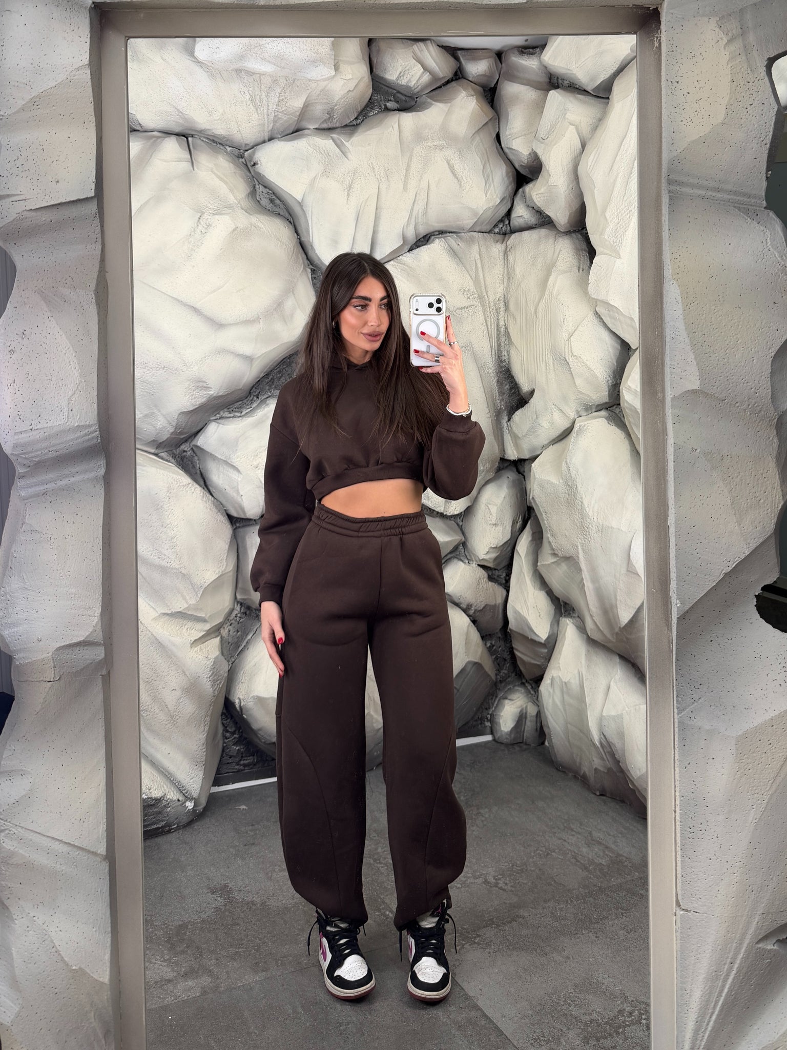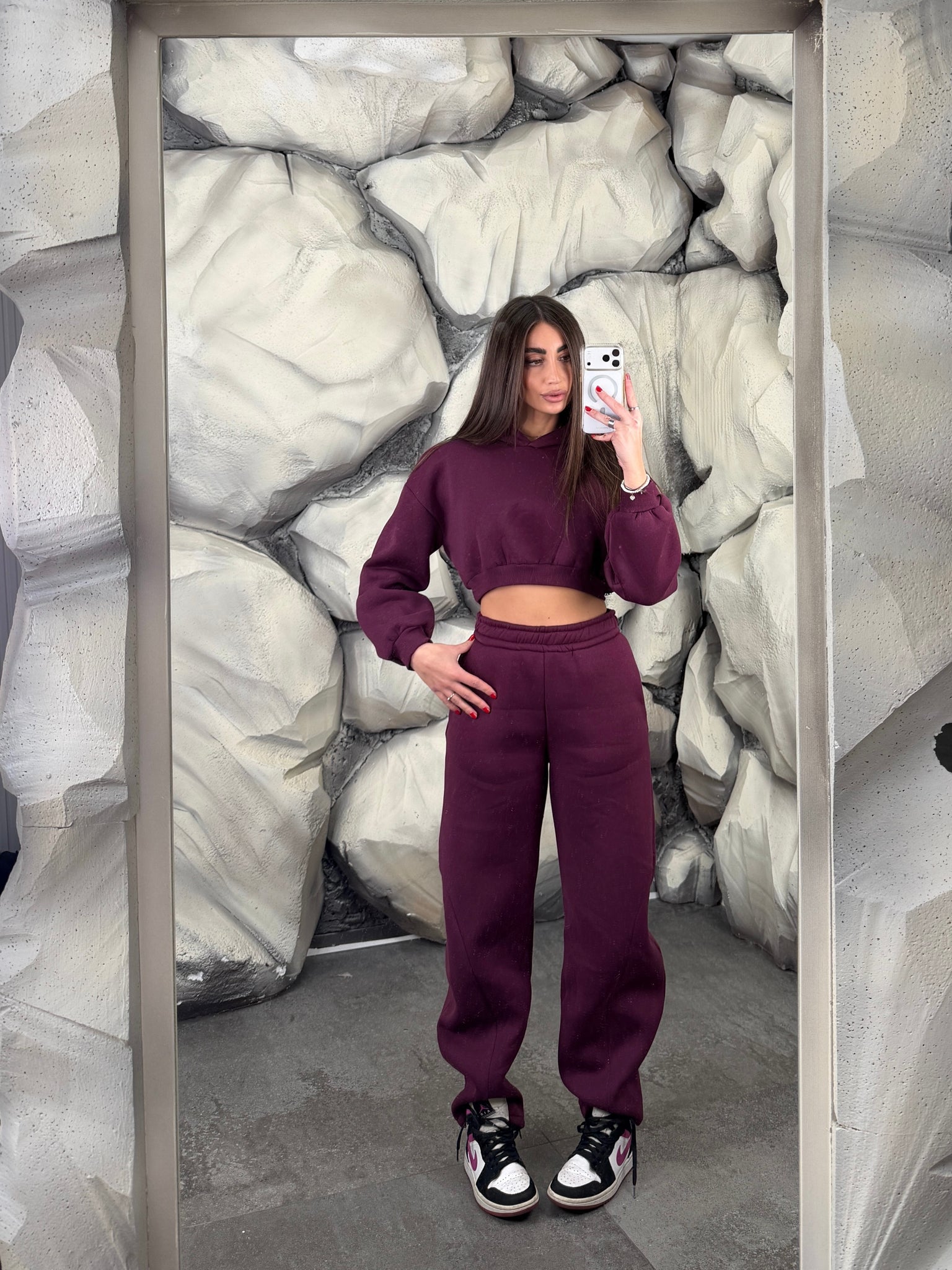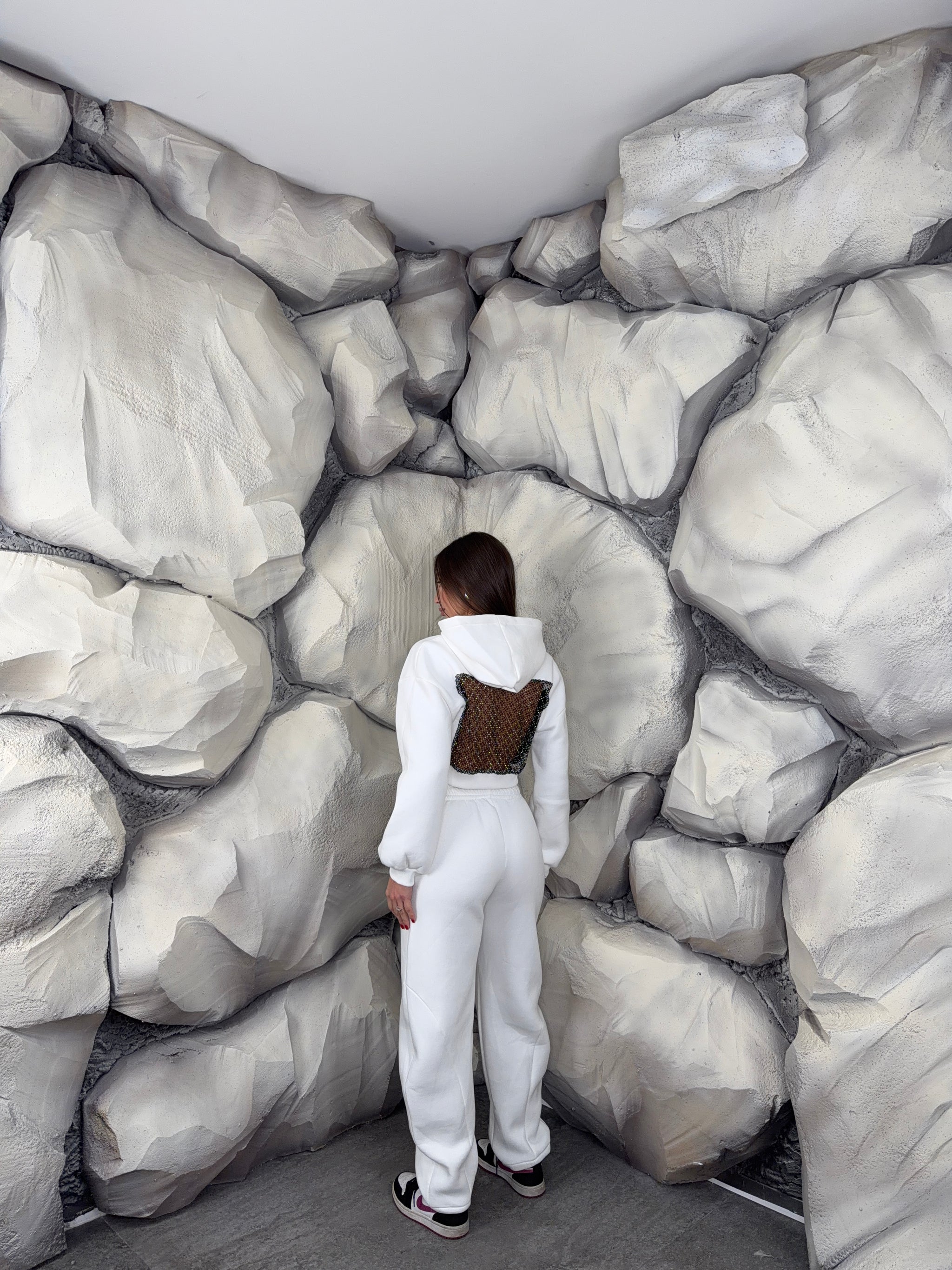 Completo tuta con pantalone ballon e felpa crop con cappuccio. Schiena tessuto rete con brillantini