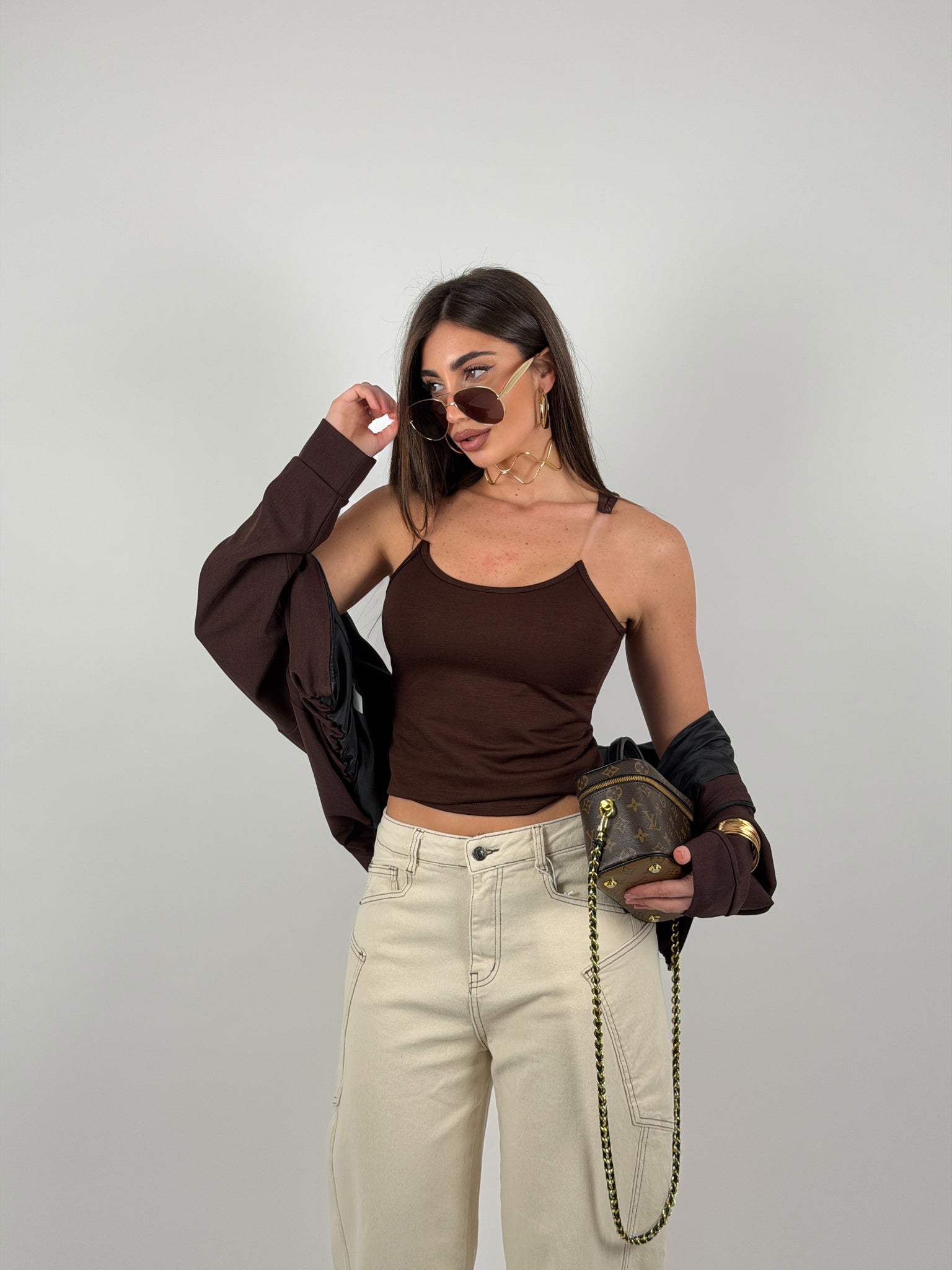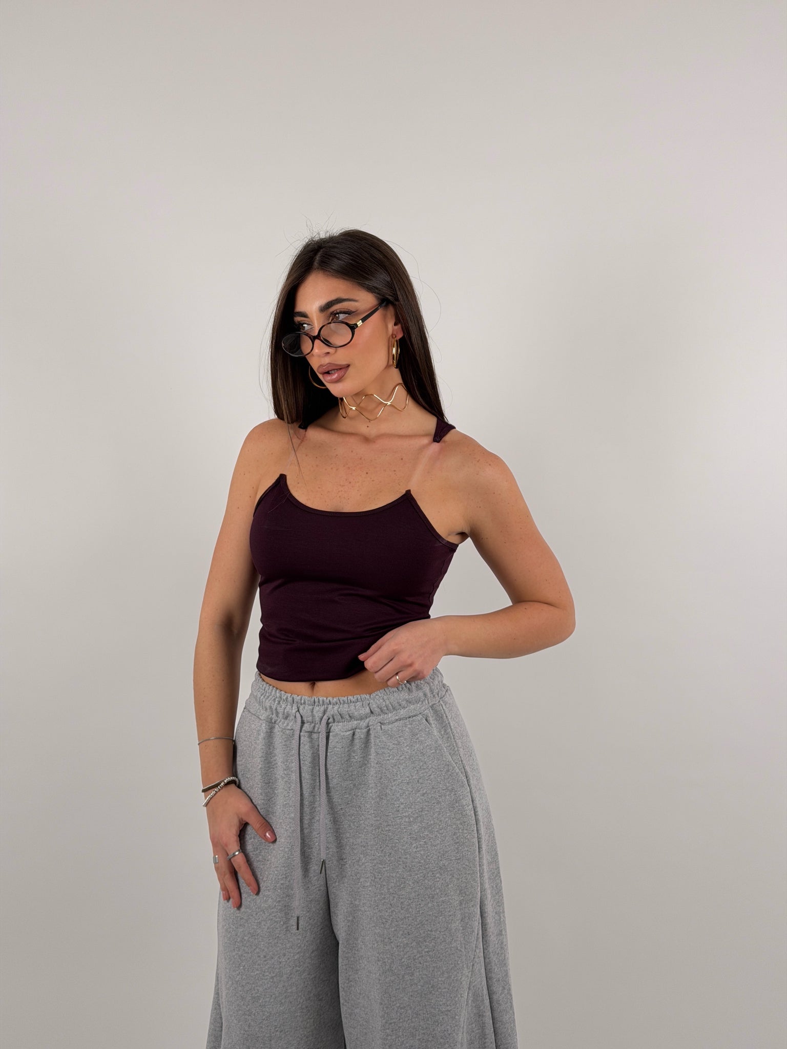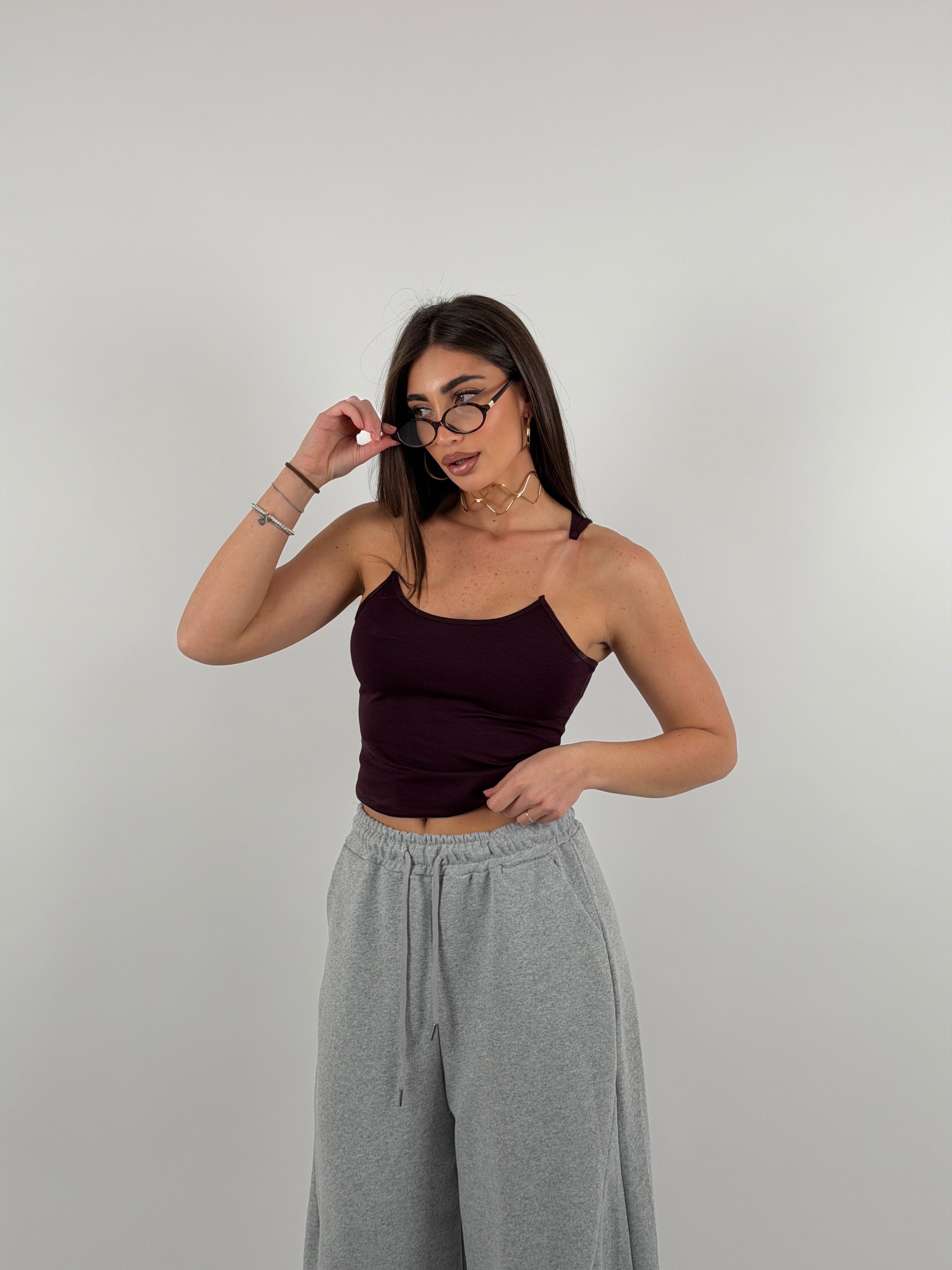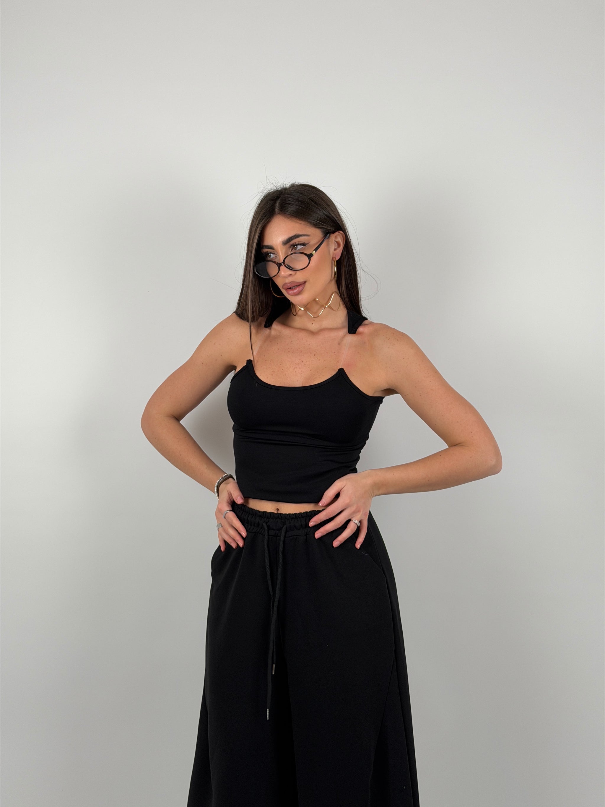 Top in cotone a costine (poco elastico) con bretelle in silicone trasparente. Il fatto che sia poco elastico permette una vestibilità pushup