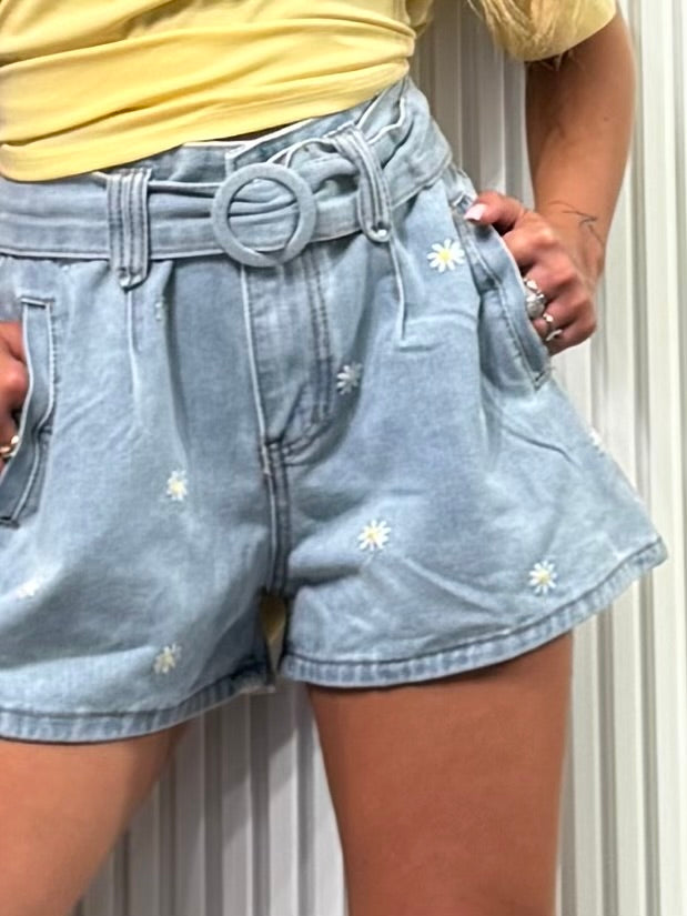 Pantaloncino di jeans, tessuto fermo, dettaglio ricami di margherite, cinturone in vita.