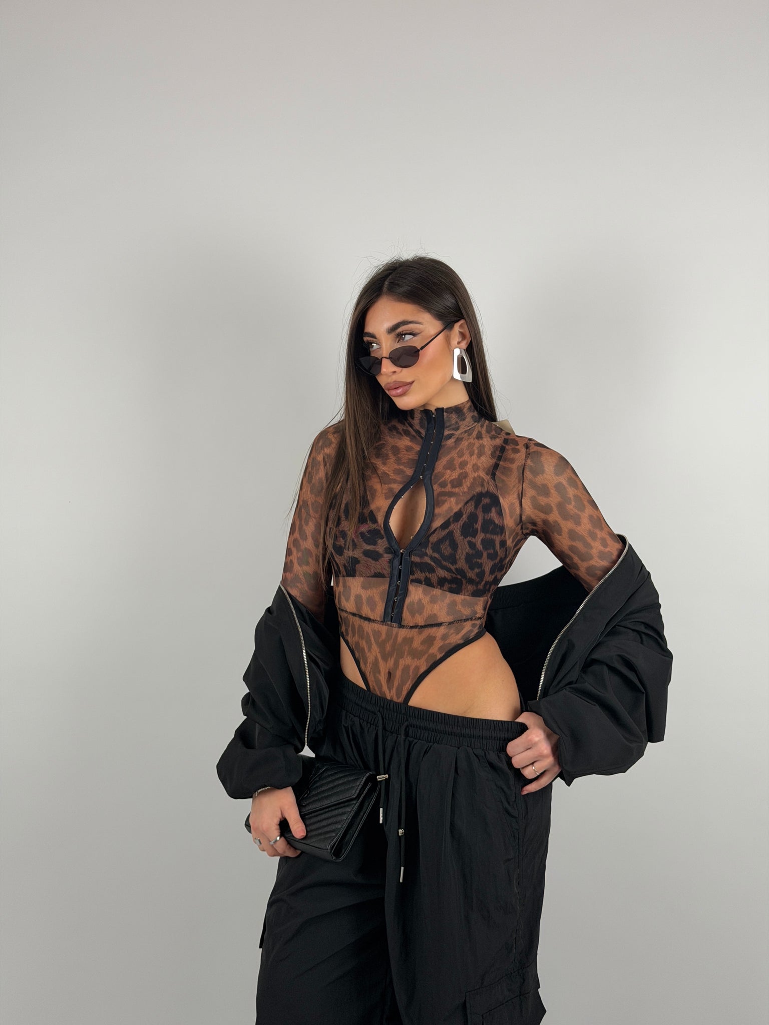 Body velato con ganci sul davanti, colletto e manica lunga, sgambato.