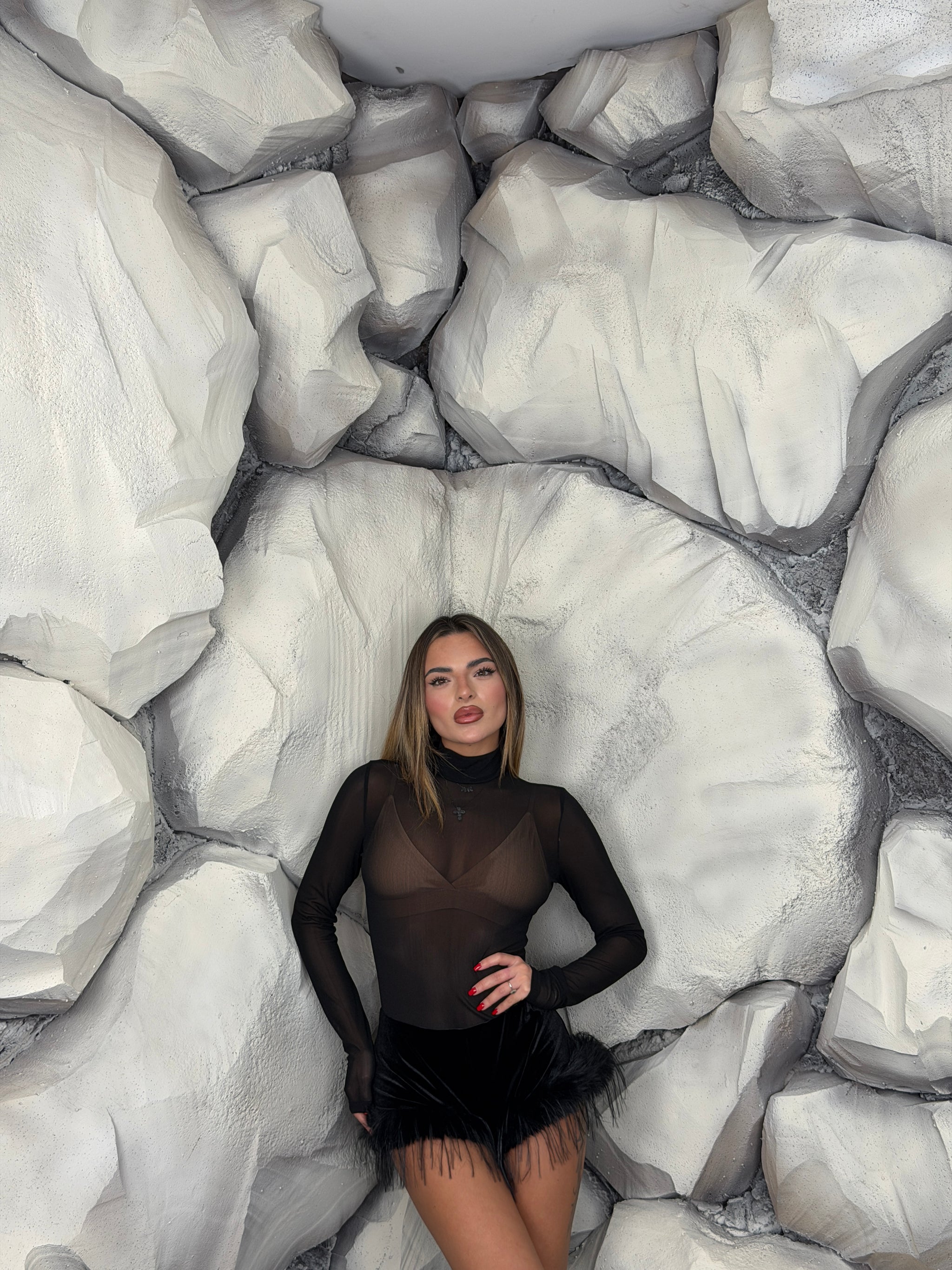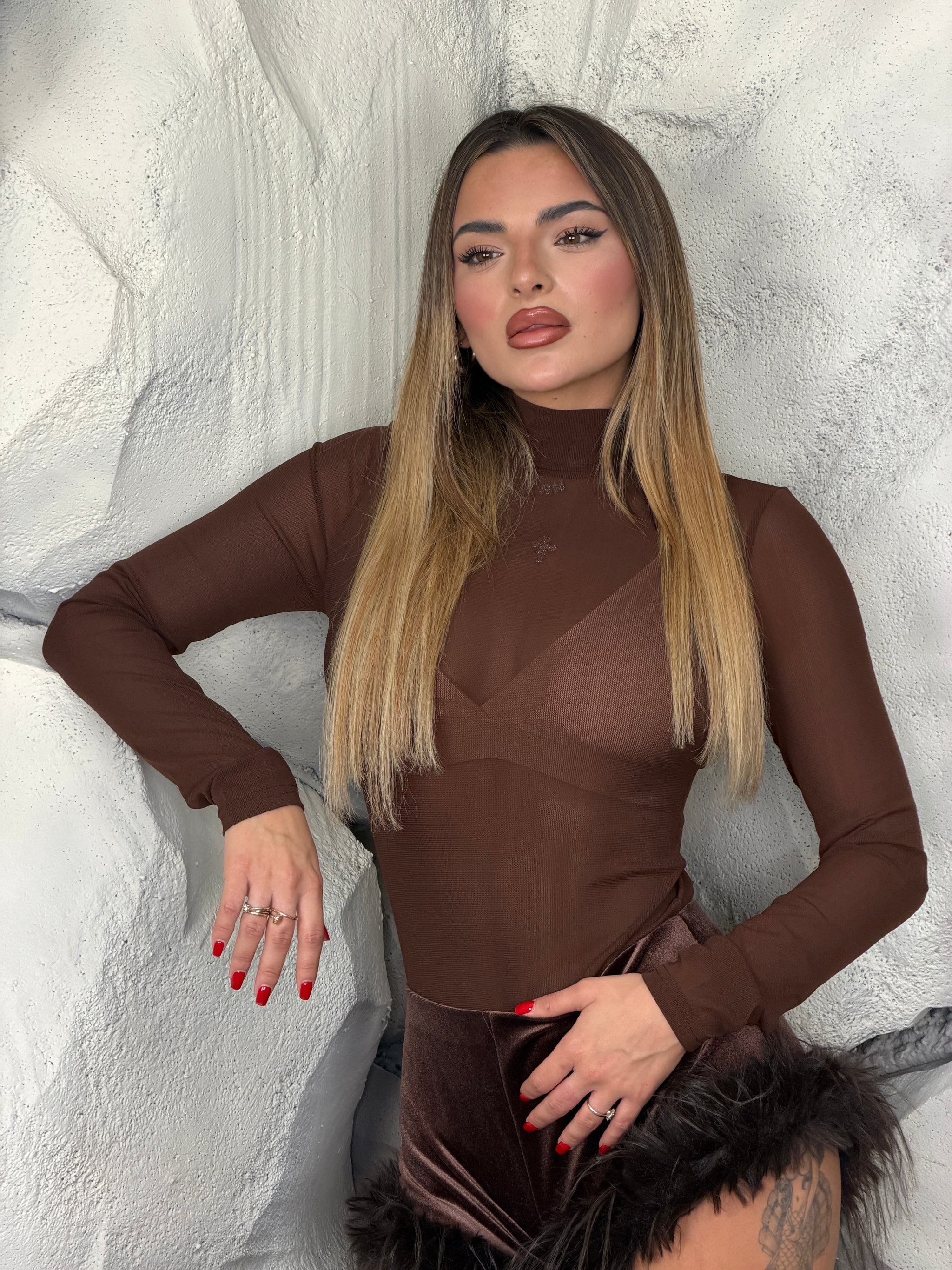 Body di velo, con colletto a manica lunga, leggermente elastico.