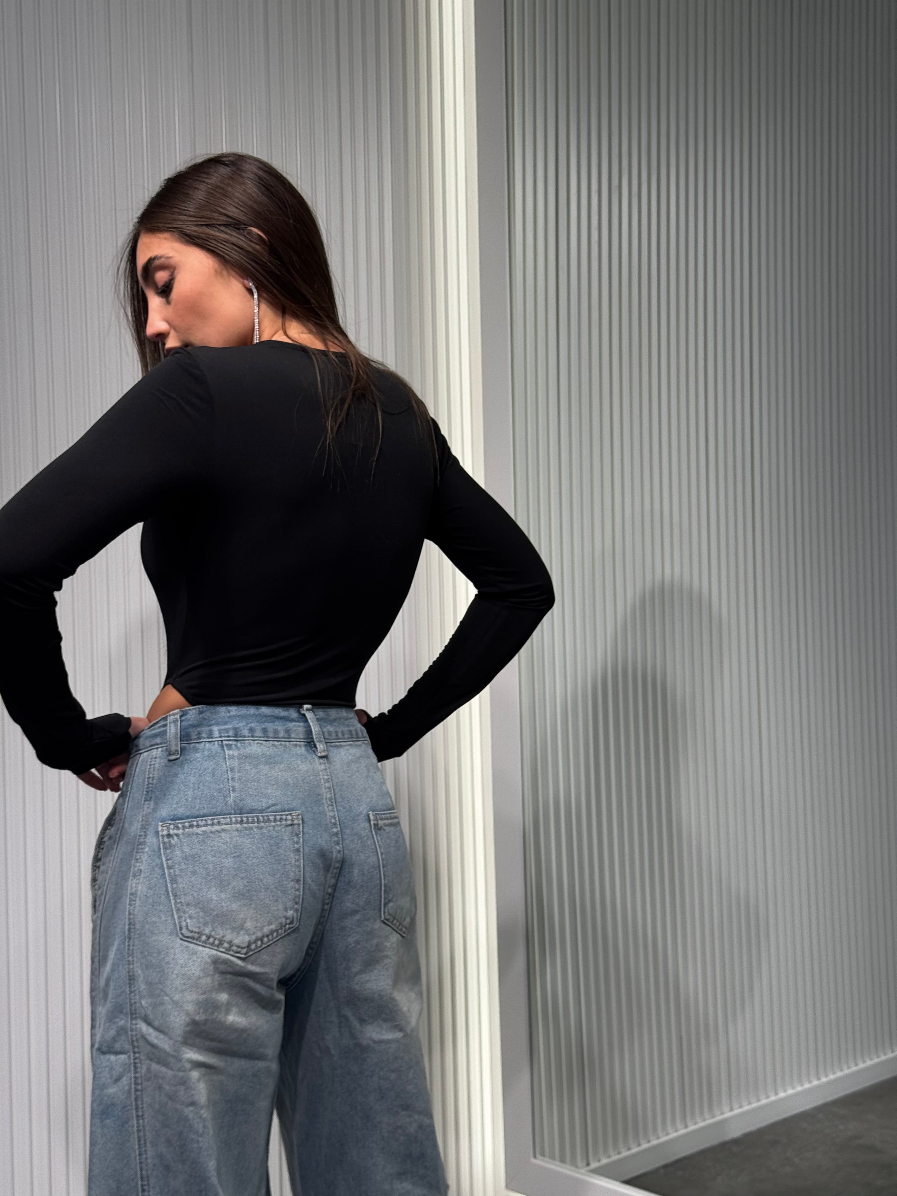 Body in lycra, manica lunga, scollo profondo, con particolarità in merletto