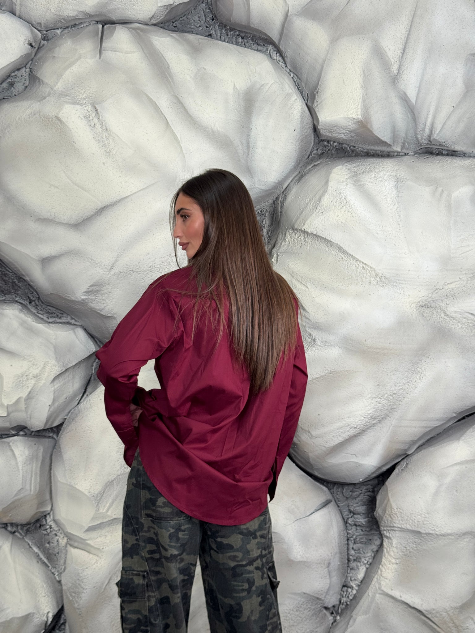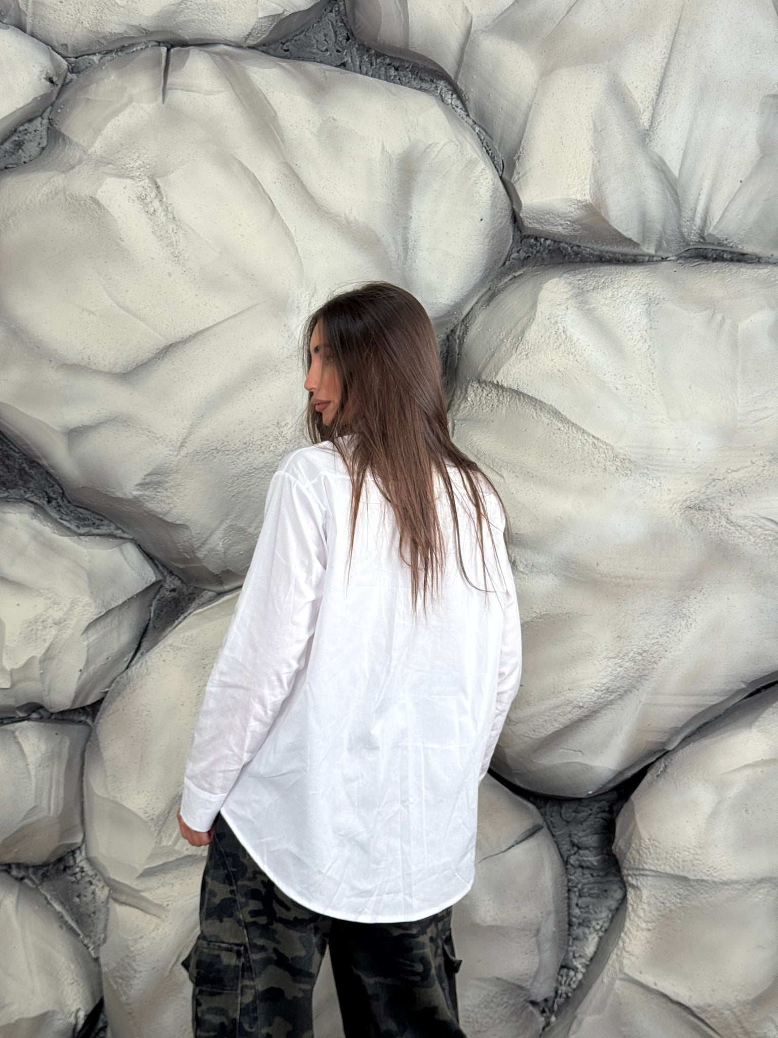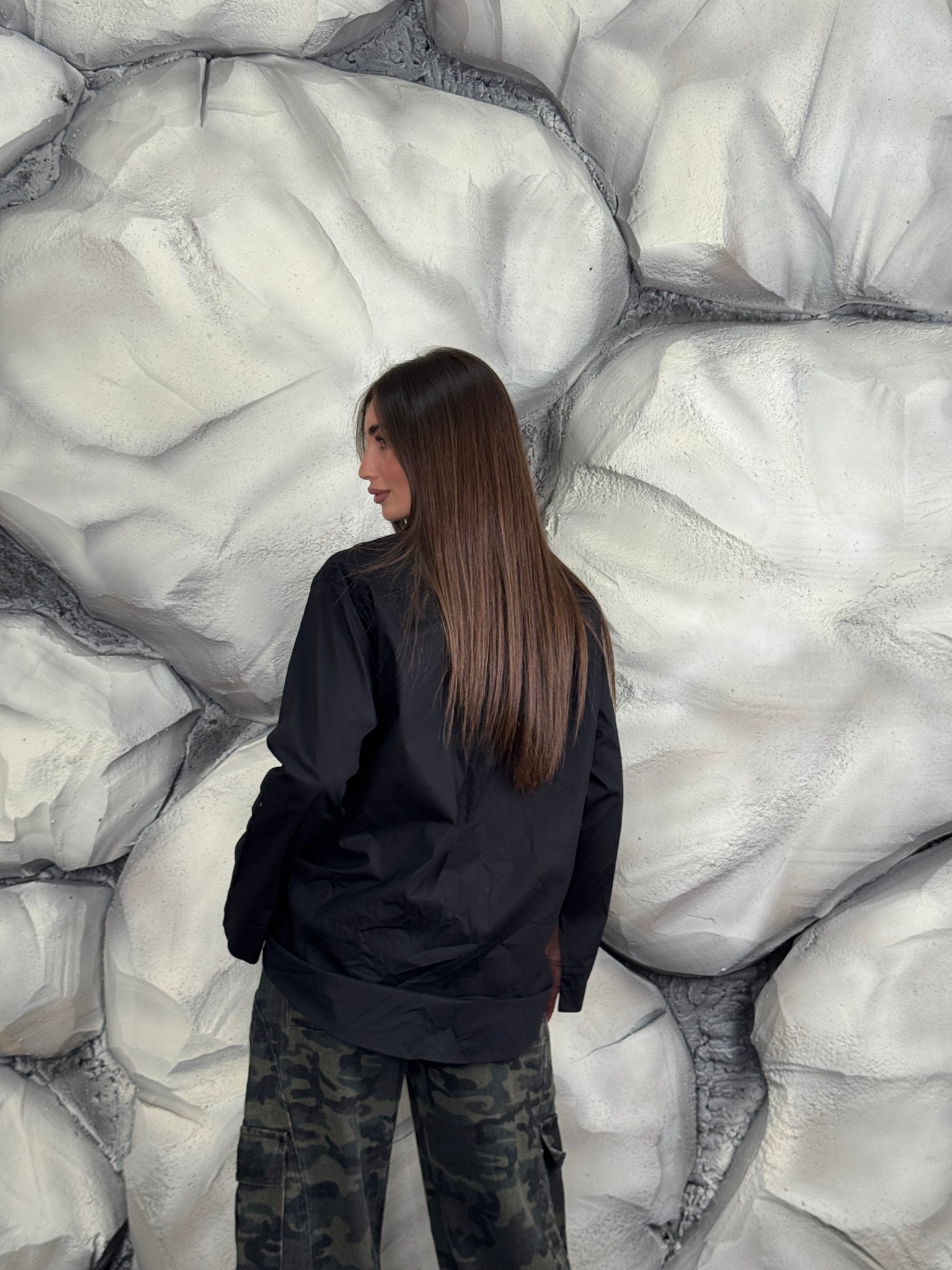 Camicia 100%cotone, bottoni sul davanti e taschino, leggermente over.