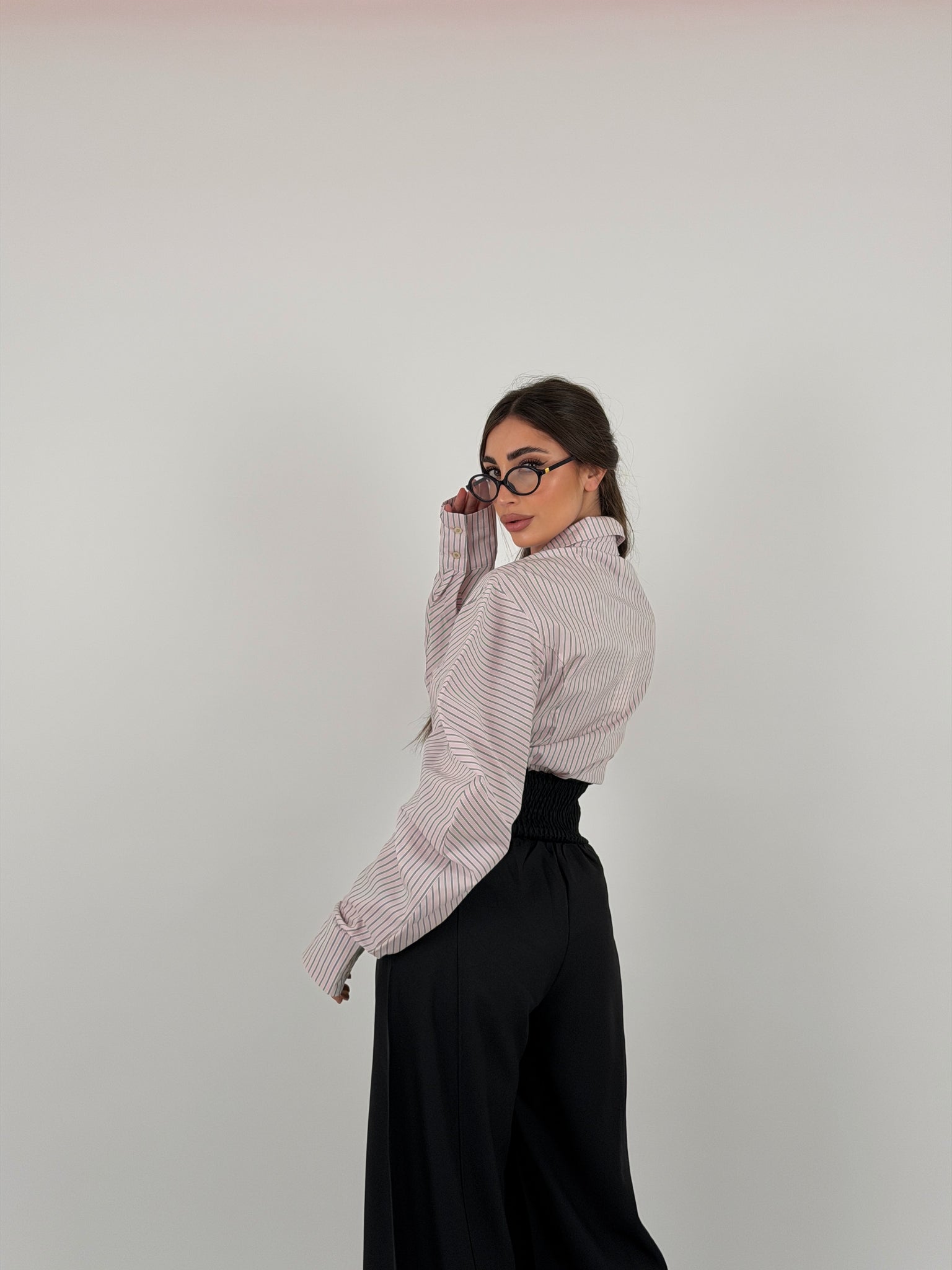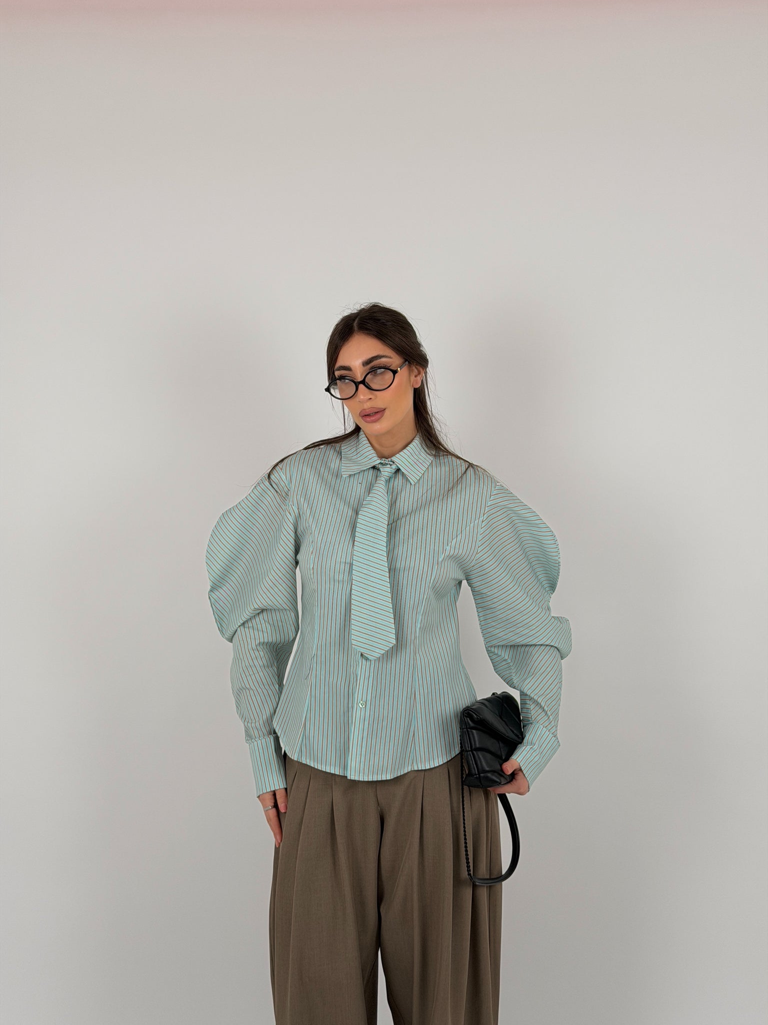 Camicia a righe avvitata  con bottoni sul davanti e cravatta annessa, dettaglio manica ballon.