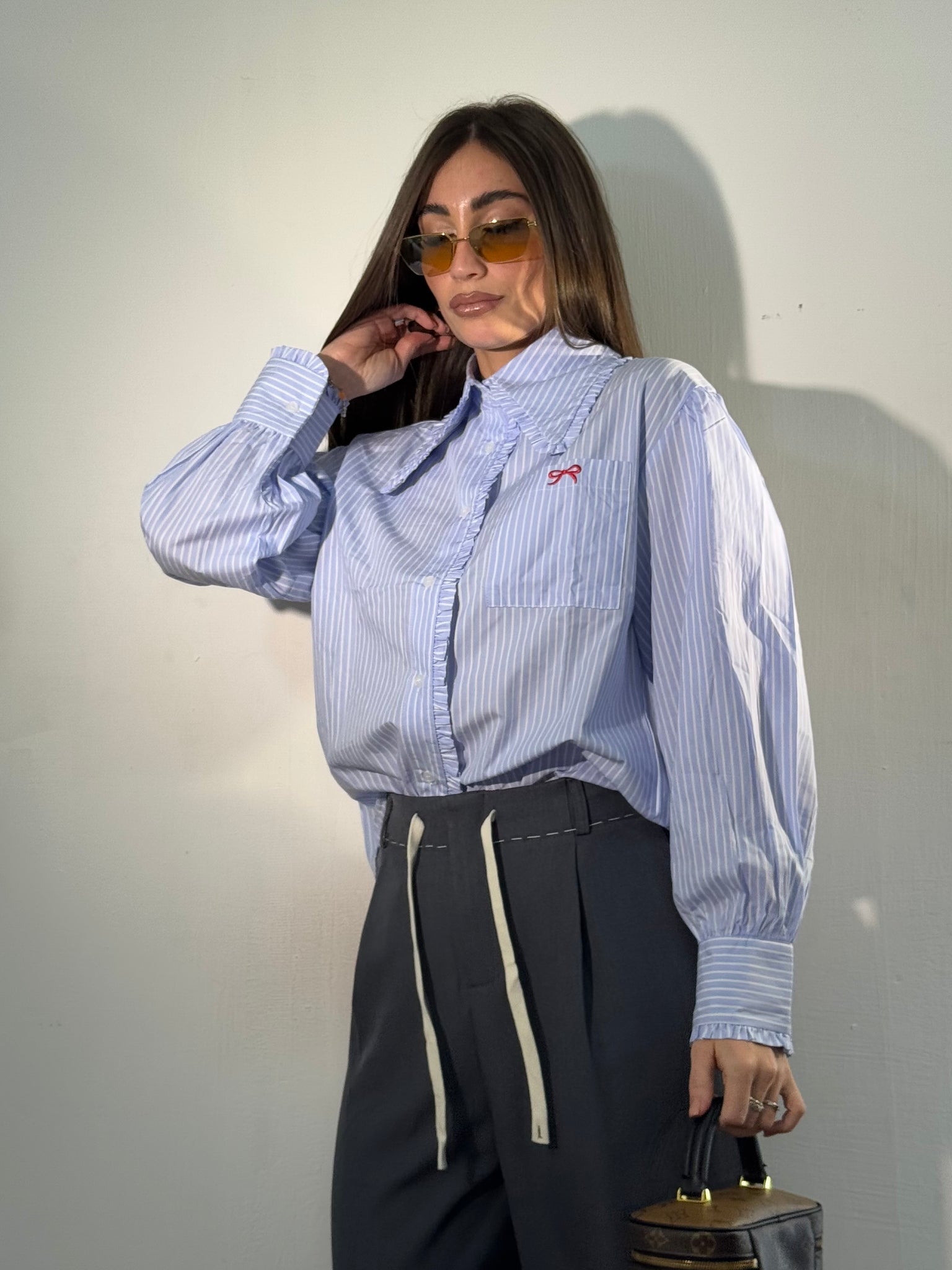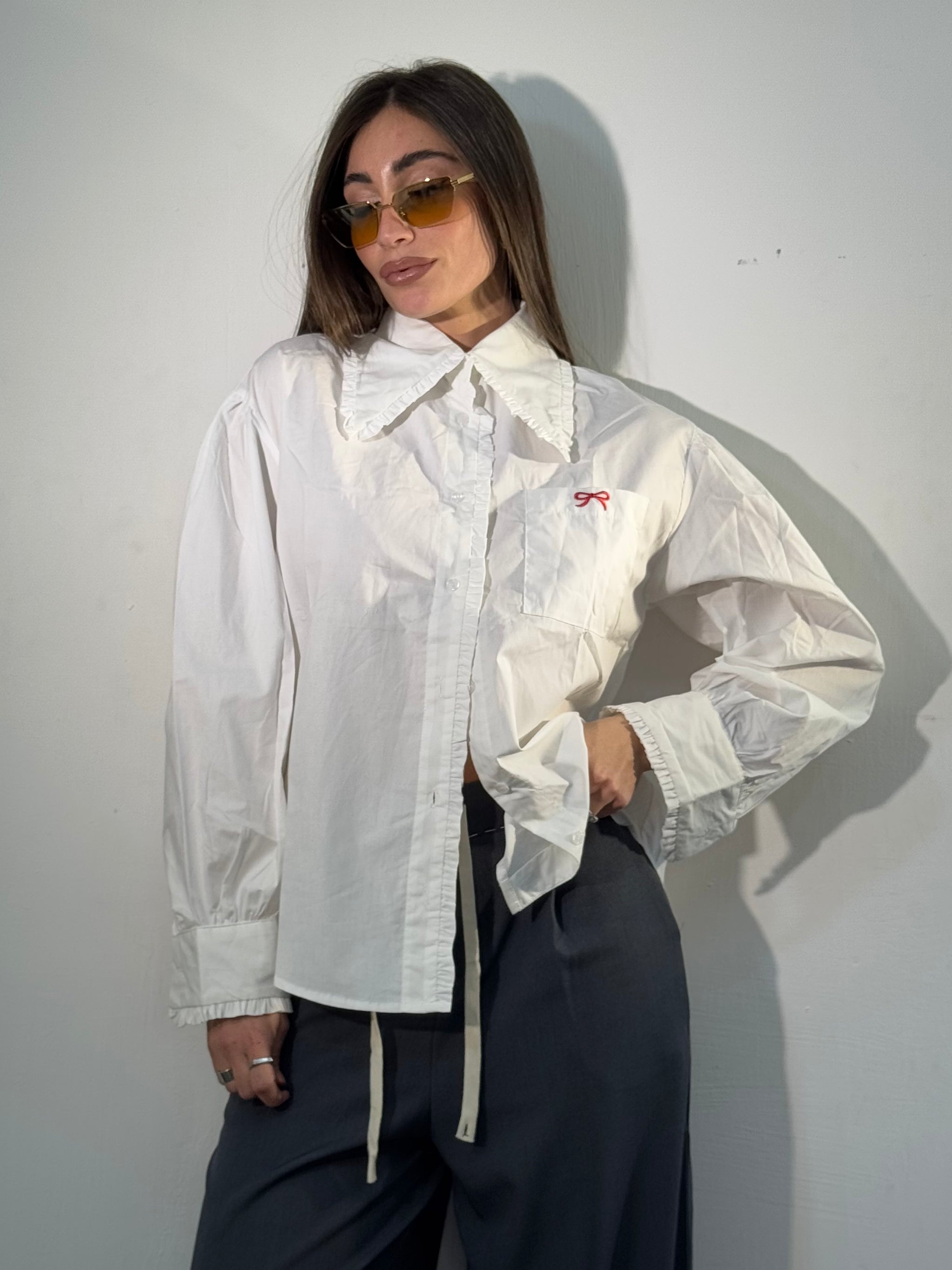 Camicia di cotone, dettagli sul colletto e vicino ai bottoni, taschino con ricamino.