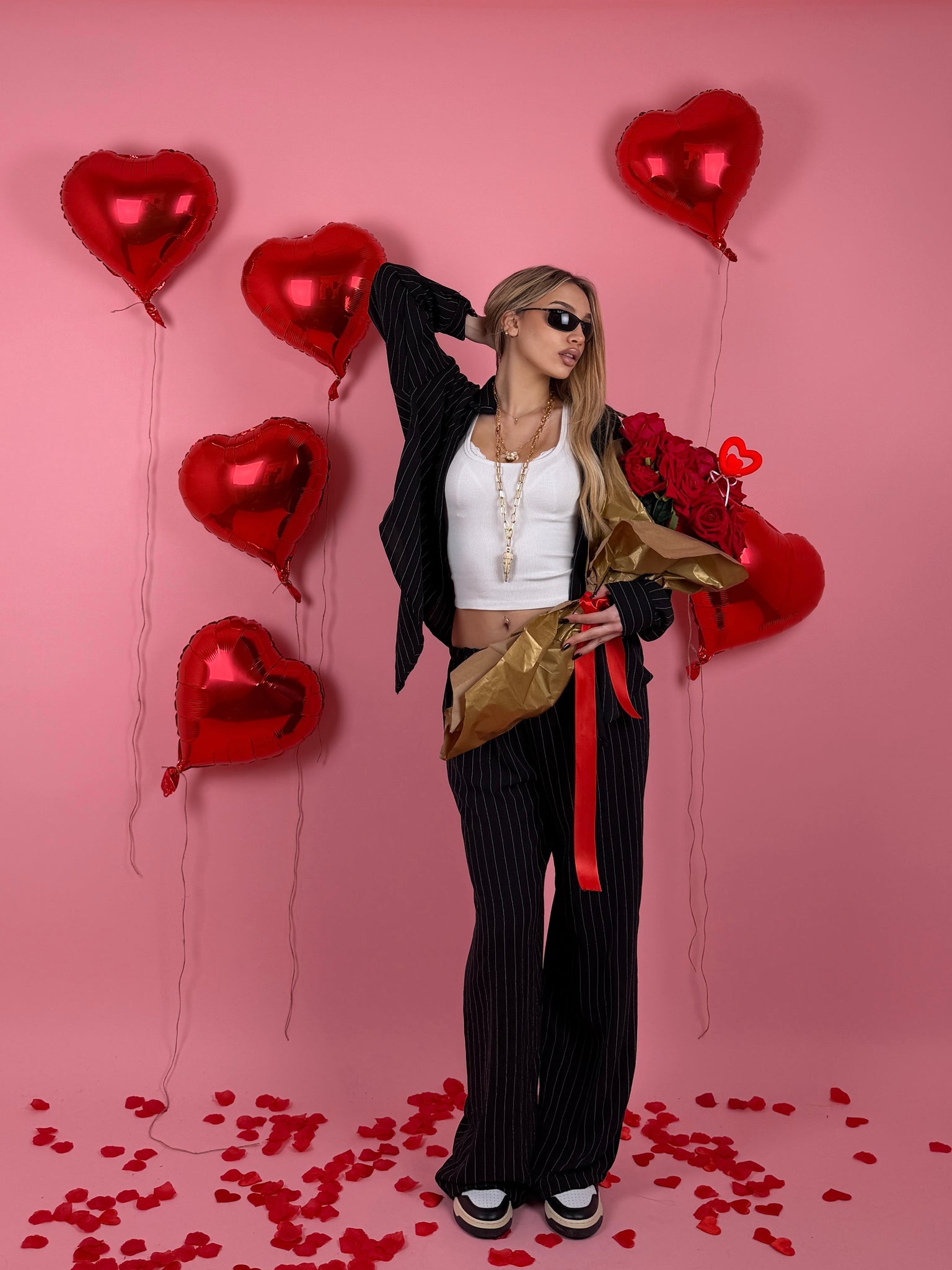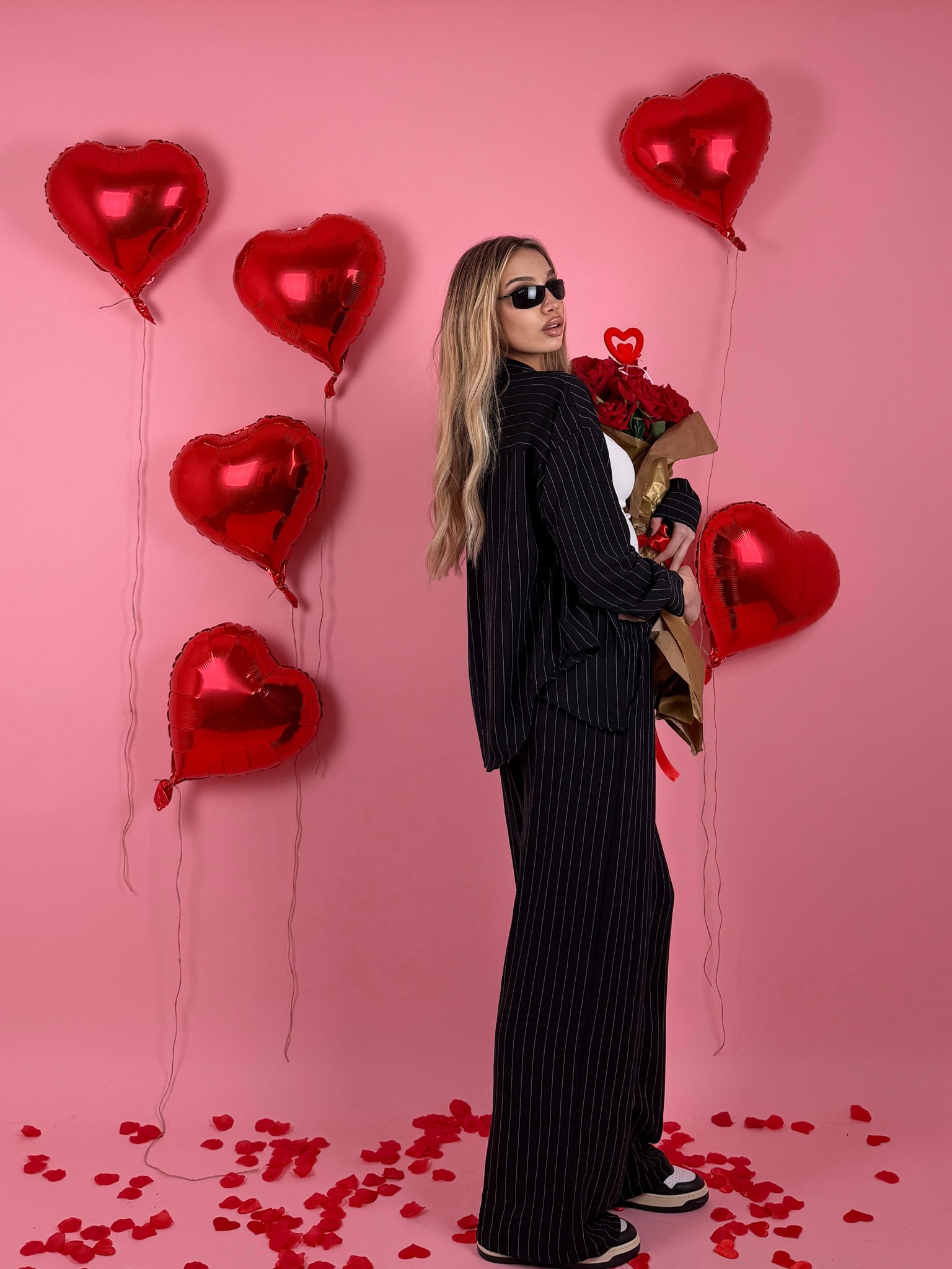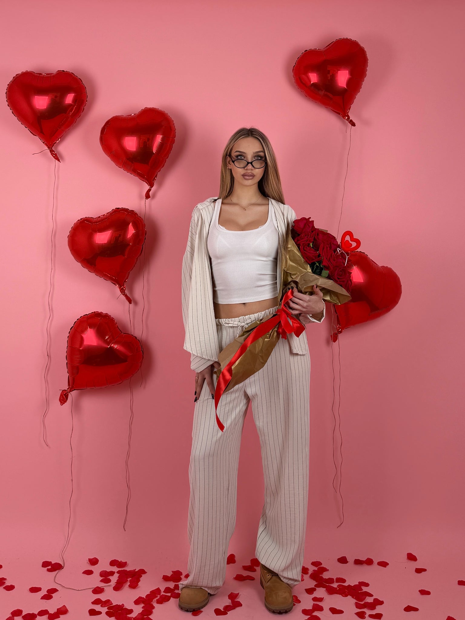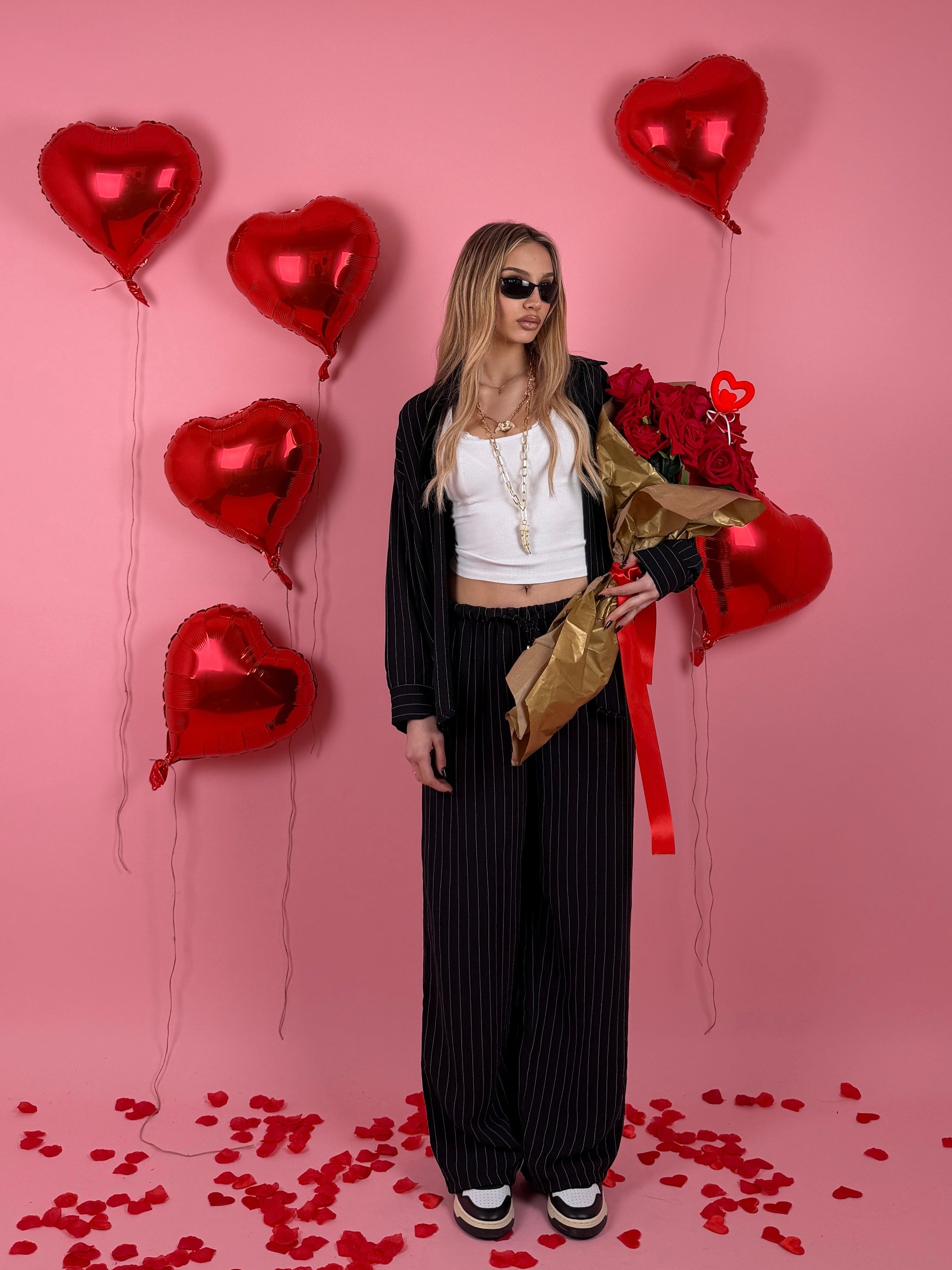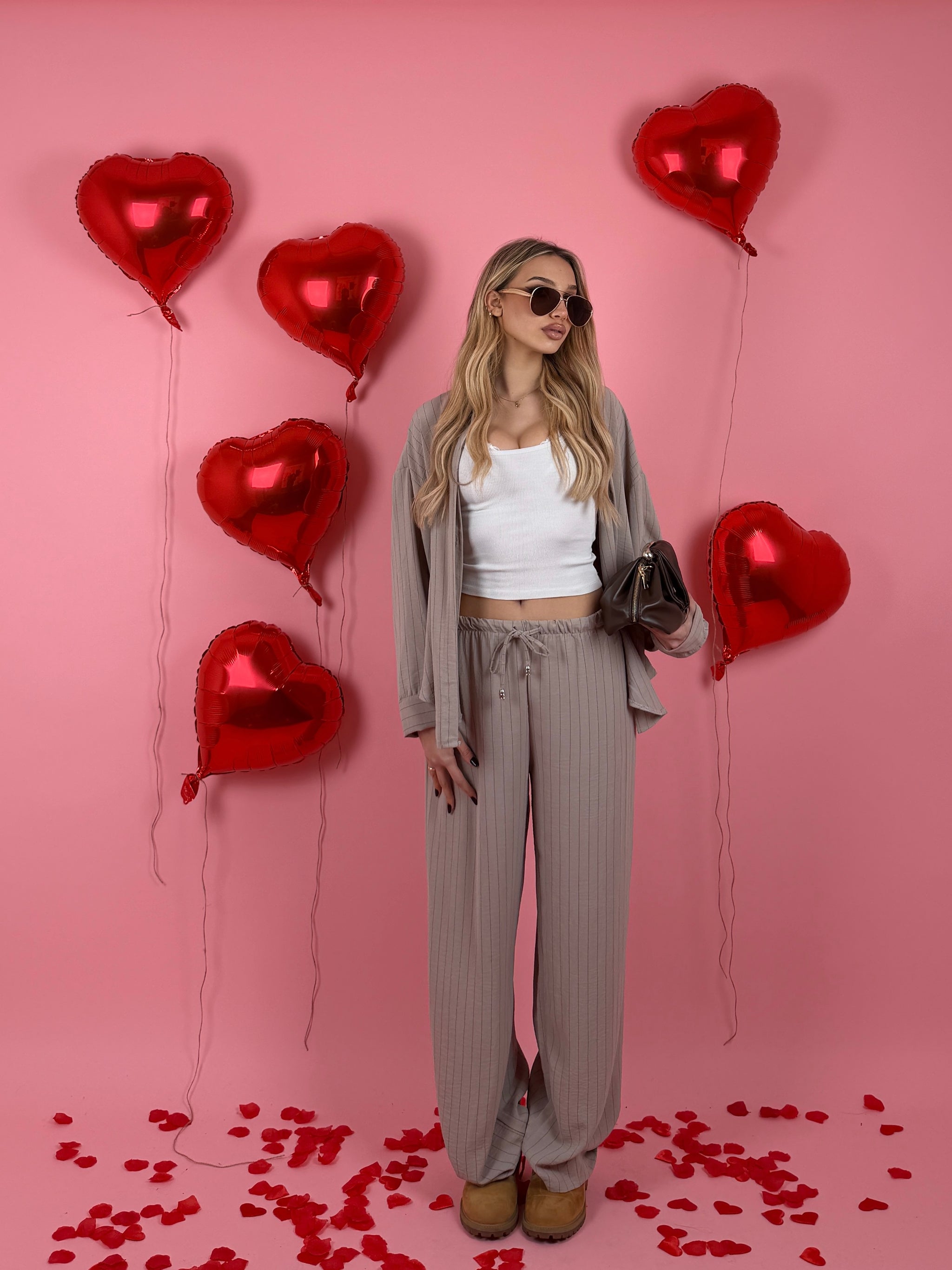 Completo gessato di tessuto leggero , composto da camicia con bottoni sul davanti, over size, pantalone con elastico in vita regolabile.