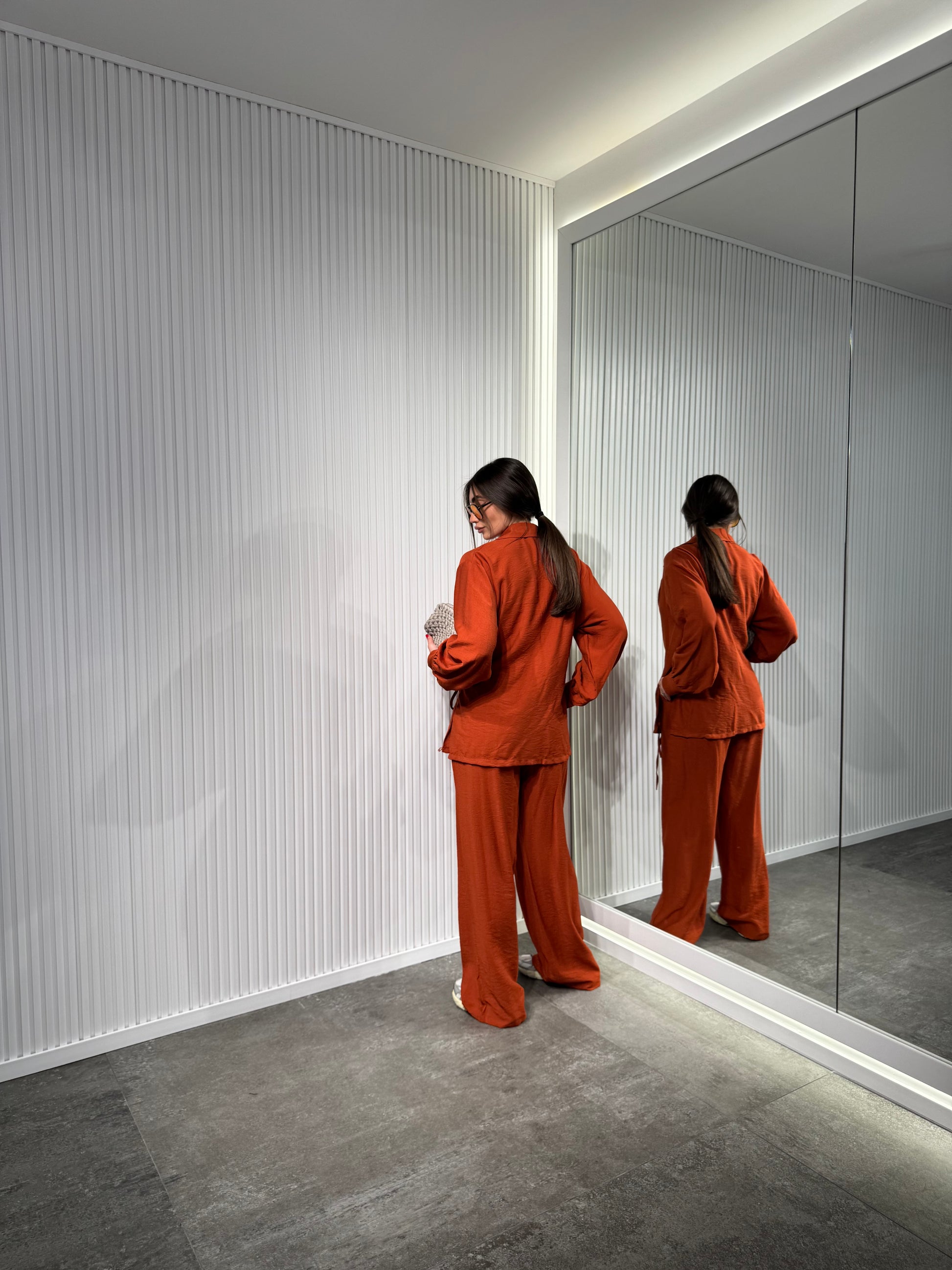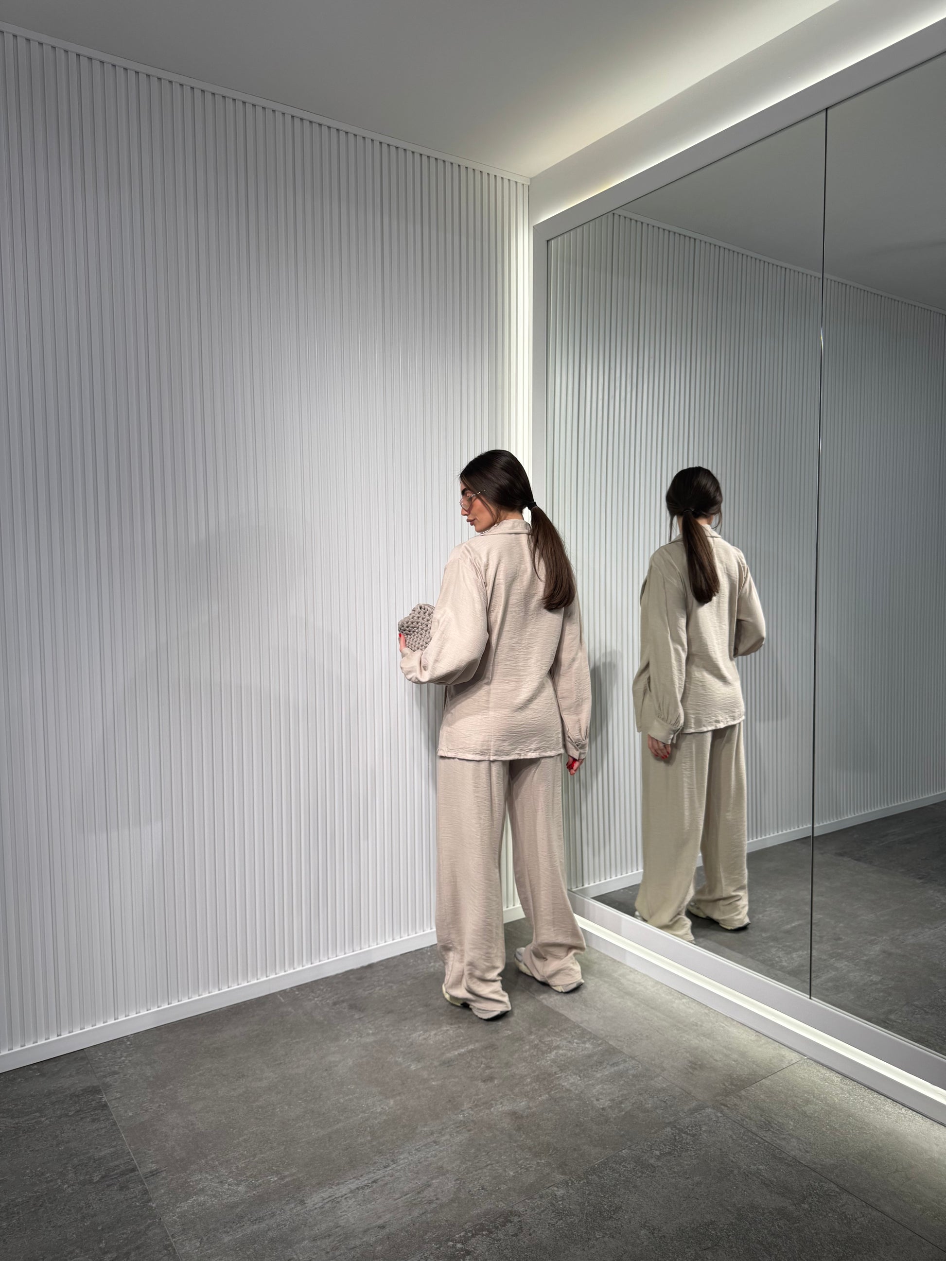 Completo in tessuto mistolino, Pantalone palazzo con elastico in vita mood sportivo, giacca con chiusura laterale