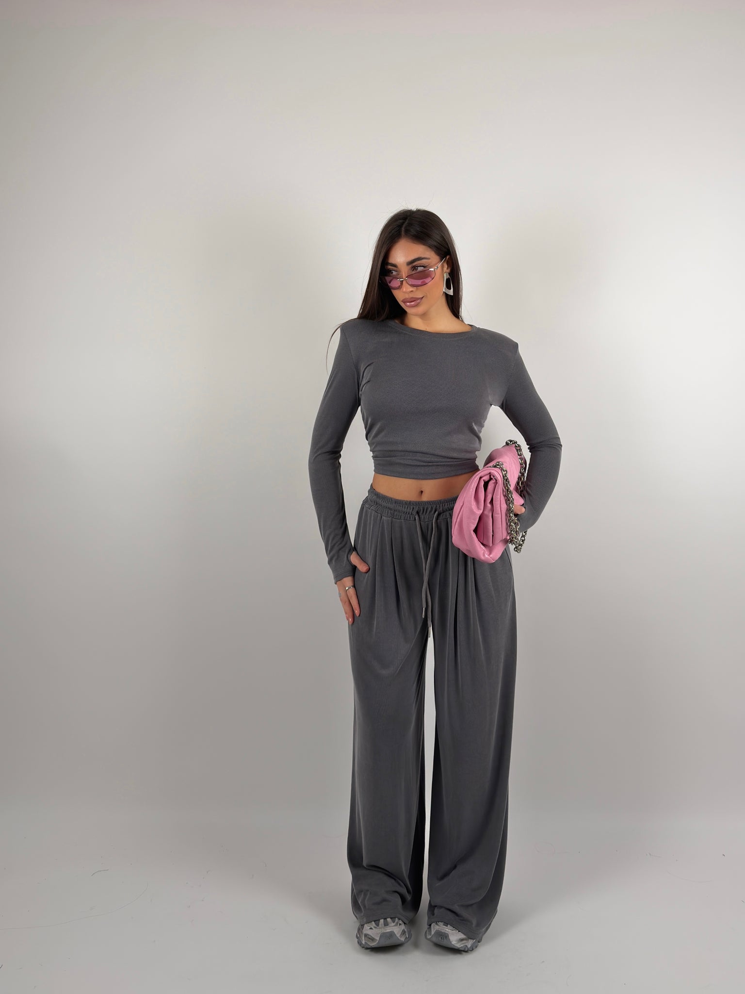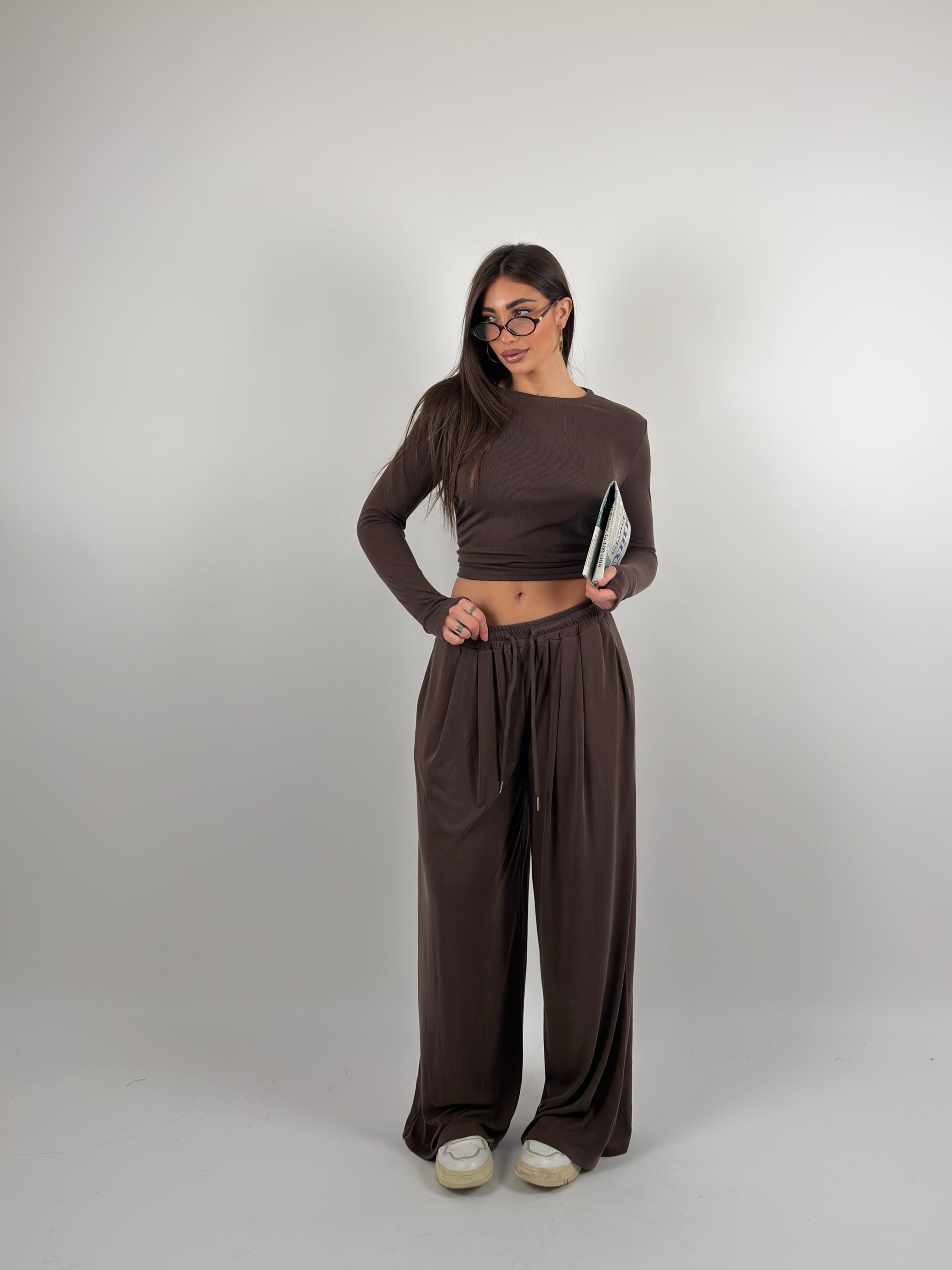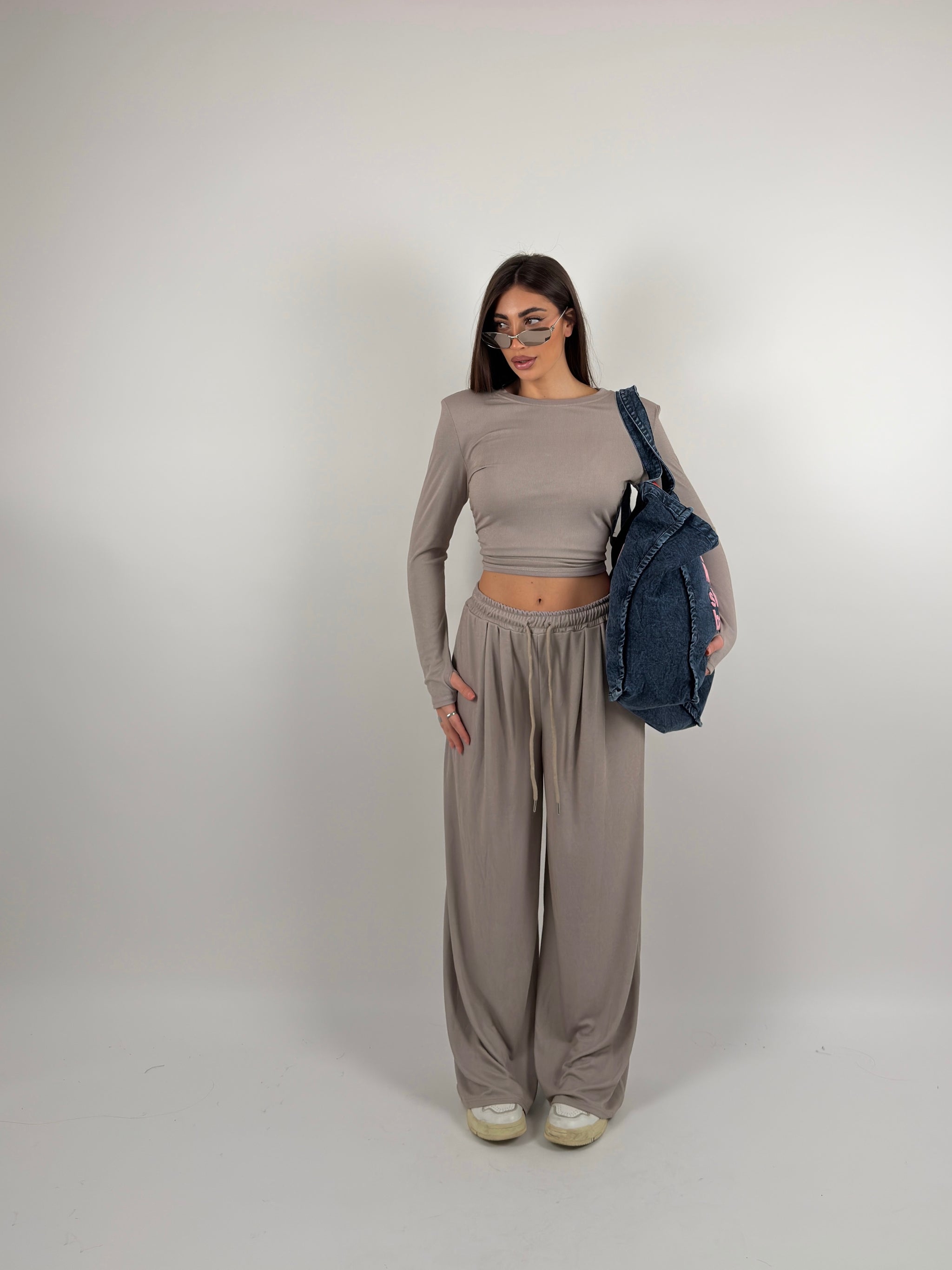 Completo a costine , maglia con spalline preformate e girocollo, pantalone con elastico regolabile in vita modello palazzo.