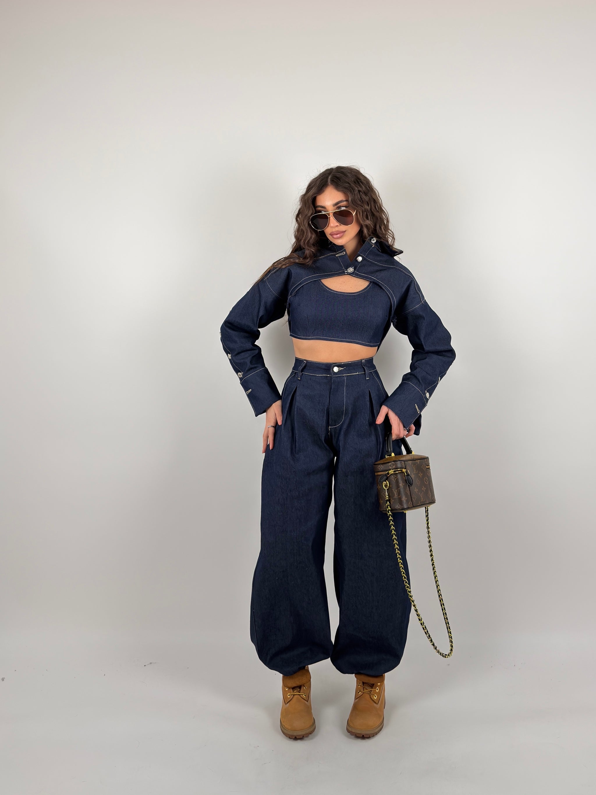 Completo di jeans tre pezzi, coprispalle con colletto e manica lunga particolare, top zip sul retro, pantalone com elastico sulle caviglie modello ballon.