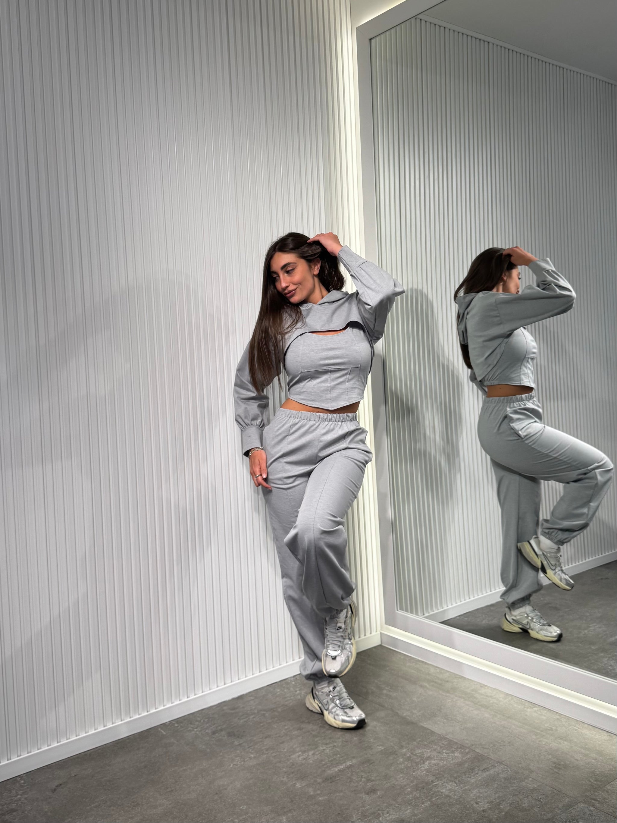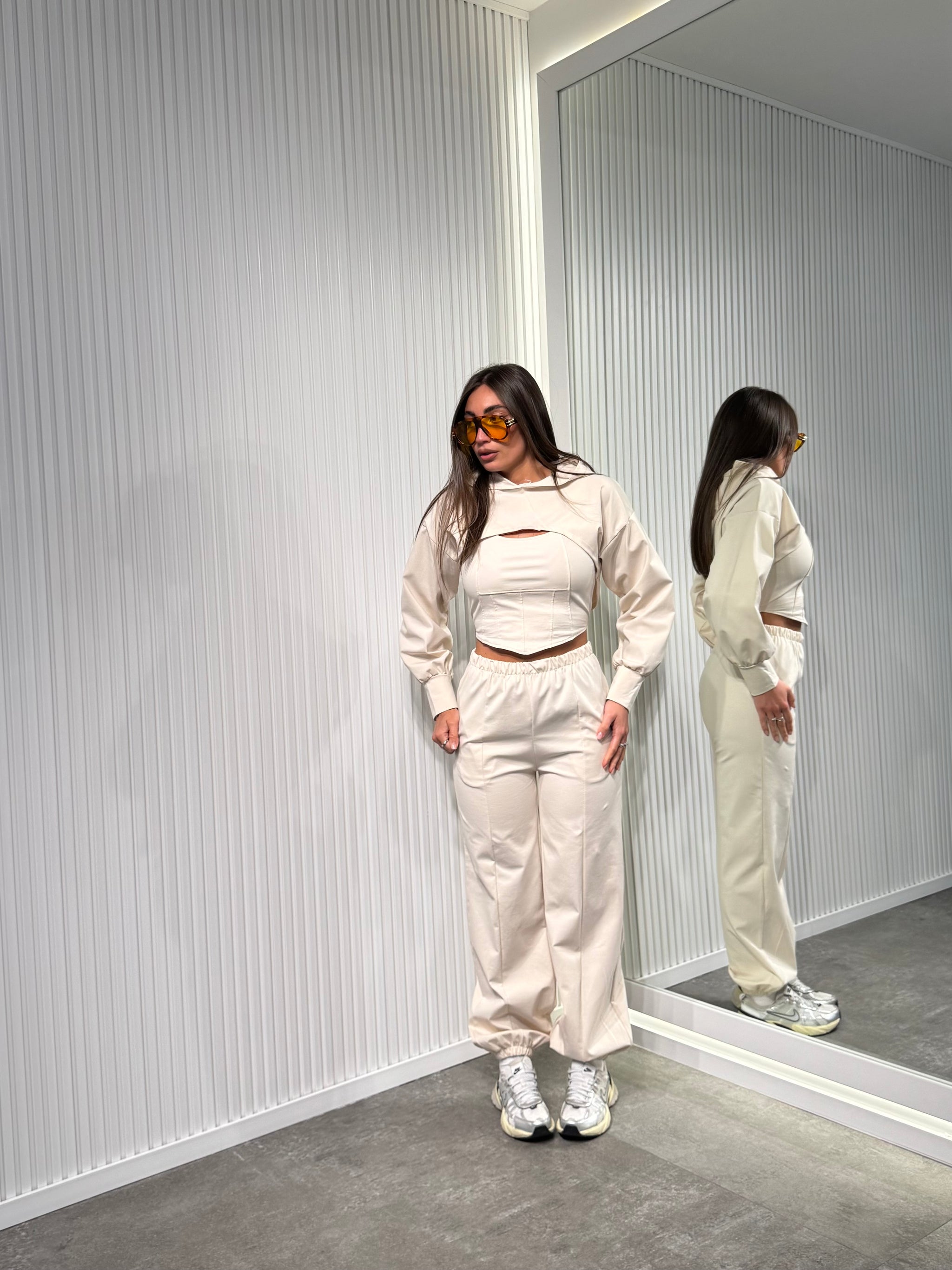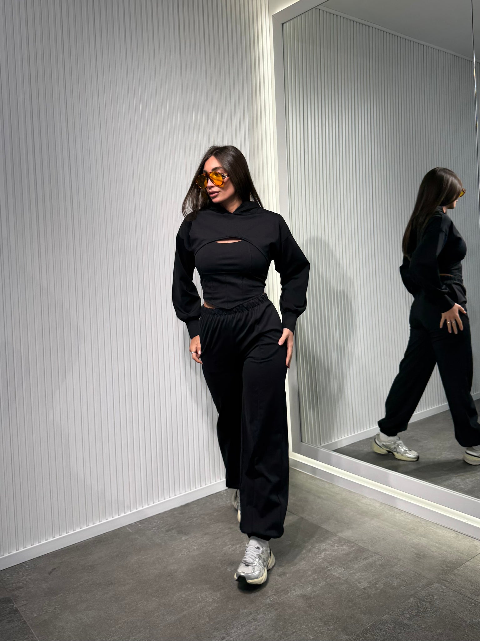 Completo tre pezzi, tessuto fresco ed elastico, coprispalle con cappuccio, corpetto con cuciture in evidenza, pantalone con elastico in vita e sulle caviglie.