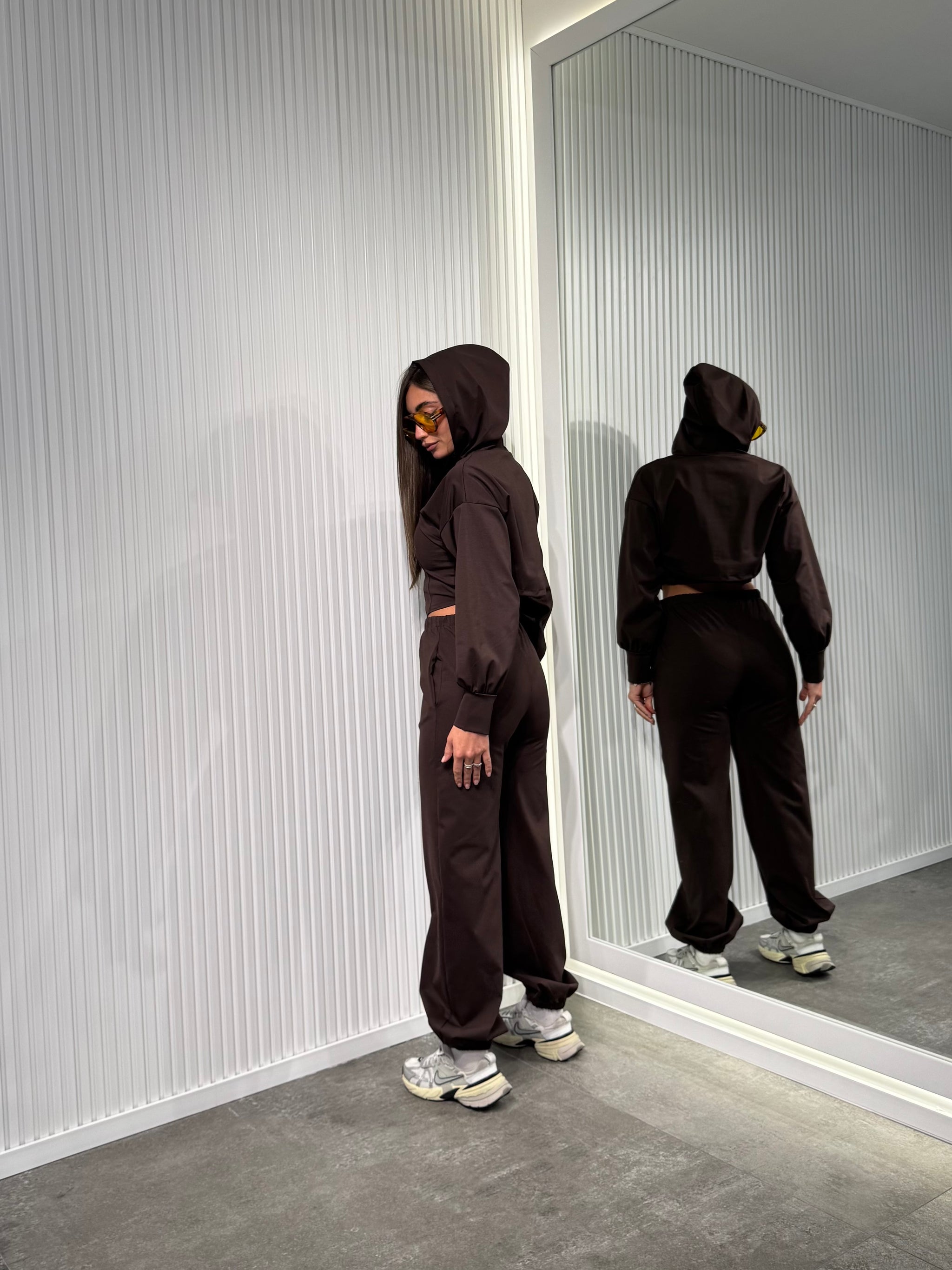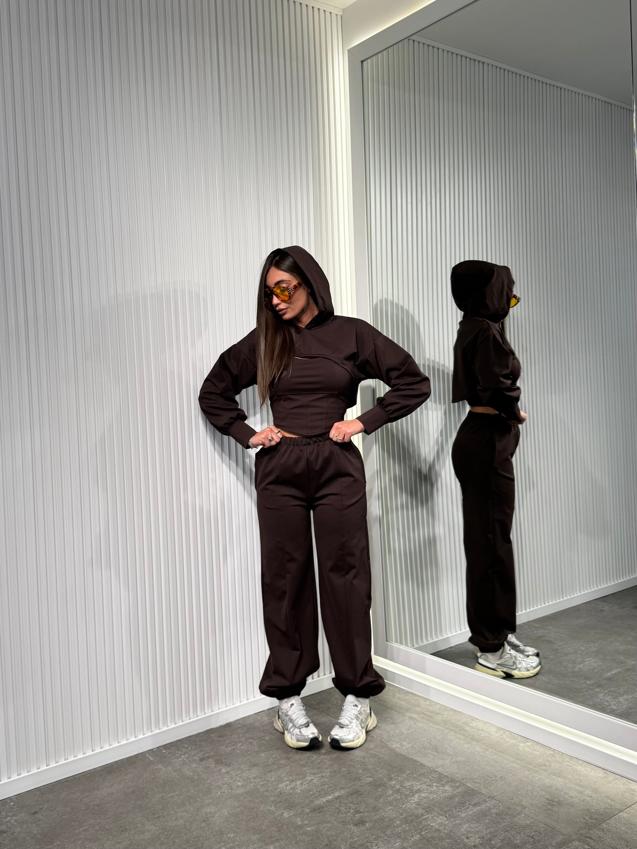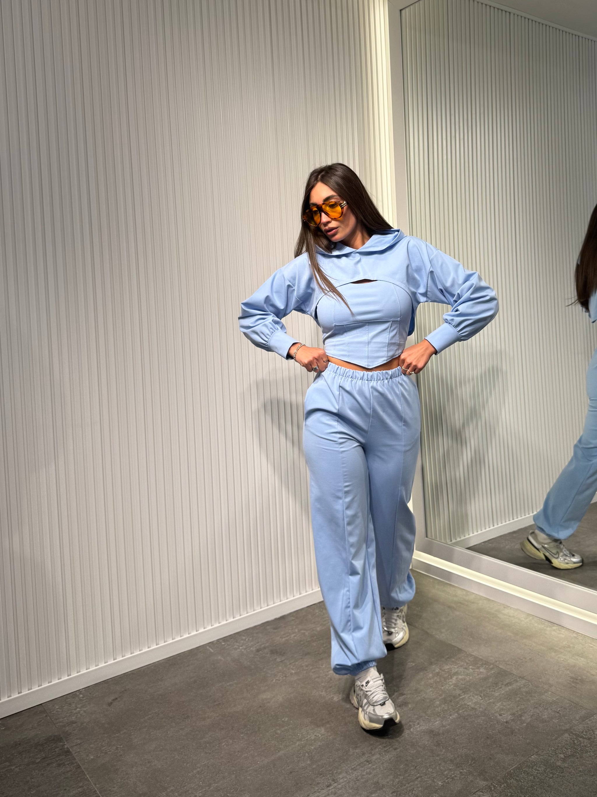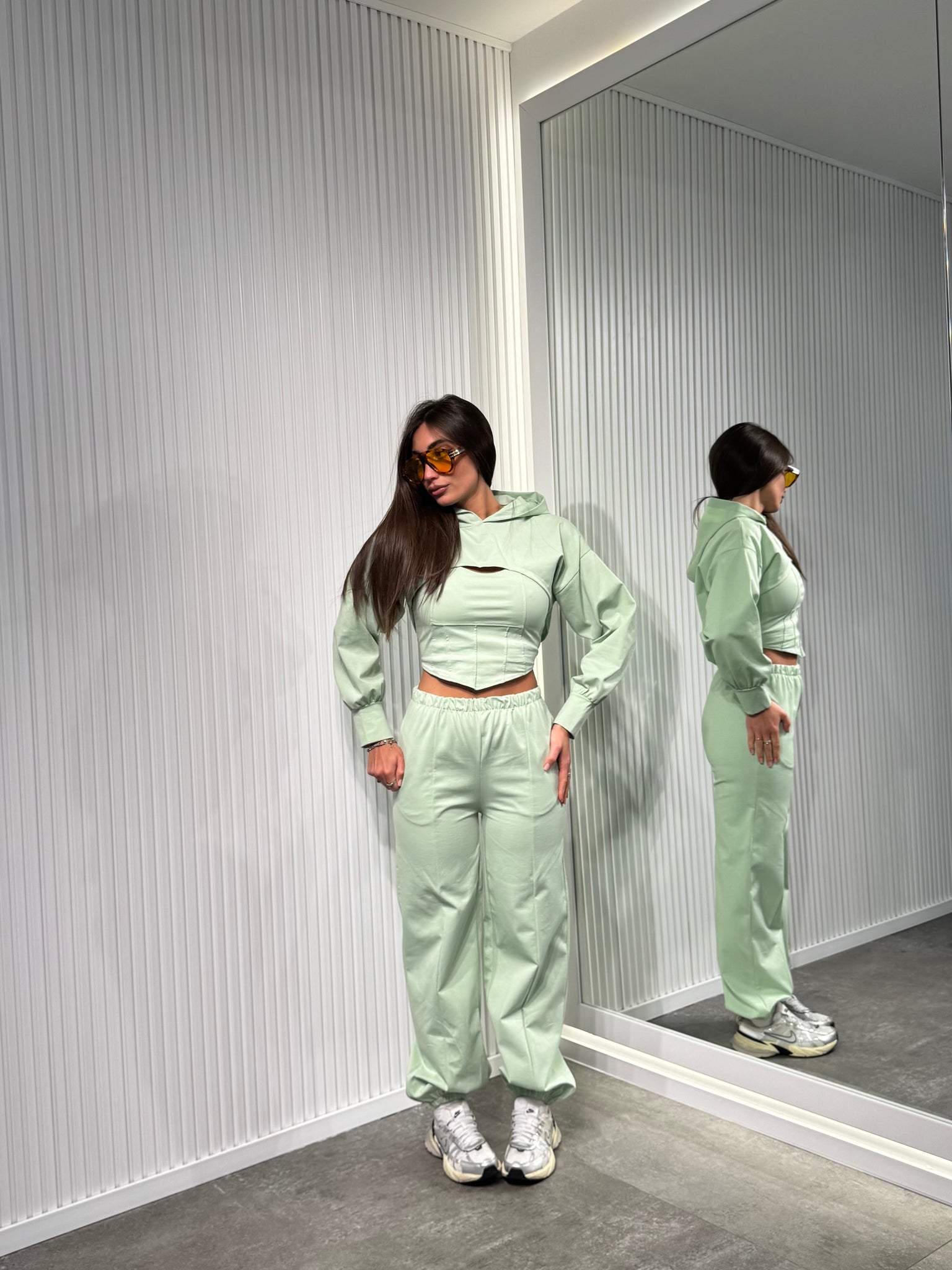 Completo tre pezzi, tessuto fresco ed elastico, coprispalle con cappuccio, corpetto con cuciture in evidenza, pantalone con elastico in vita e sulle caviglie.