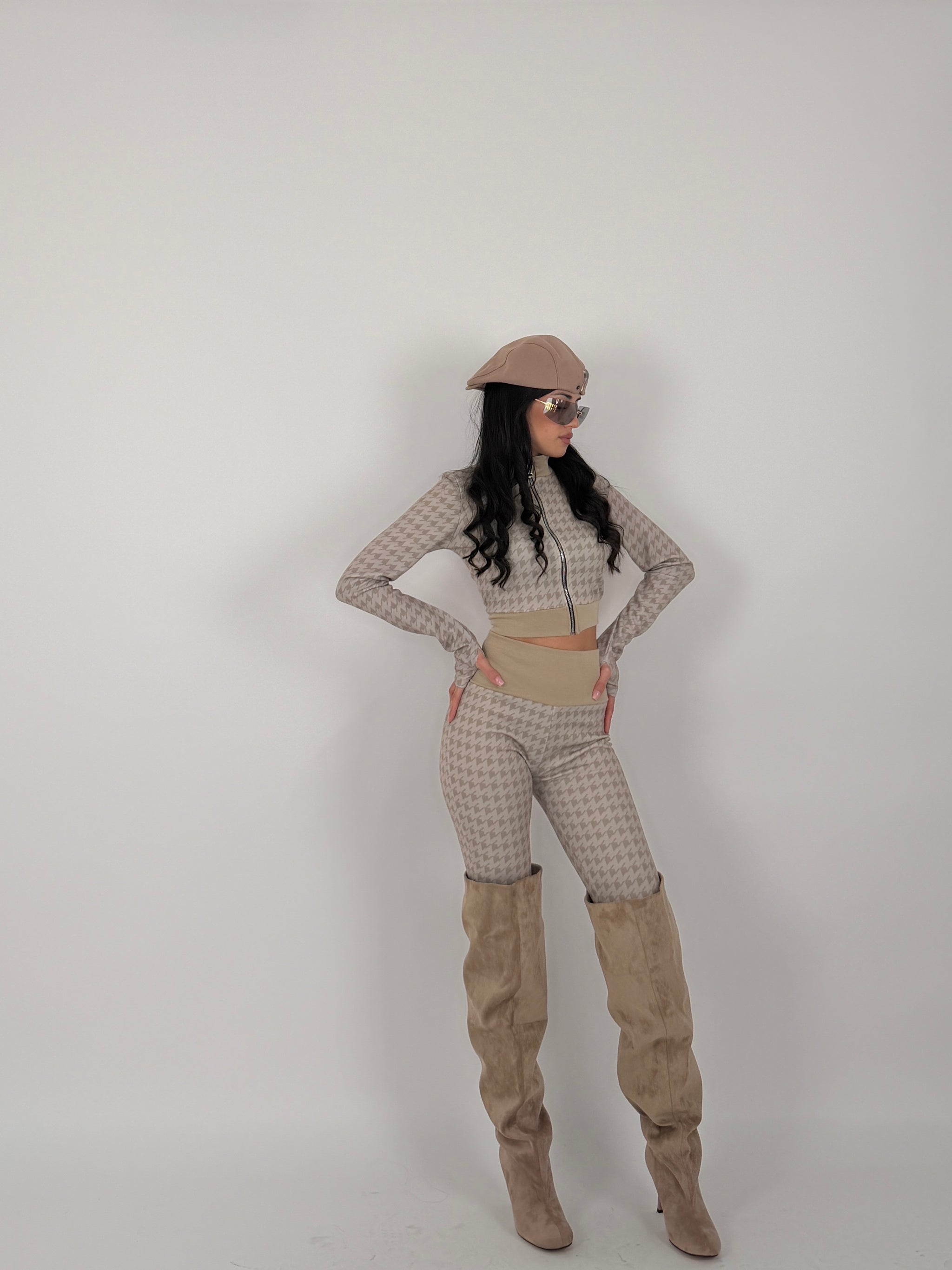 Completo fitness di lycra, composto da felpa con zip sul davanti, elastico in vita e sui polsini, manica con guantino, leggings elastico.