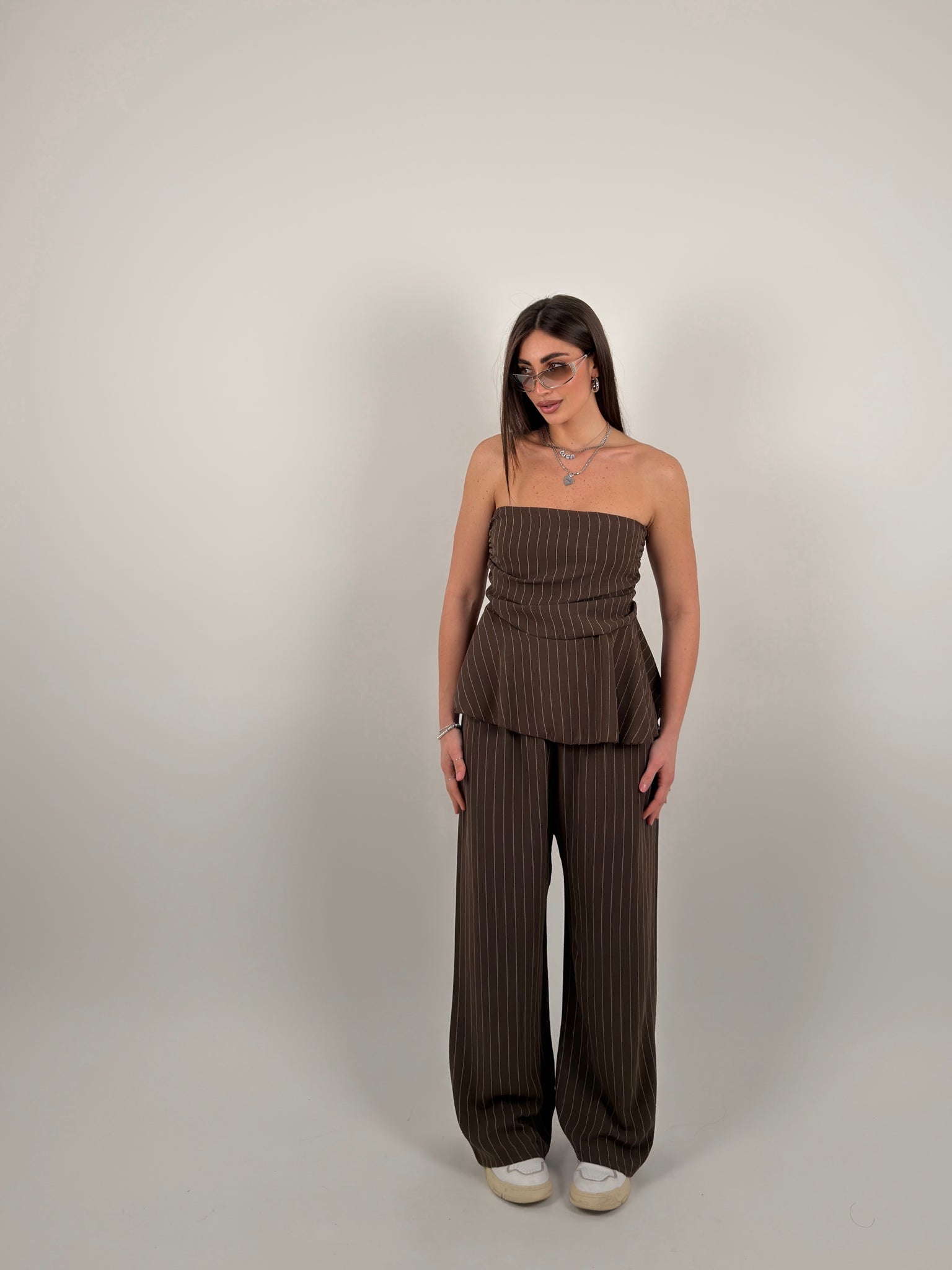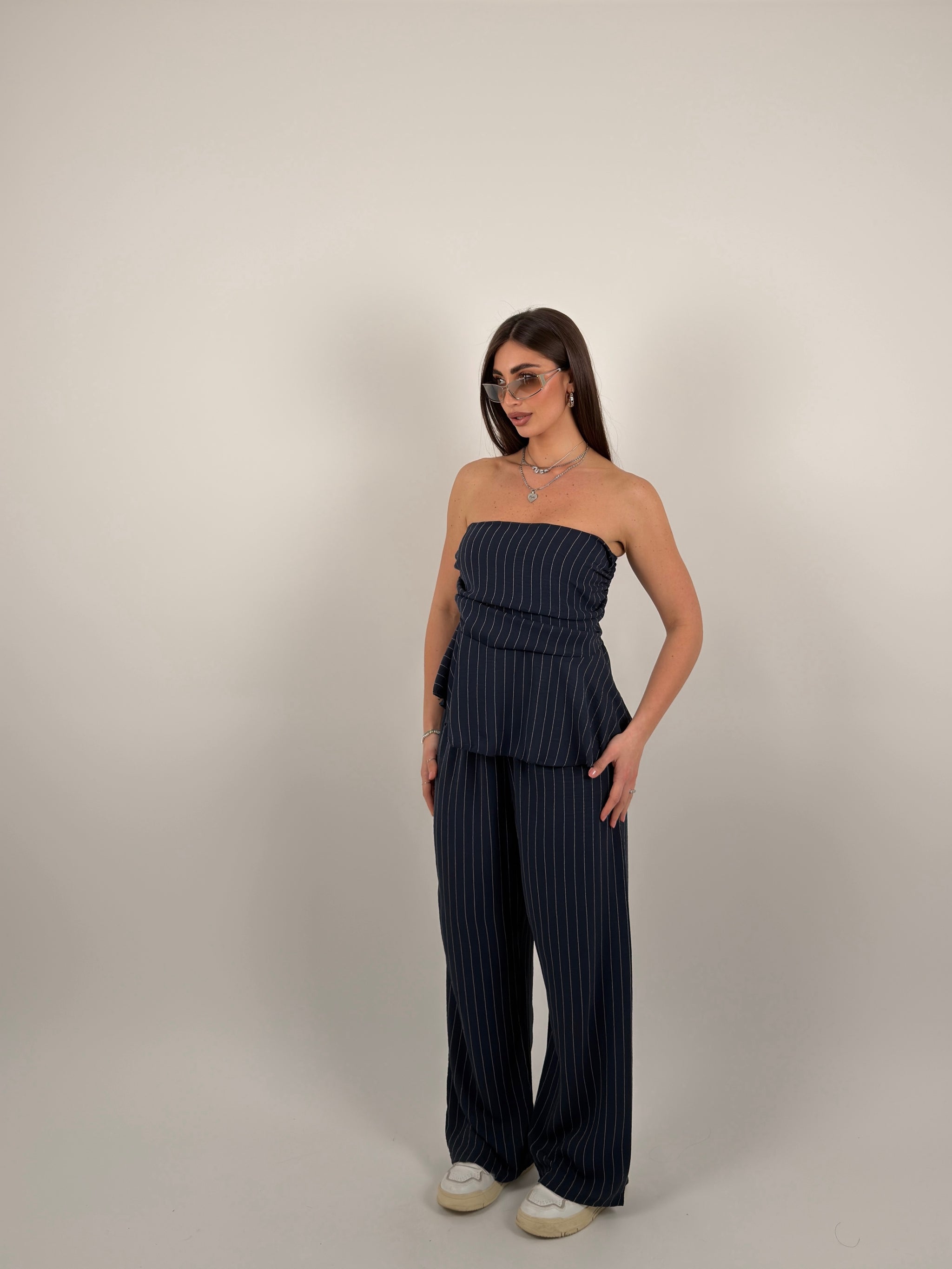 Completo in tessuto fresco leggero, gessato, composto da top a fascia con voila, pantalone modello palazzo con elastico in vita.