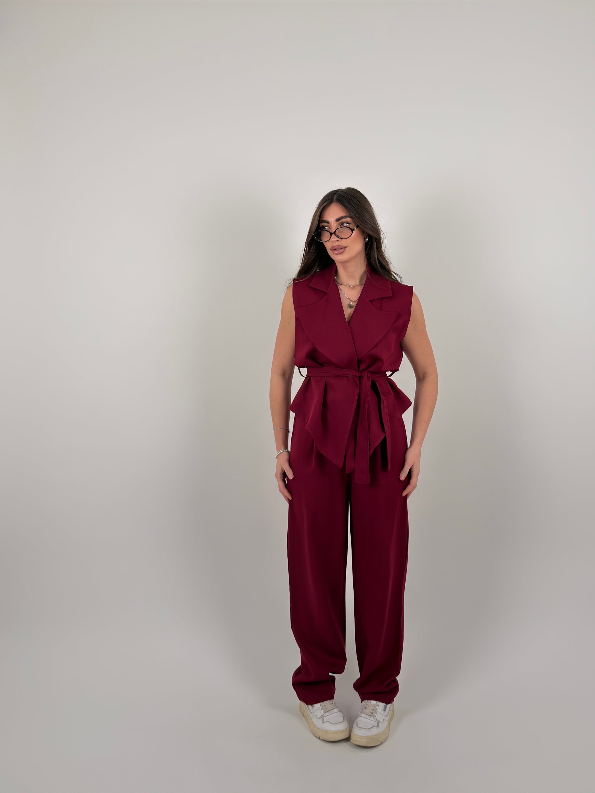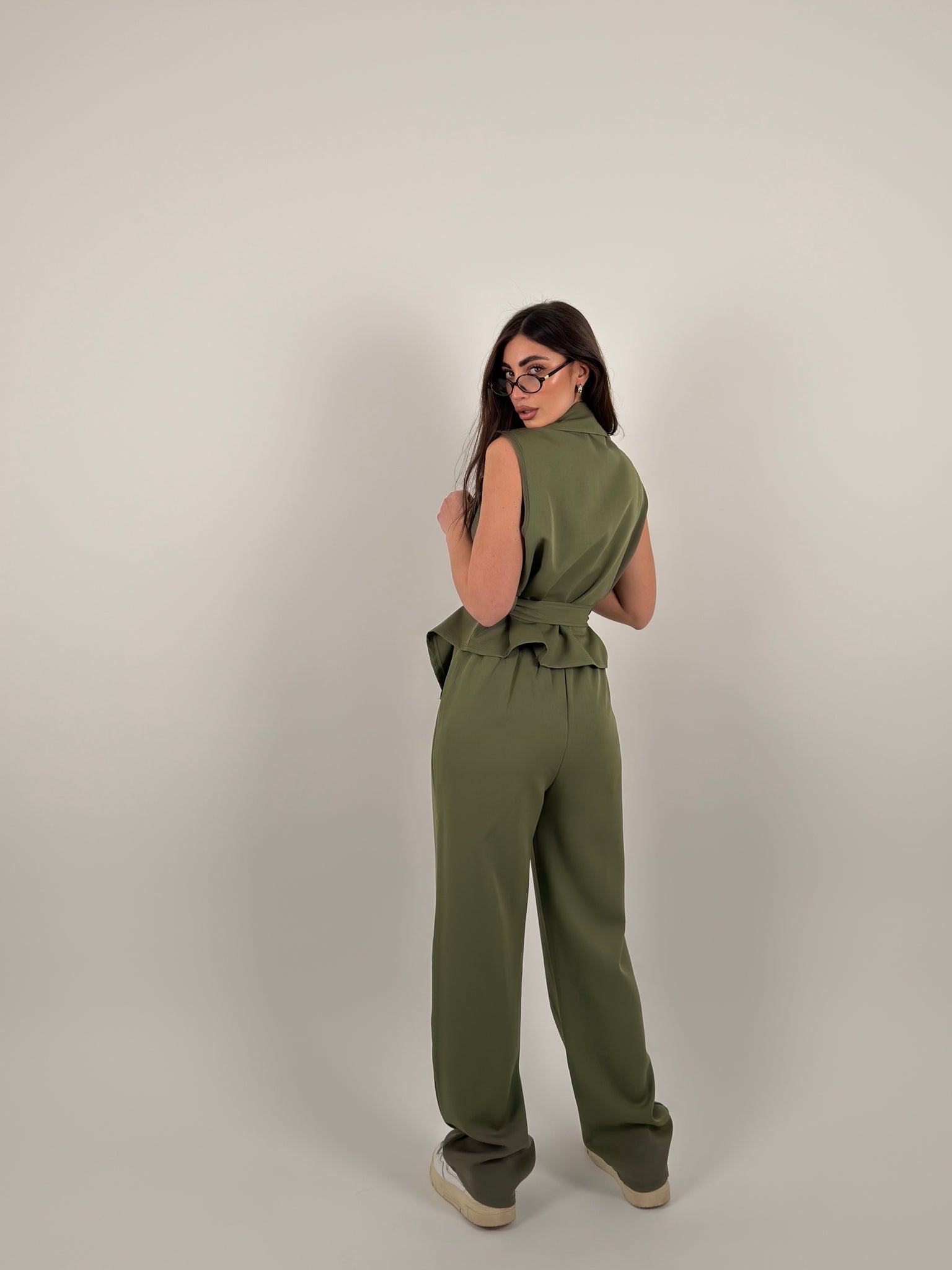 Completo di tessuto, composto da giacca a giro manica  con cintura in vita, pantalone modello palazzo con elastico sul retro.