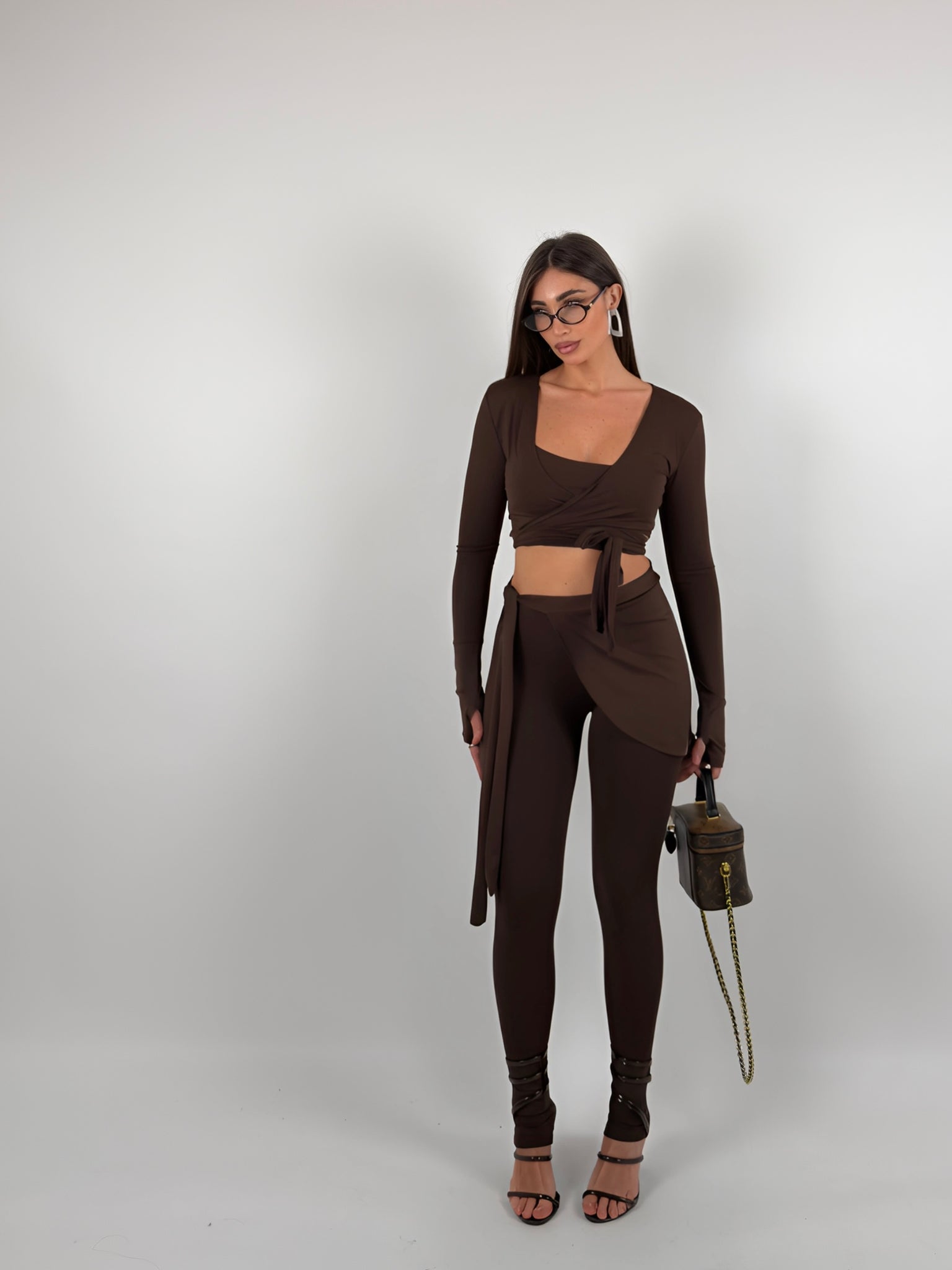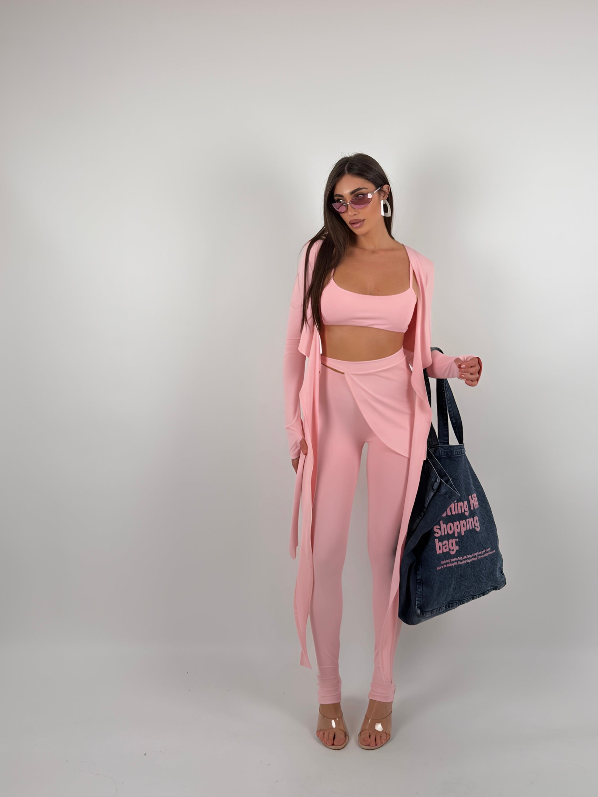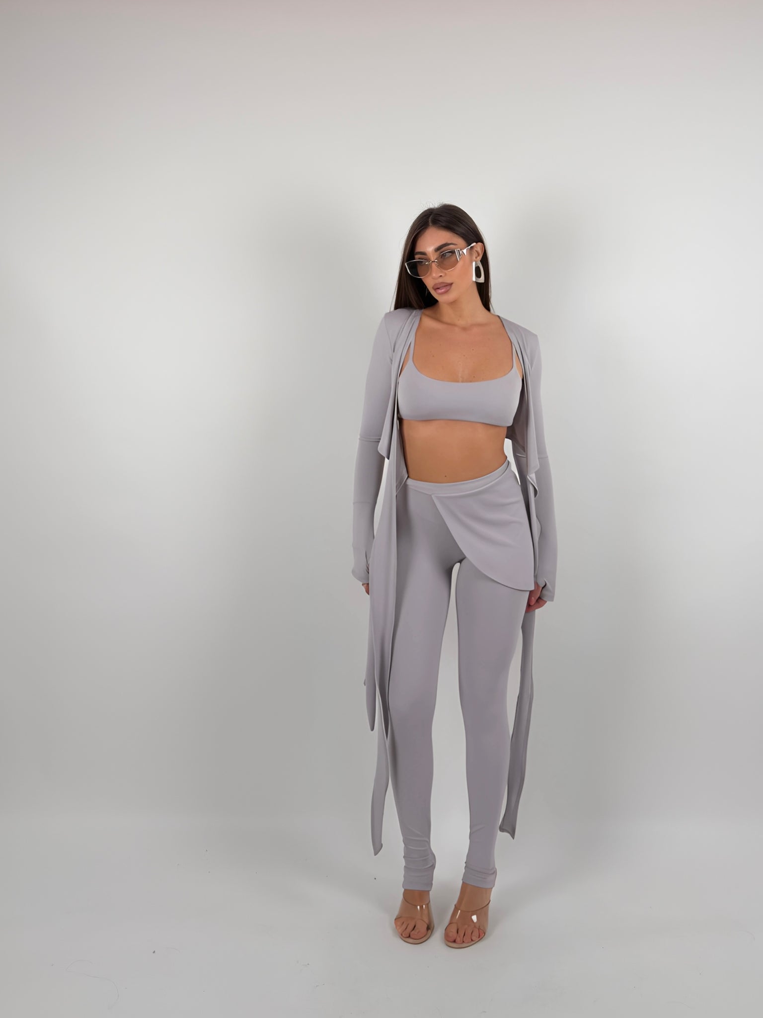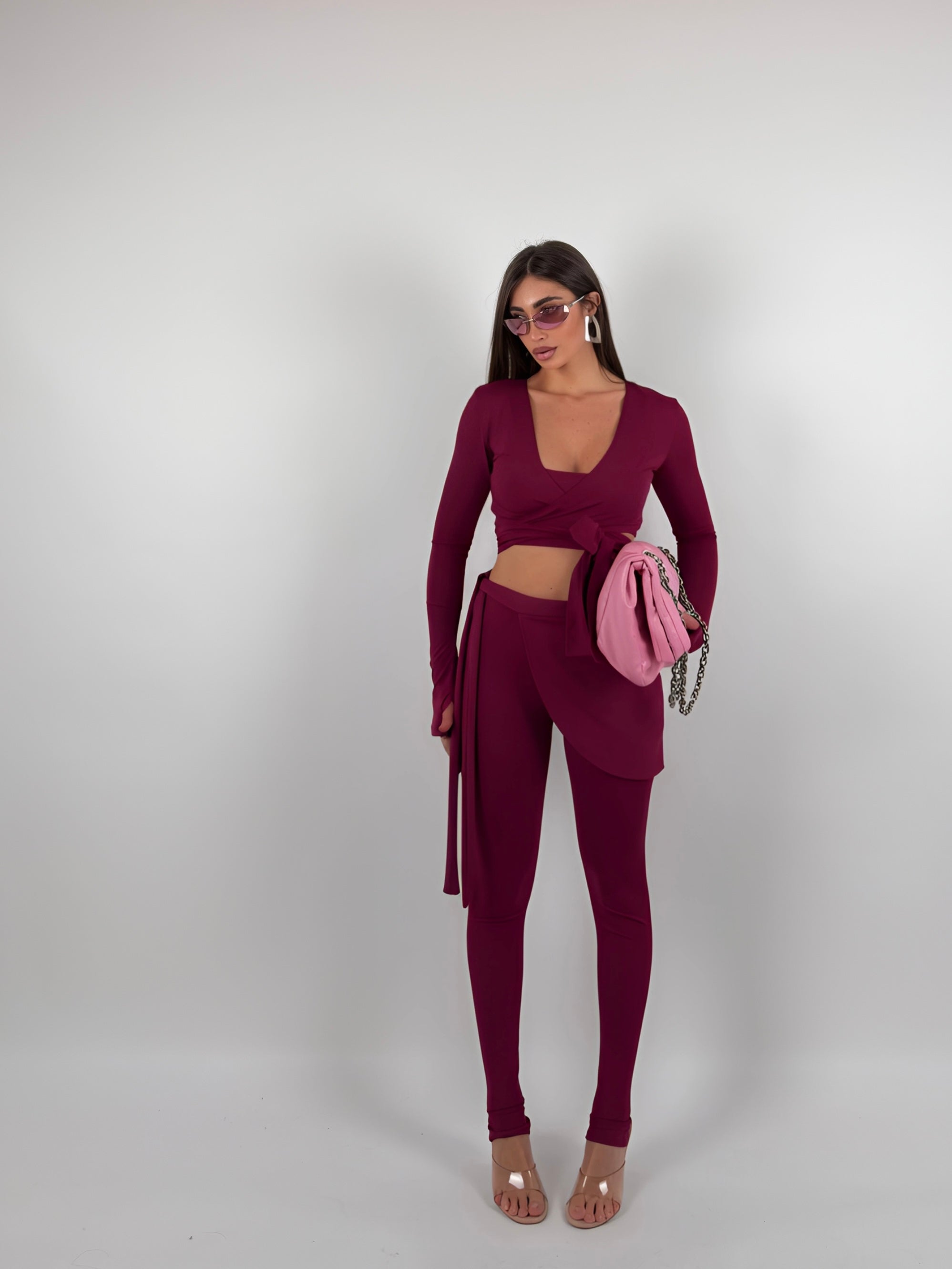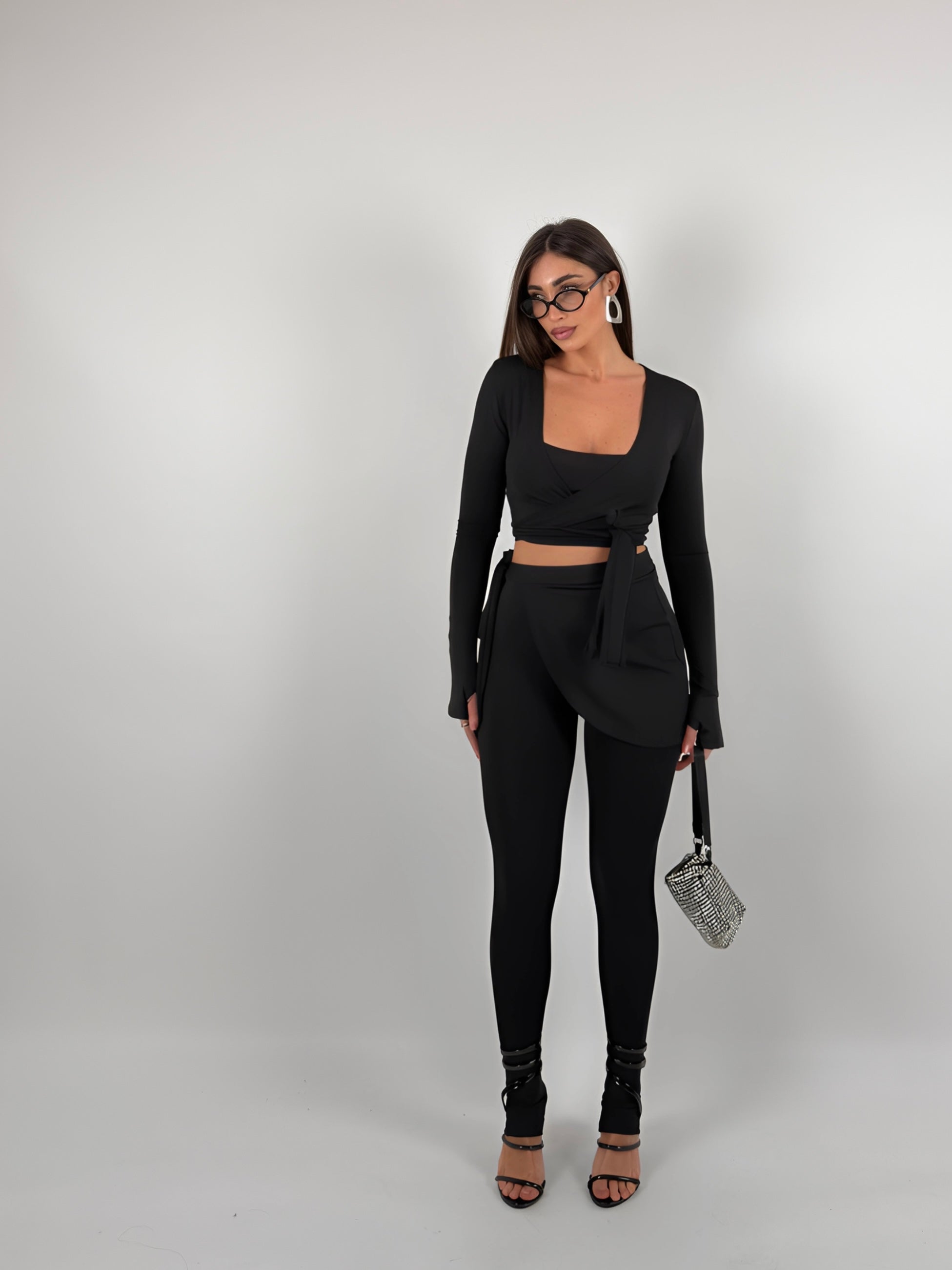 Completo di lycra tre pezzi, top con bretelle elastiche, coprispalle chiusura a portafoglio, leggings con inserto.