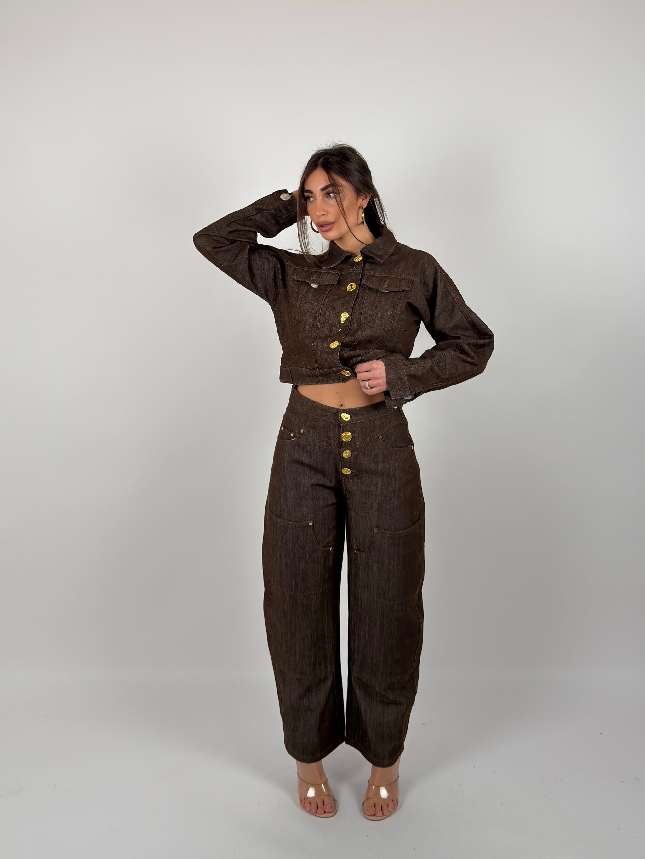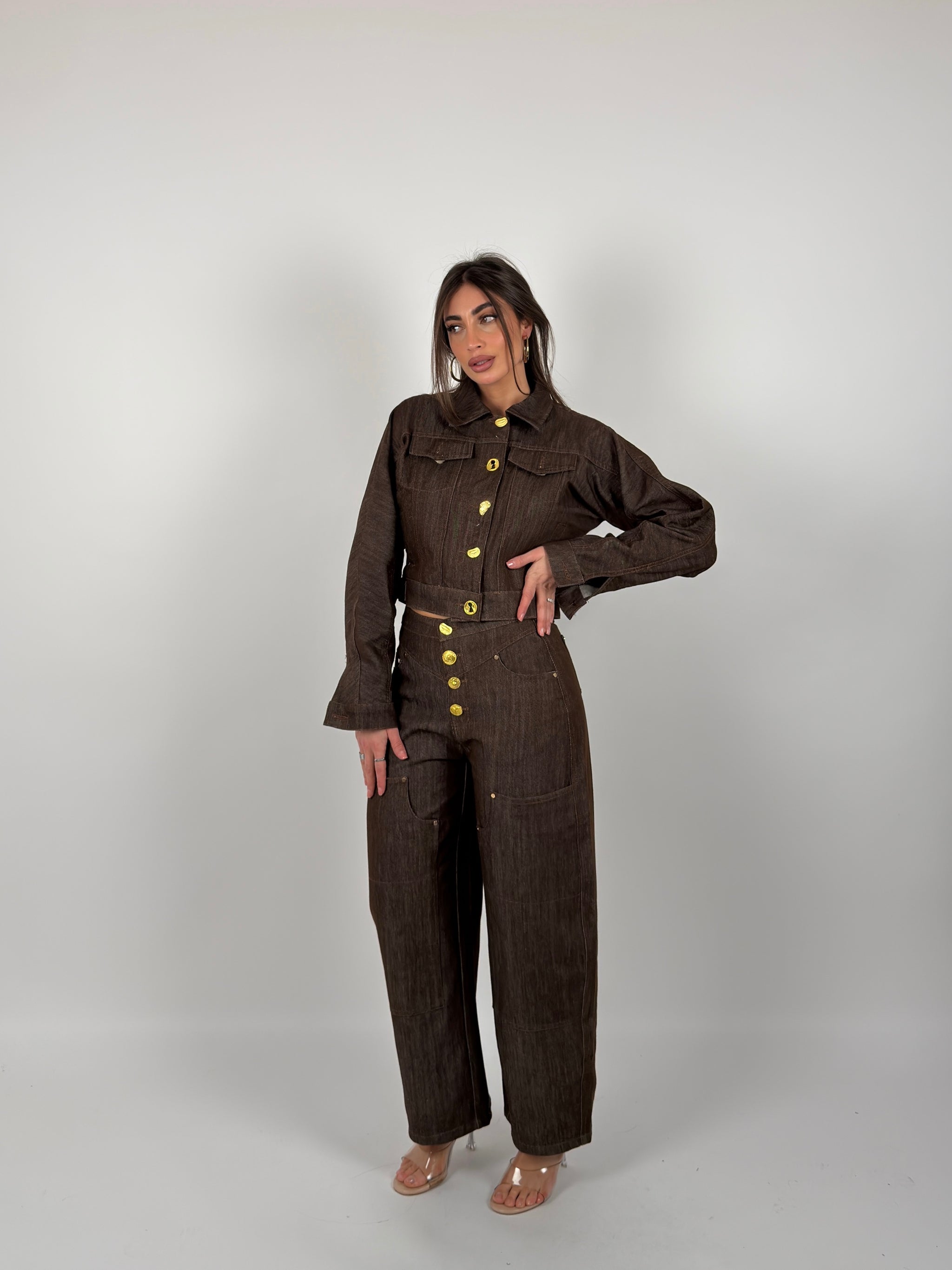 Completo di jeans composto da camicia con bottoni sul davanti, leggermente crop, jeans modello ballon carpenter, dettaglio bottoni dorati sul davanti. Tessuto fermo non elastico.
